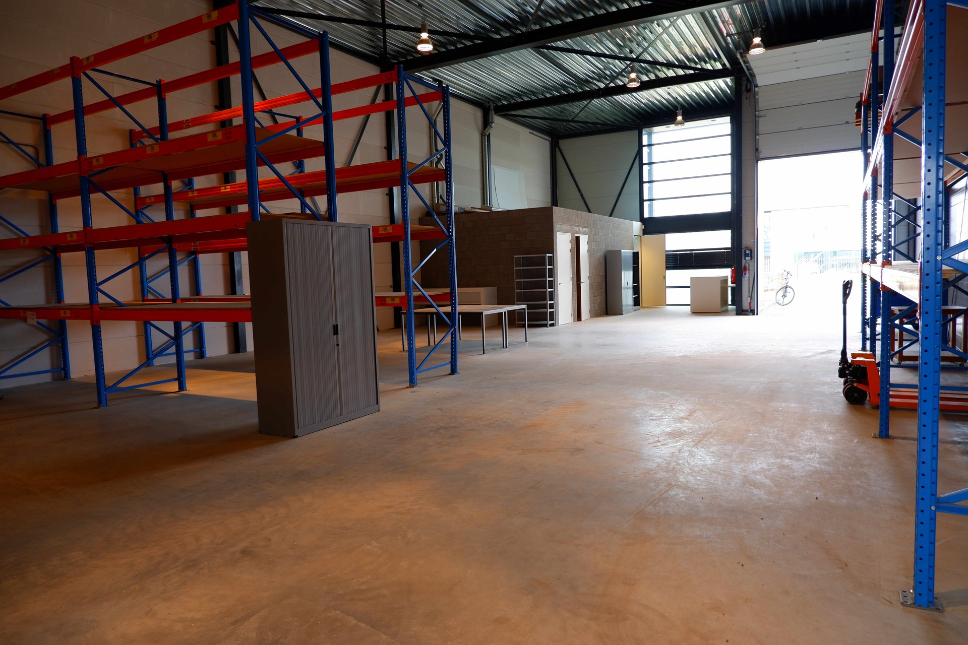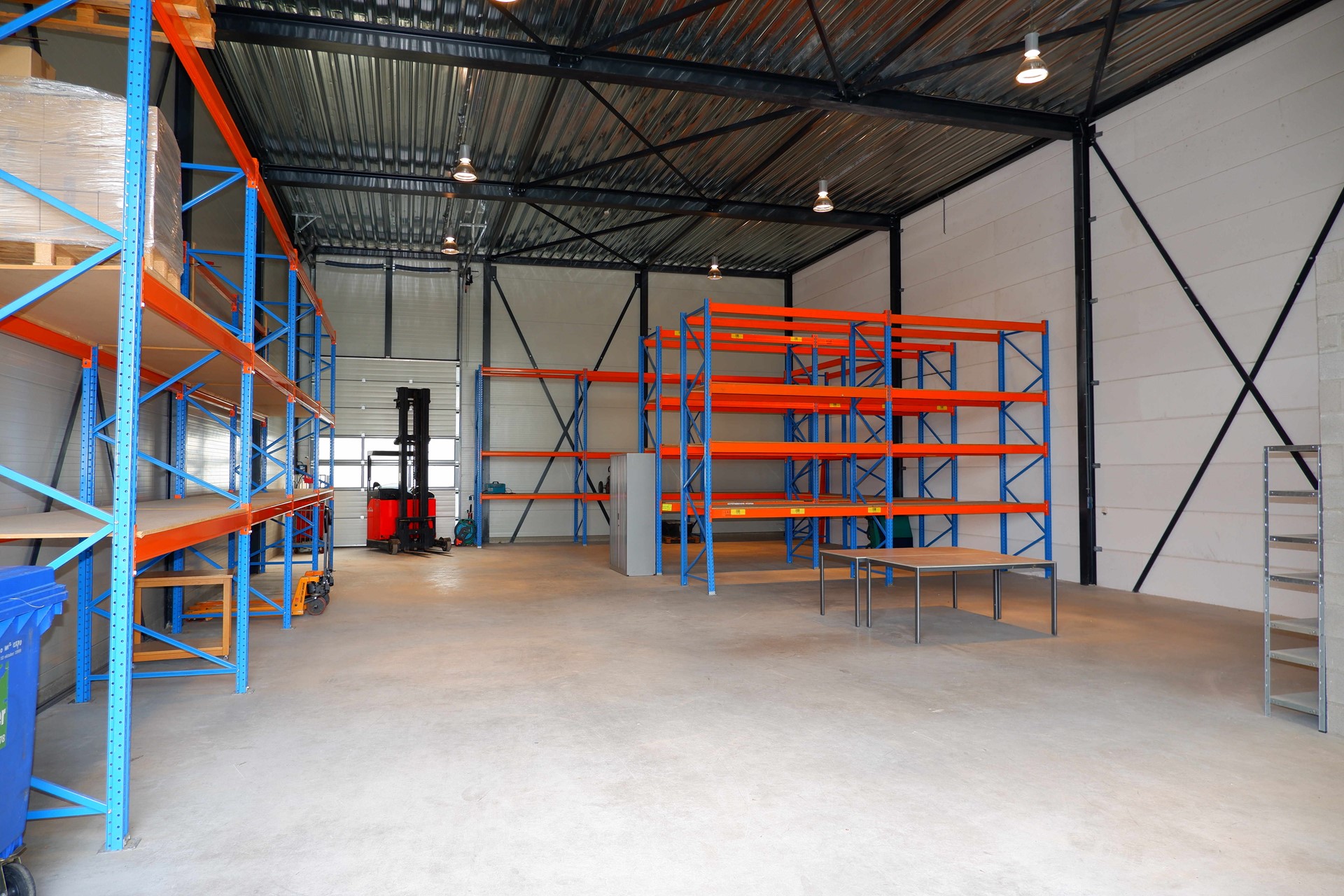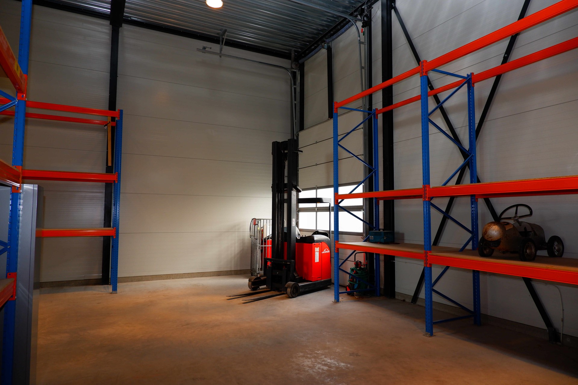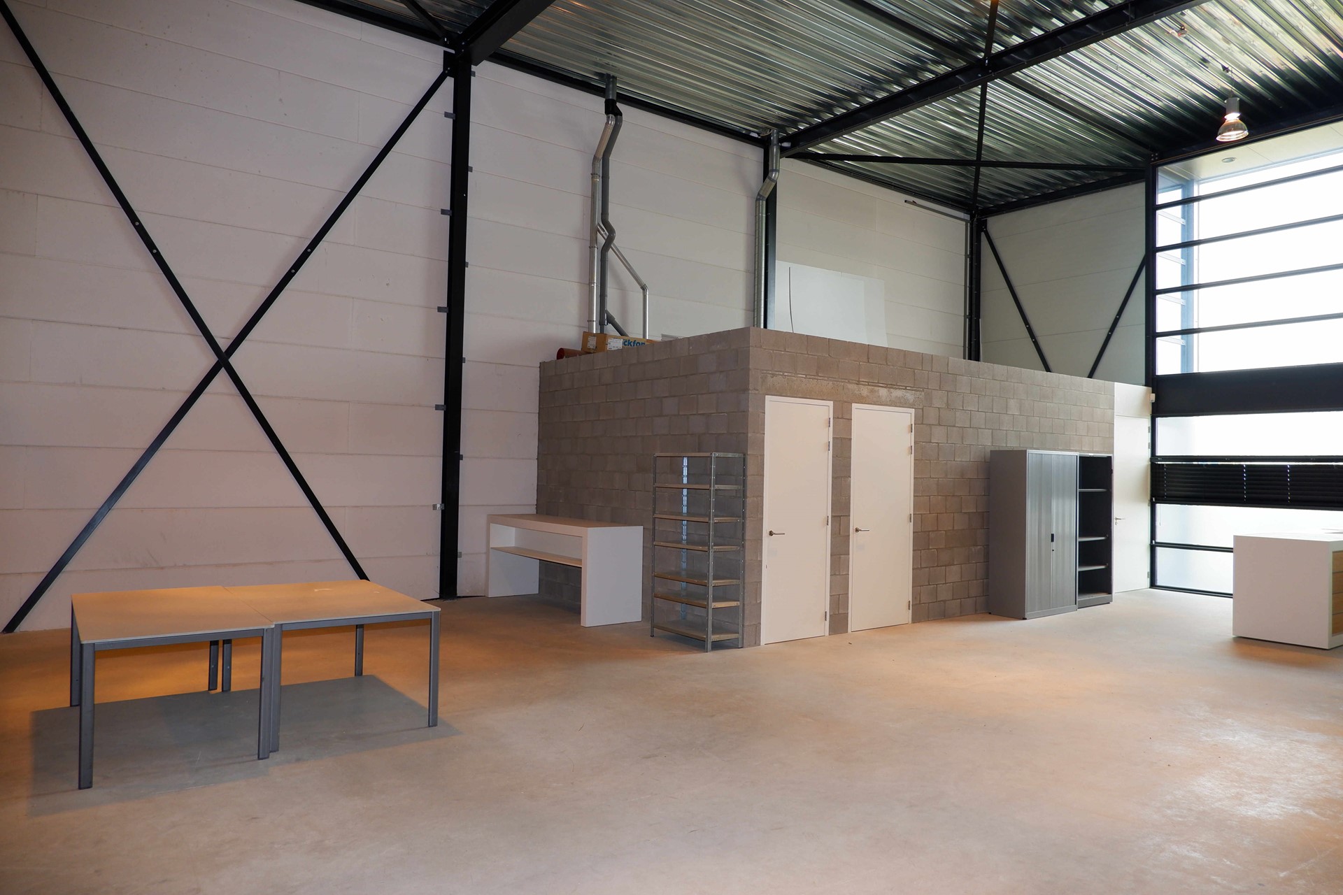 Aan de linkerzijde ligt een hoge bedrijfshal met aan zowel de voor- als achterzijde een hoge sectionaaldeur. Oppervlakte ca. 260 m2, met een apart toilet en een kleine zolderverdieping/magazijnruimte (entresol). De hal heeft een gevlinderde betonvloer (vloerverwarming) geïsoleerde wanden en dak. Via de bestrate oprit aan de linkerzijde is het bestrate terrein aan de achterzijde bereikbaar, waar de hal ook via een overheaddeur toegankelijk is.