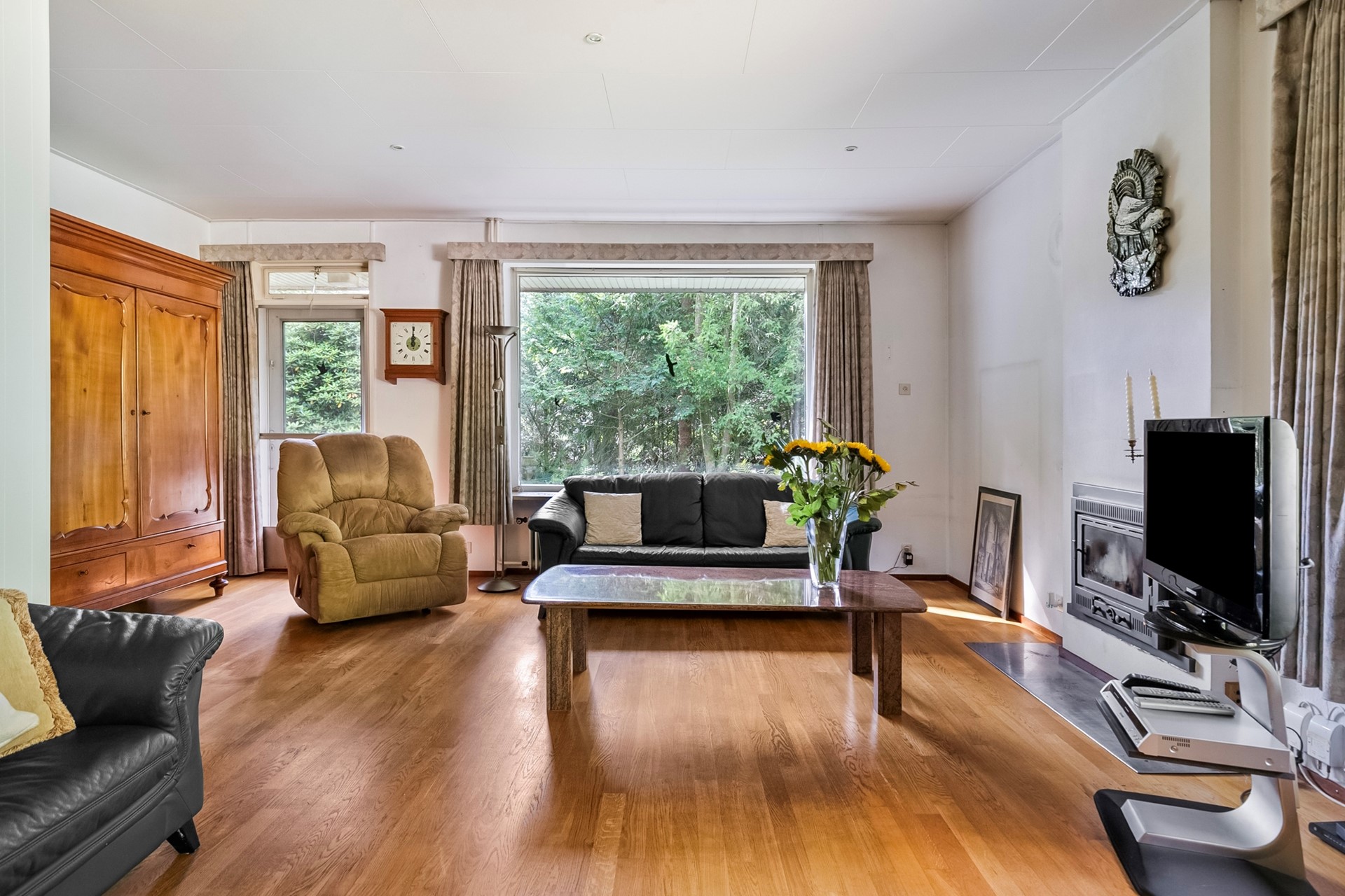 De L-vormige woonkamer is voorzien van een eiken parketvloer, grotendeels behangen wanden en één wand bekleed met schroten en een Agnes platenplafond met inbouwspots. Met een sfeervolle kachel en veel daglicht middels een tweetal grote hardhouten raamkozijnen met dubbele beglazing. Vanuit de woonkamer middels een terrasdeur toegang tot de tuin. Vanuit de woonkamer een heerlijk rustgevend zicht op het terras en de tuin.