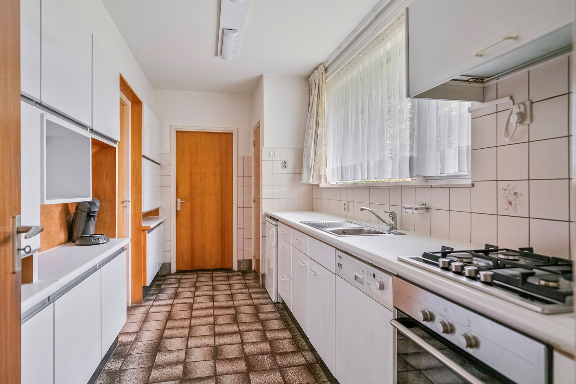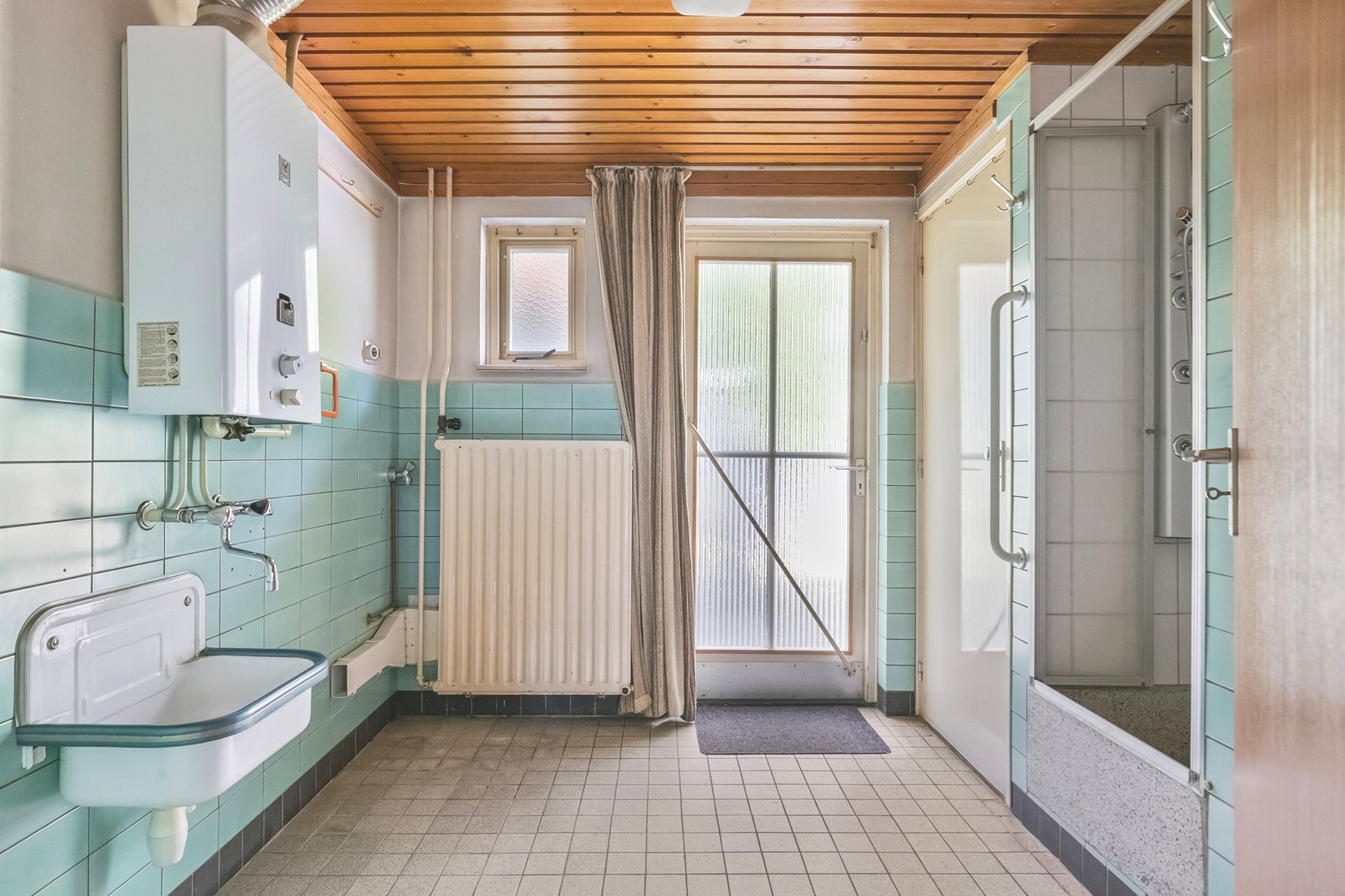De bijkeuken is voorzien van een tegelvloer, gedeeltelijk betegelde wanden en een schrotenplafond. Hier bevindt zich de aansluiting voor de wasapparatuur, een uitstortgootsteen en de badgeiser. Met o.a. een kleine doucheruimte en een diepe muurkast. Via een hardhouten terrasdeur, met voorzetglas, naar de tuin.