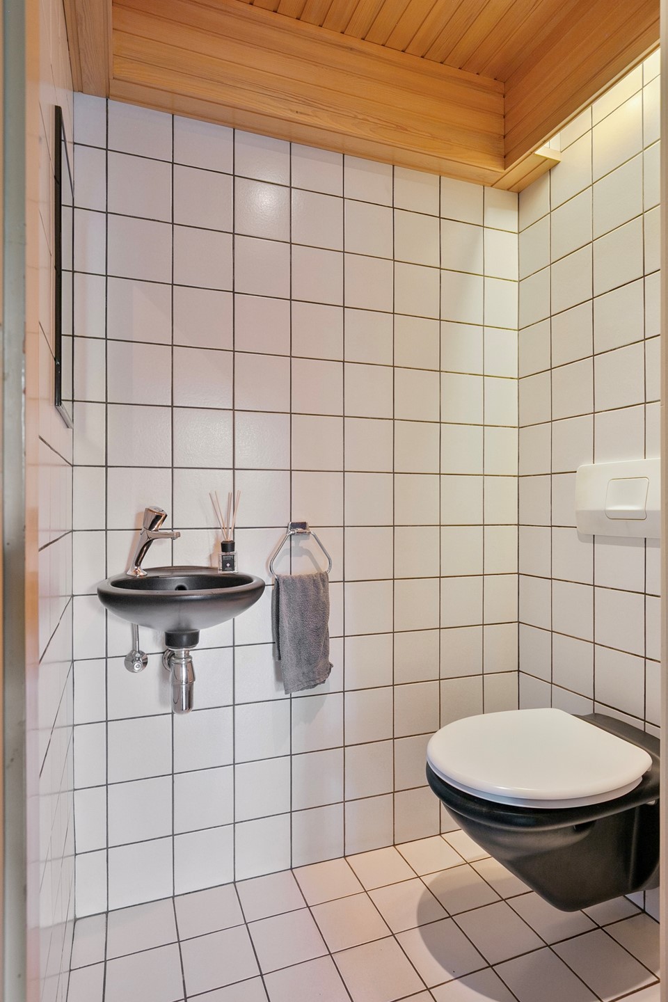 Het toilet heeft een tegelvloer, volledig betegelde wanden en een schroten plafond. Voorzien van een wandcloset, een fonteintje en mechanische ventilatie.