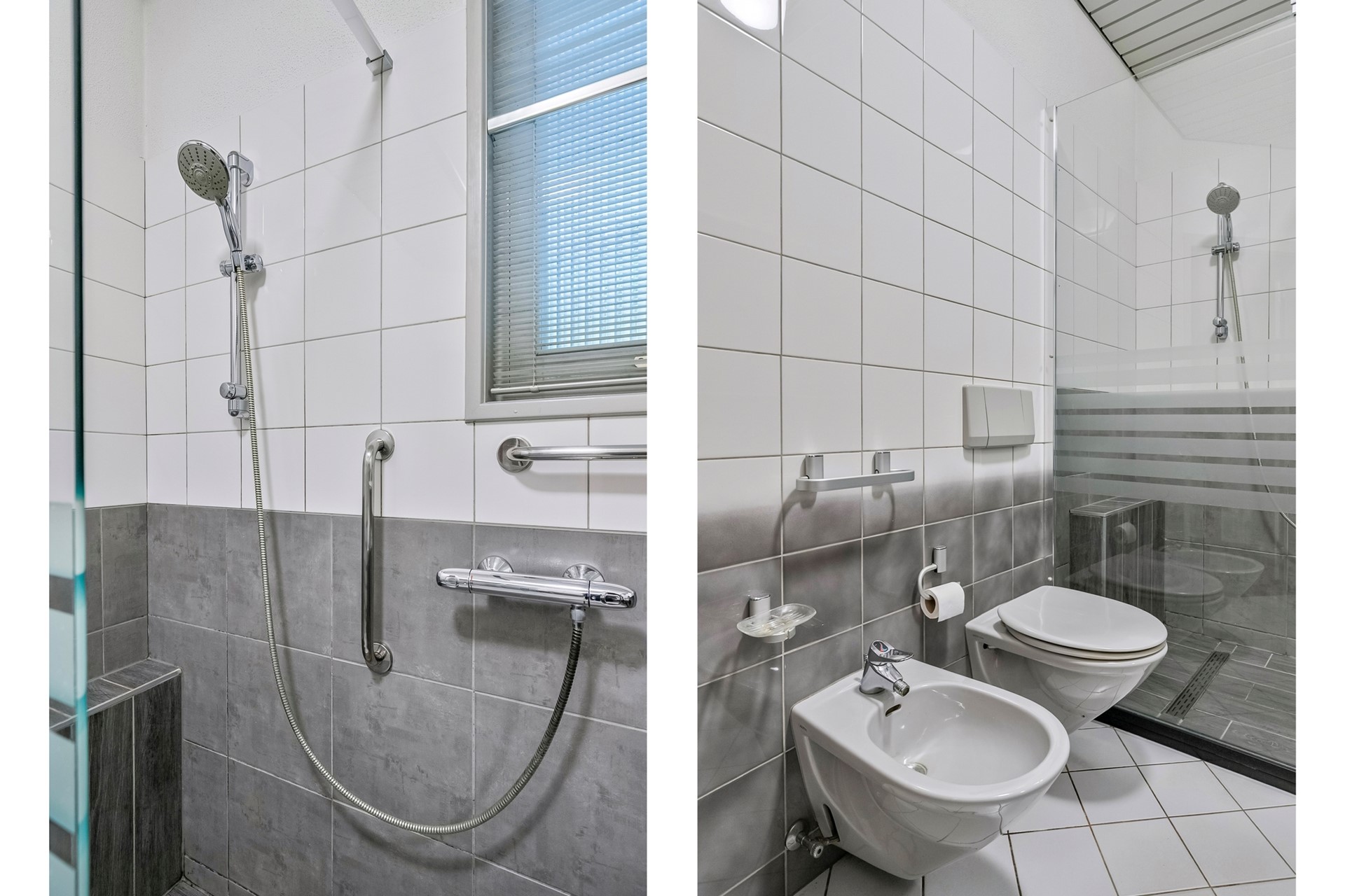 De badkamer heeft een tegelvloer, grotendeels betegelde wanden en een schrotenplafond. Voorzien van een bidet, een wandcloset, een inloopdouche met thermostaatkraan en een glazenwand, een wastafel met sifonkap en een spiegelkast. Er is zowel mechanische- als natuurlijke ventilatie aanwezig middels een raampje.