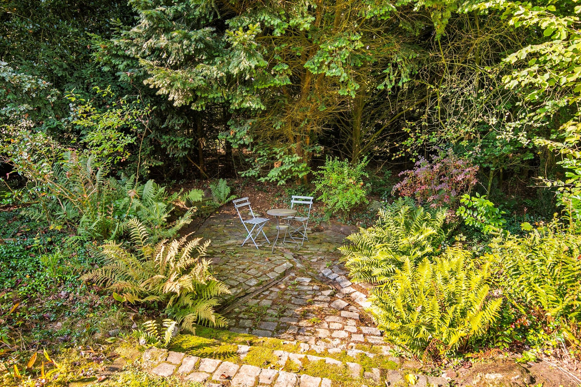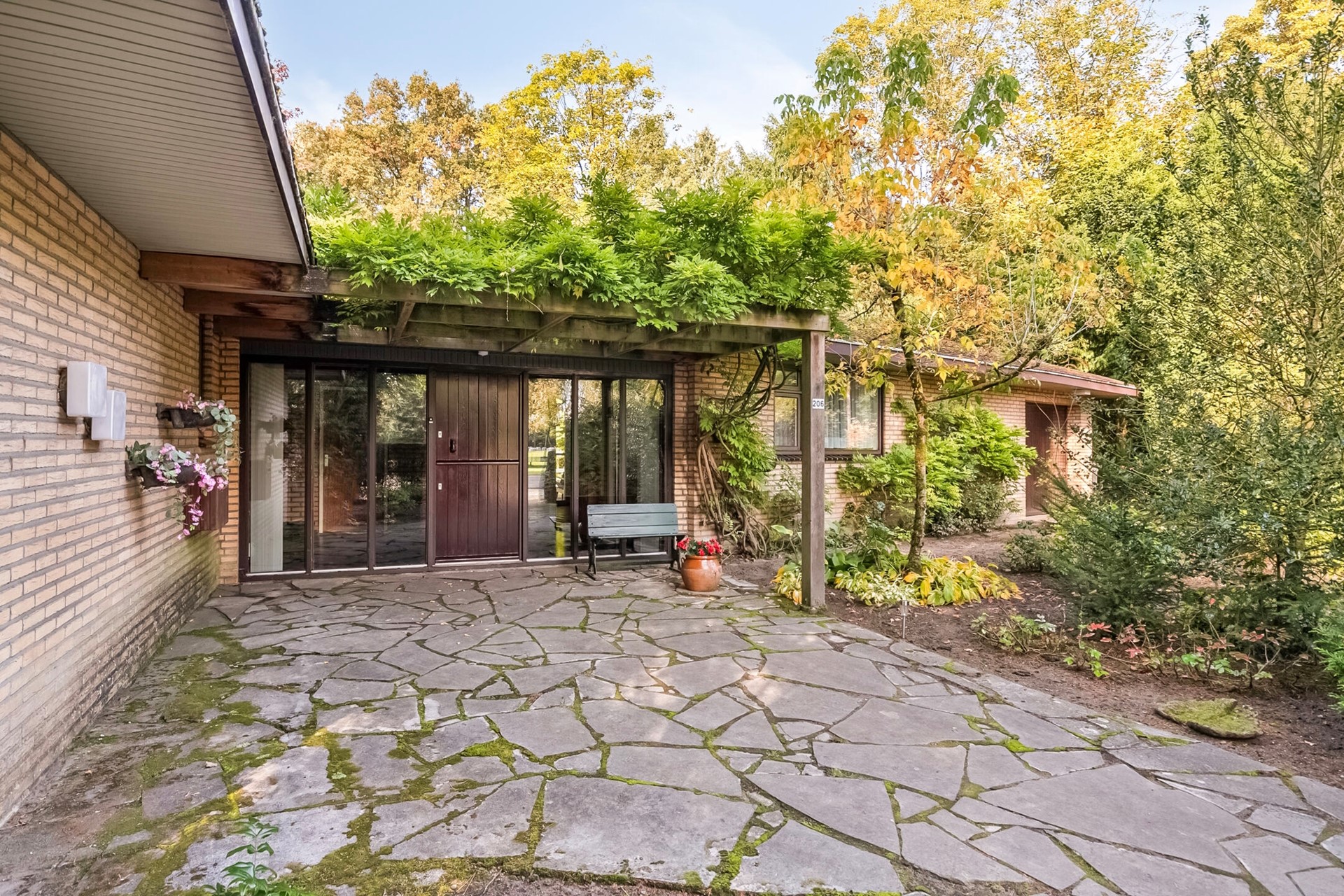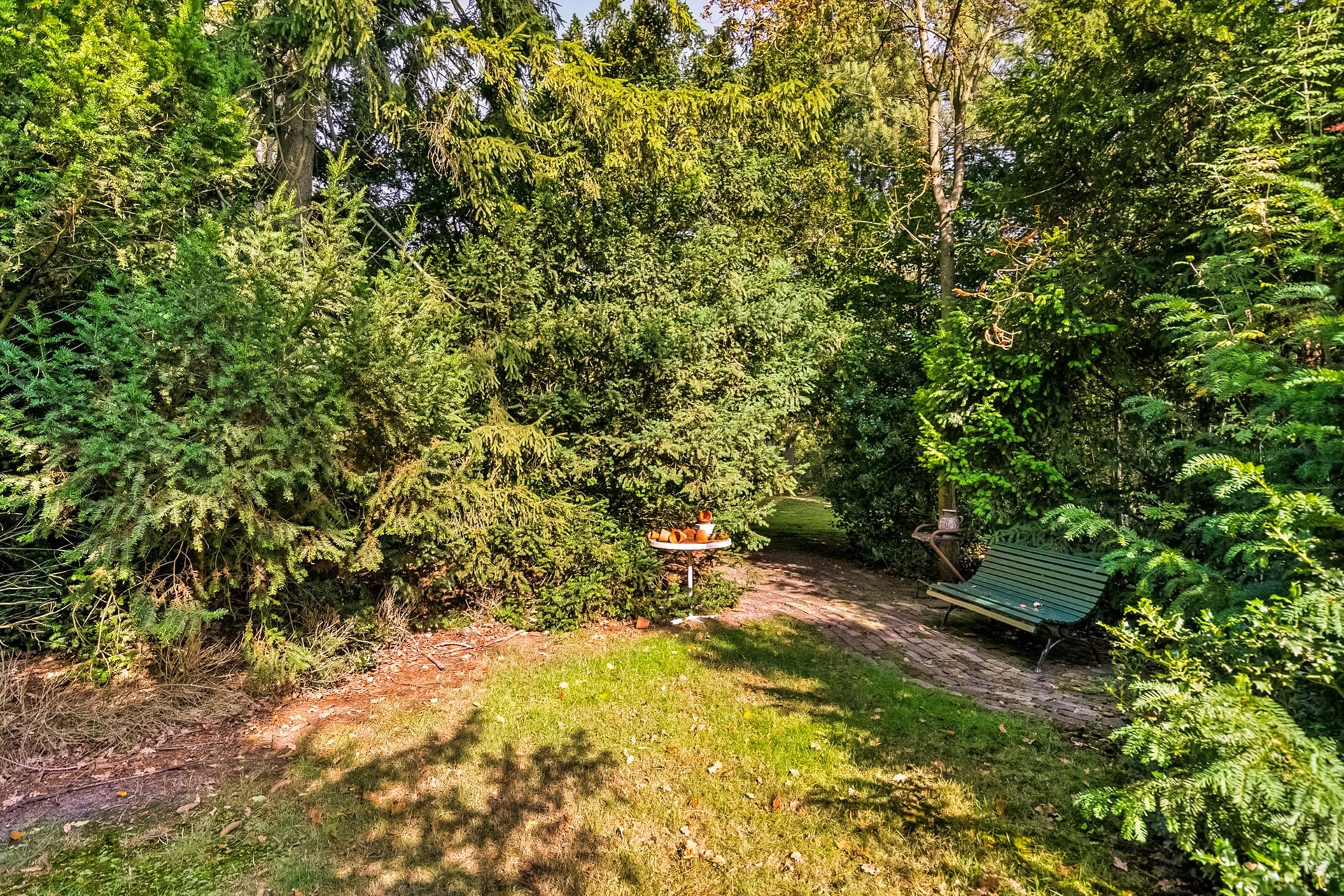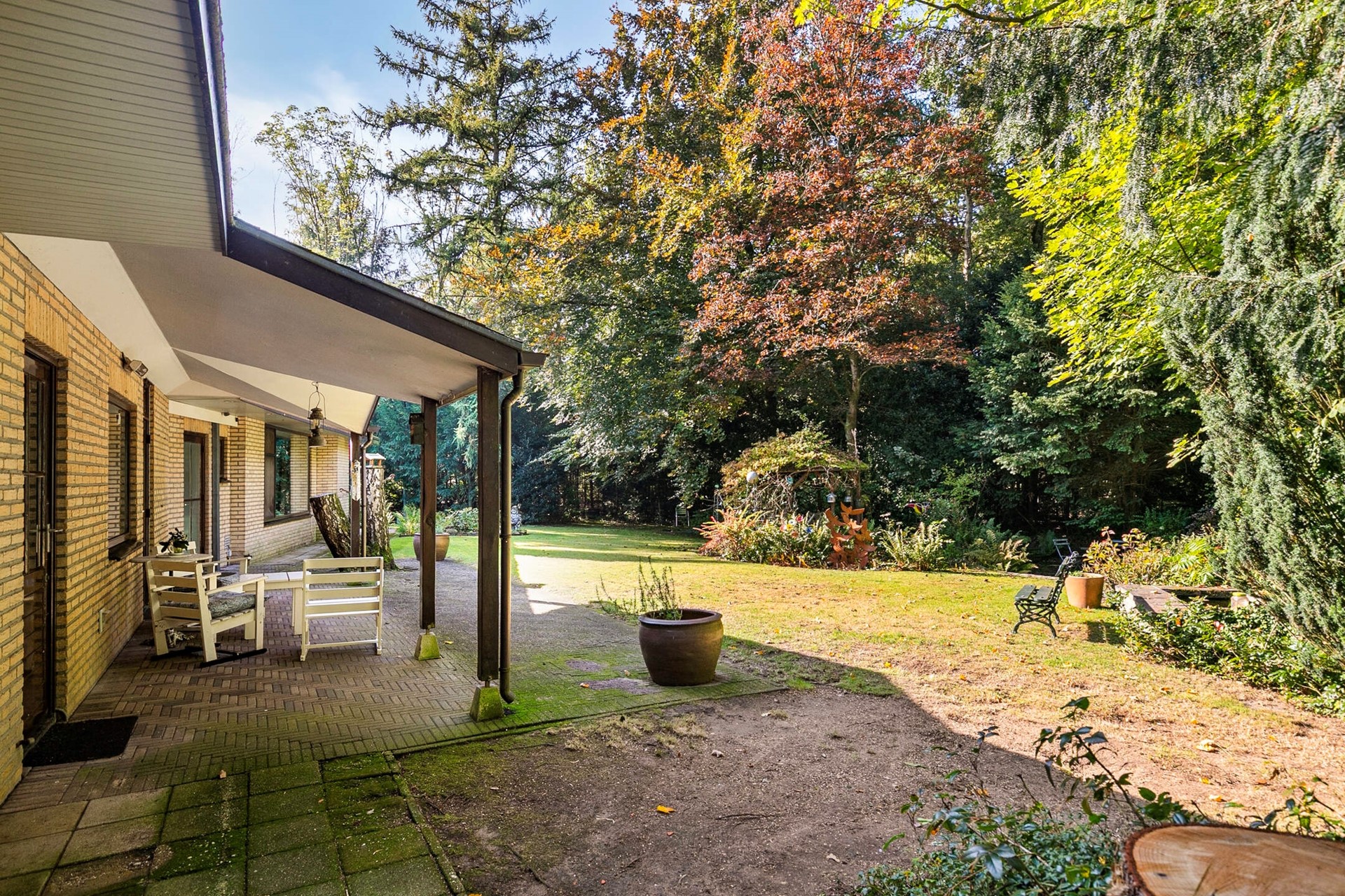 De voortuin is voorzien van volwassen beplanting en via een pad met plavuizen naar de voordeur. Aan de rechterzijde van de woning via een oprit met grind naar de garage. Aan de achterzijde van de woning, grenzend aan de eetkamer en de garage, bevindt zich een overdekt terrasje, waar je heerlijk kunt genieten van de rust. Rondom de woning ligt een tuin c.q. bos met diverse zitjes, een zitkuil en diverse bospaadjes. De woning is gelegen in een bosrijke omgeving!