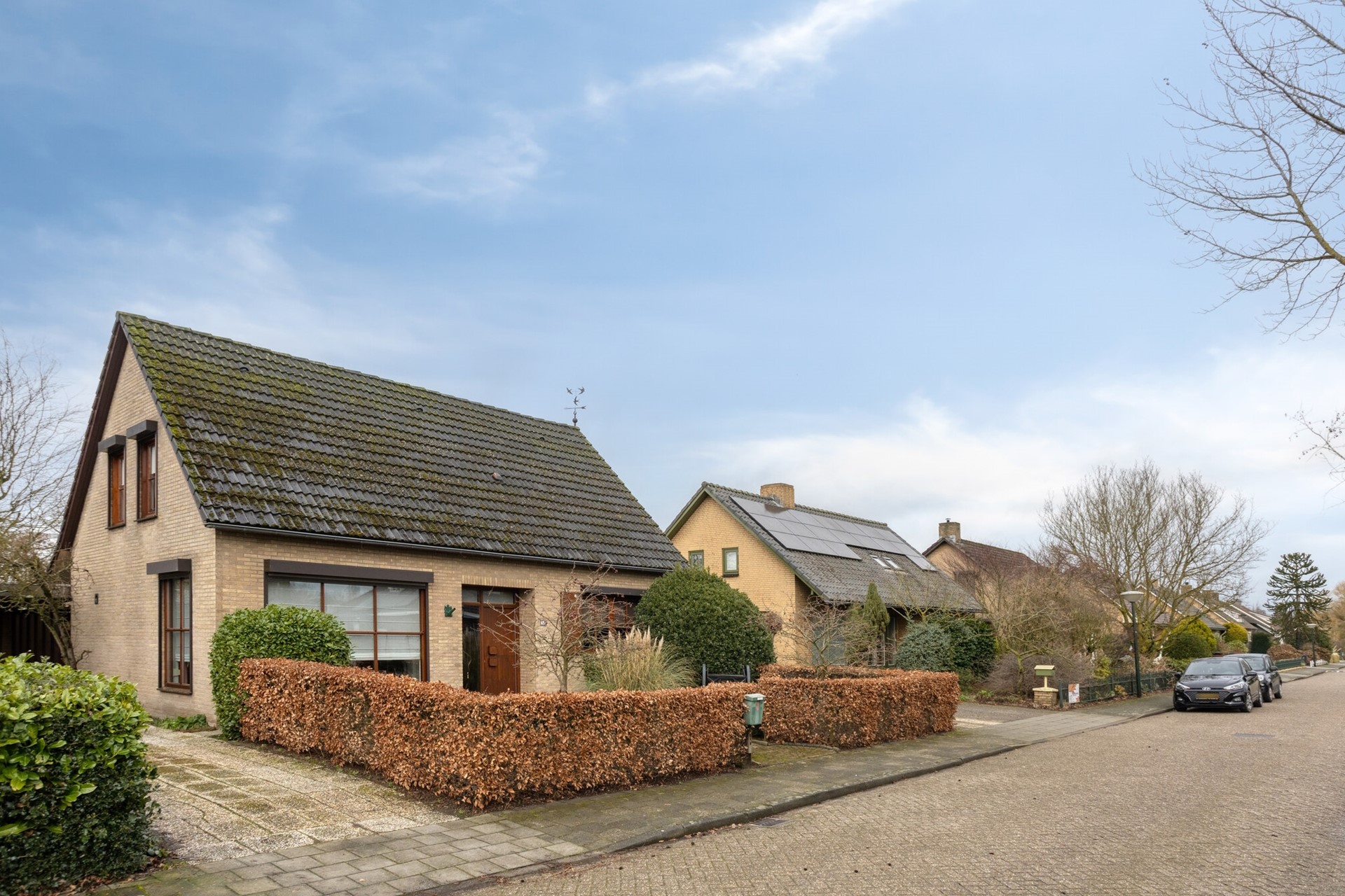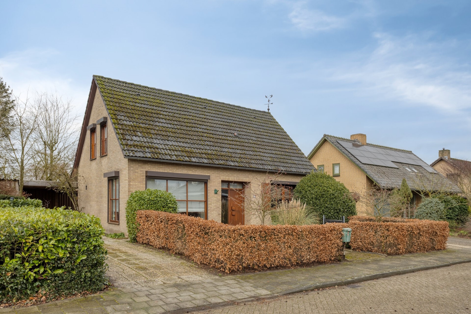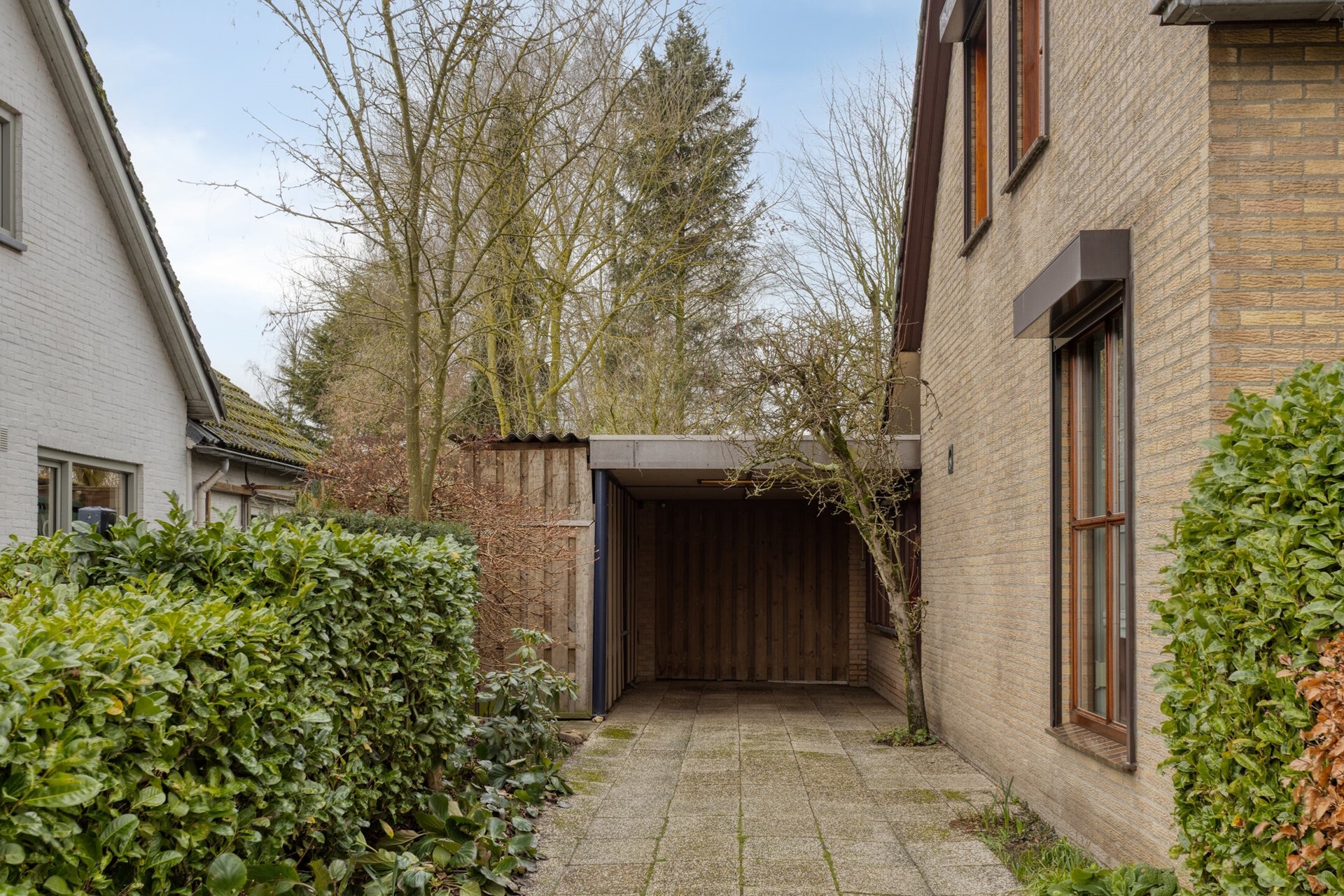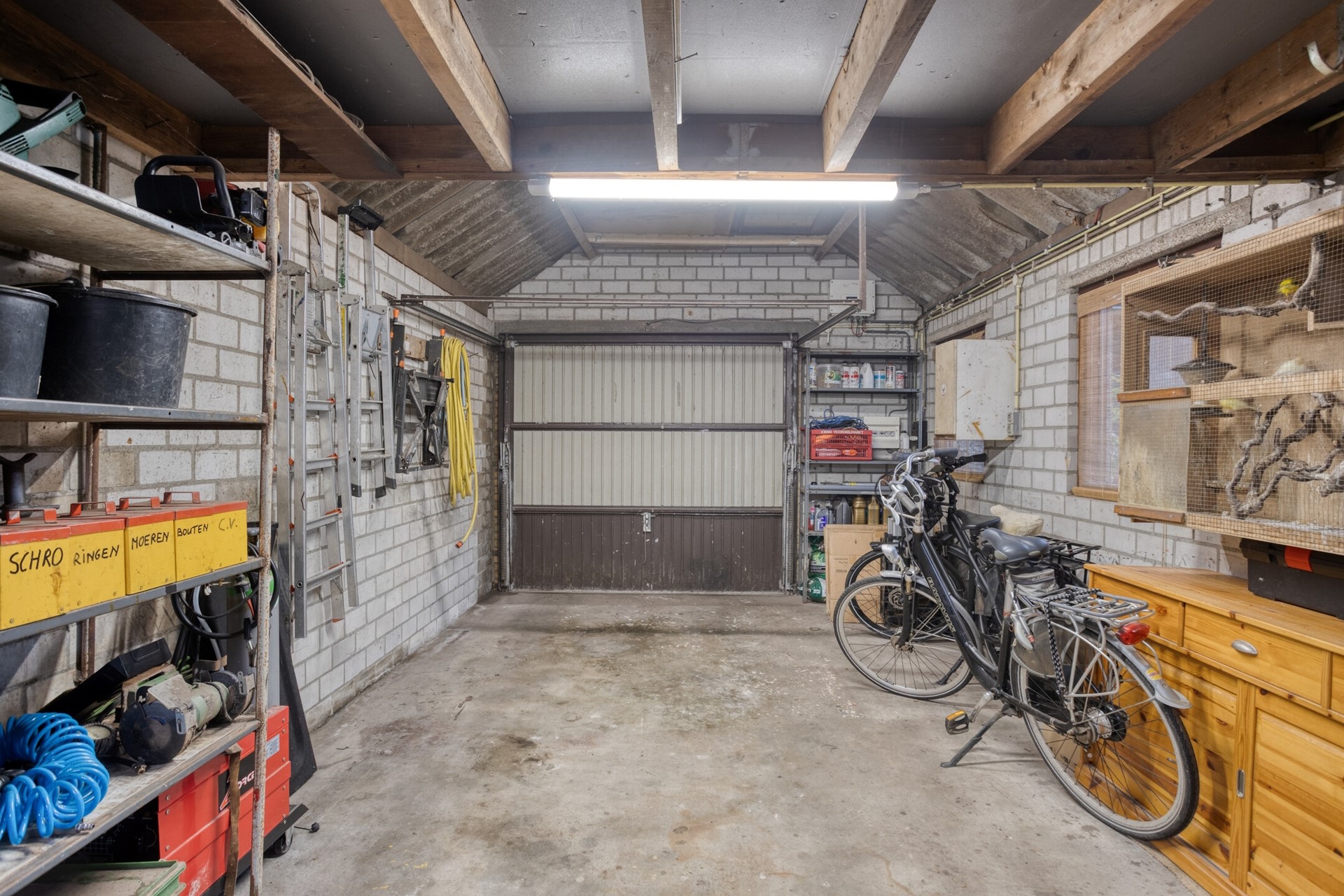 Aan de rechterzijde van de woning via een diepe bestrate oprit naar de garage, welke bereikbaar is middels een stalen kantelpoort. Met een betonvloer, spouwmuren en een zadeldak met golfplaten gedekt. O.a. een gedeeltelijke bergzolder en de 'SolarEdge' omvormer t.b.v. een 12-tal zonnepanelen (2017; 3.300 Wp). Aan de linkerzijde van de woning bevindt zich een 2e diepe, bestrate oprit naar een carport. Achter de carport bevindt zich nog een overdekte stalling. Aan beide zijden van de woning is er een afsluitbare poort.