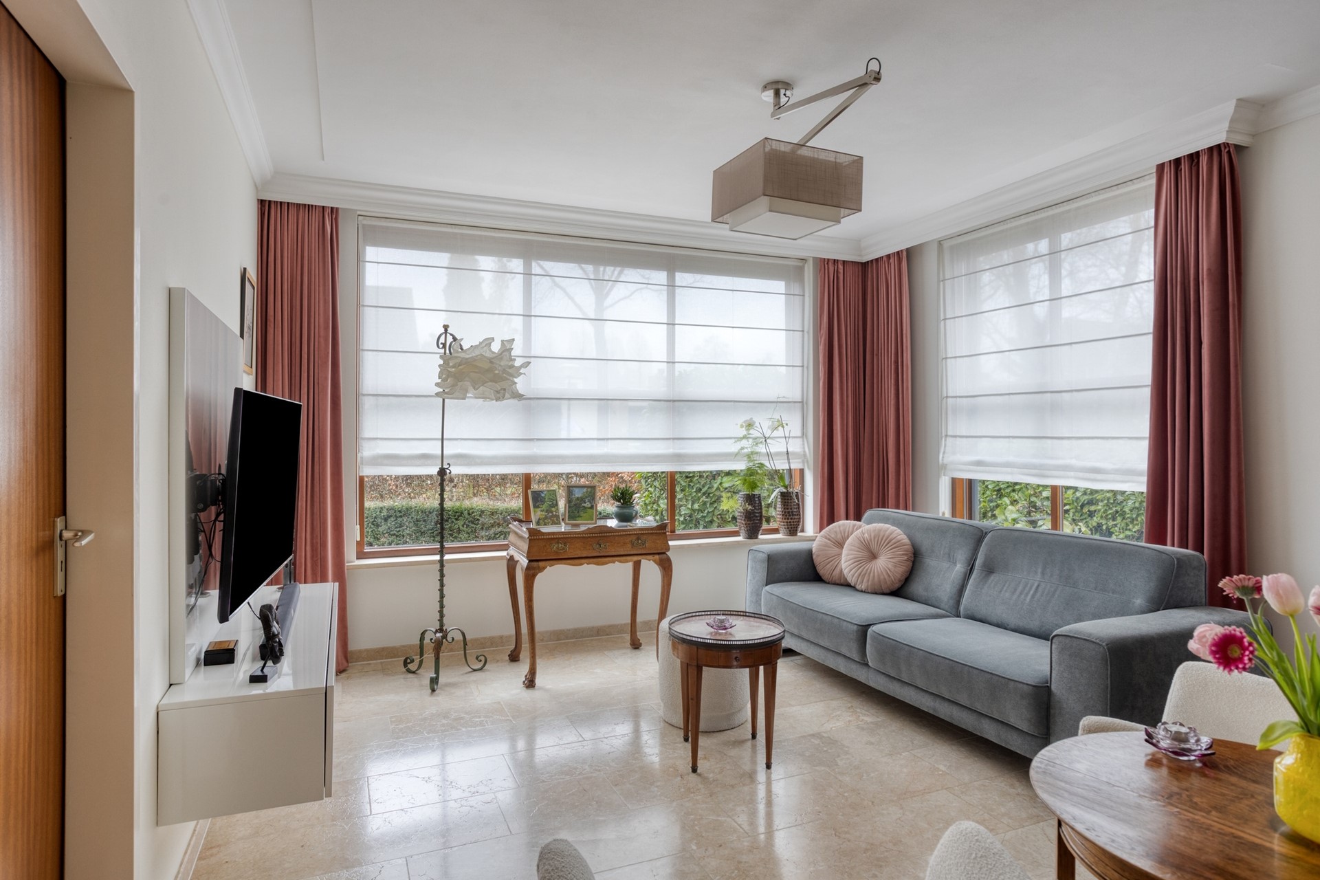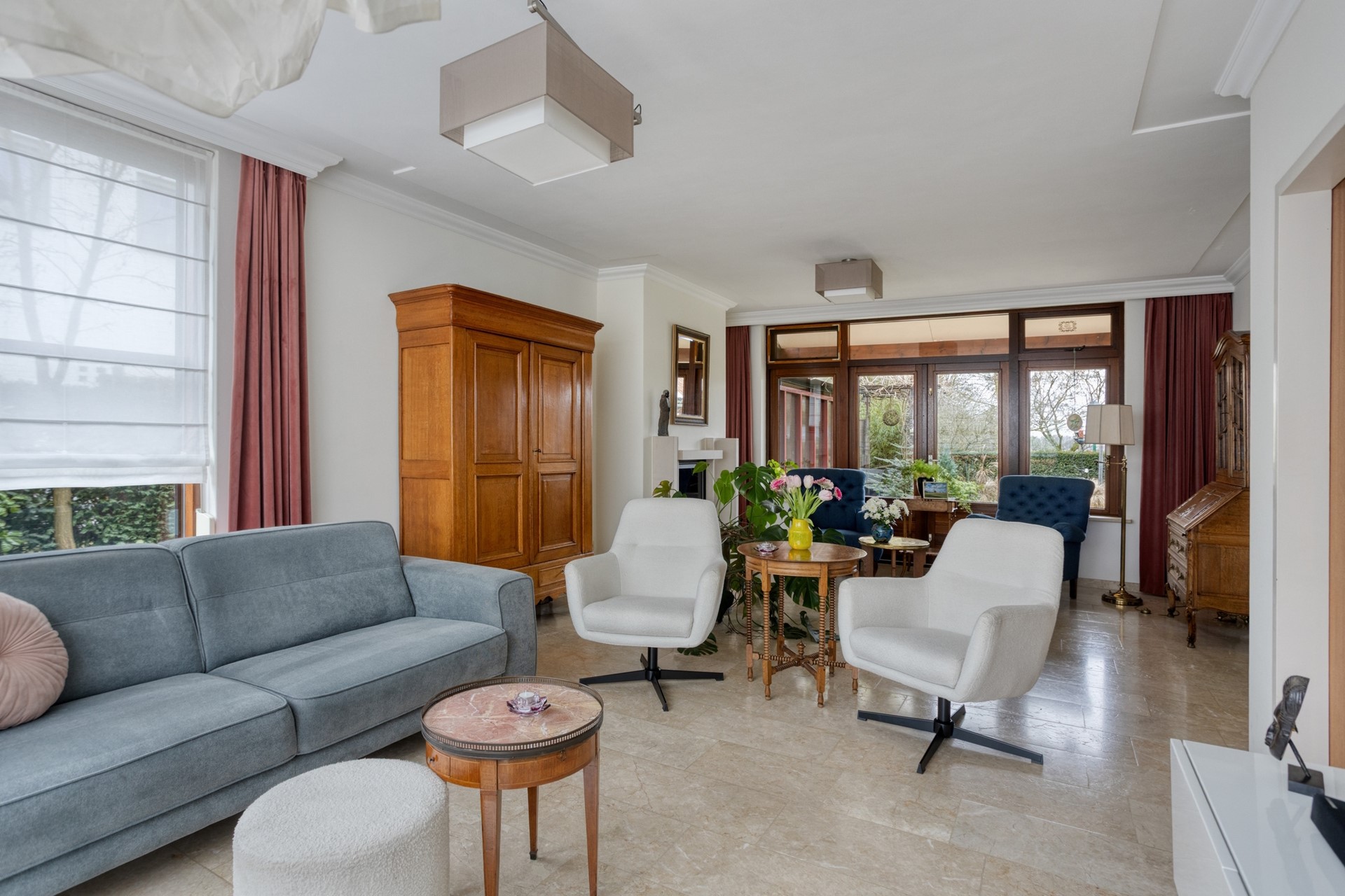 Vanuit de entree naar de ruime woonkamer, met een marmeren tegelvloer met vloerverwarming, stucwerk wanden en -plafond met een omlijsting. Voorzien van een schouw met een sfeervolle 'Barbas' gashaard (momenteel niet bruikbaar). Aan de voorzijde is er veel daglicht aanwezig middels de hardhouten raamkozijnen met dubbele beglazing en rolluiken (voorzijde elektrisch). Aan de achterzijde via hardhouten openslaande deuren naar het deels overdekte terras, met een vrij en weids uitzicht op de achtertuin.