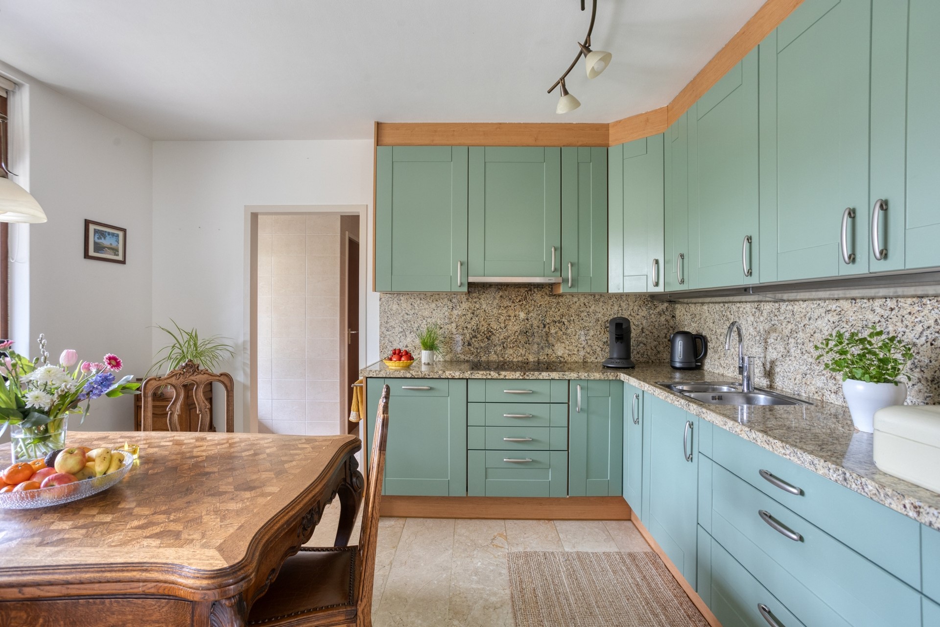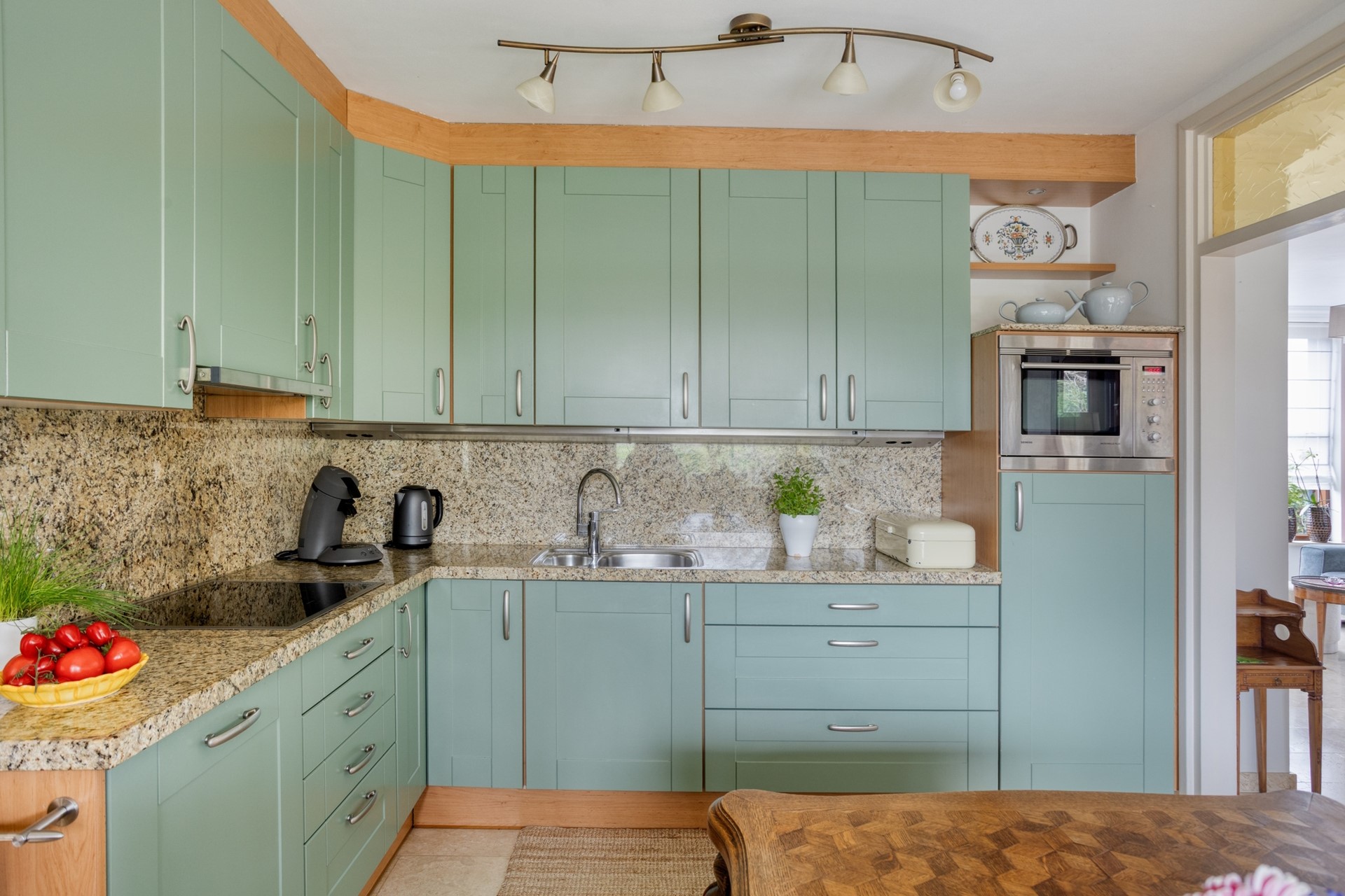 Via een brede doorgang naar de eetkeuken. Deze heeft ook een marmeren tegelvloer met vloerverwarming, stucwerk wanden en -plafond. De complete keukeninrichting in een hoekopstelling is voorzien van een granieten aanrechtblad en -achterwand, een RVS spoelbak met restbakje, een koelkast, een combimagnetron, een vaatwasser, een inductiekookplaat en een afzuigkap. Vanuit de keuken via een groot hardhouten raamkozijn met dubbele beglazing een prachtig zicht op de tuin.