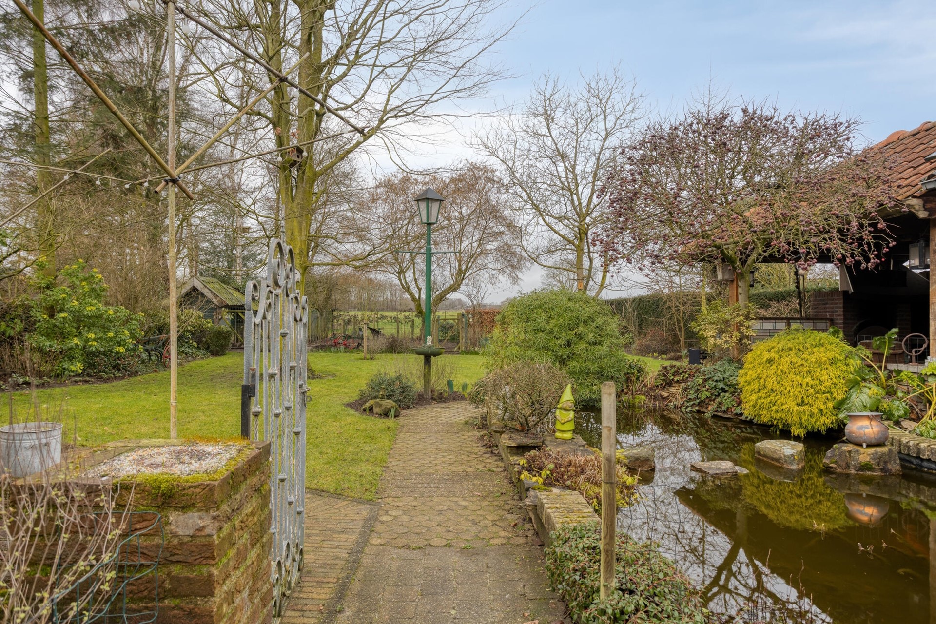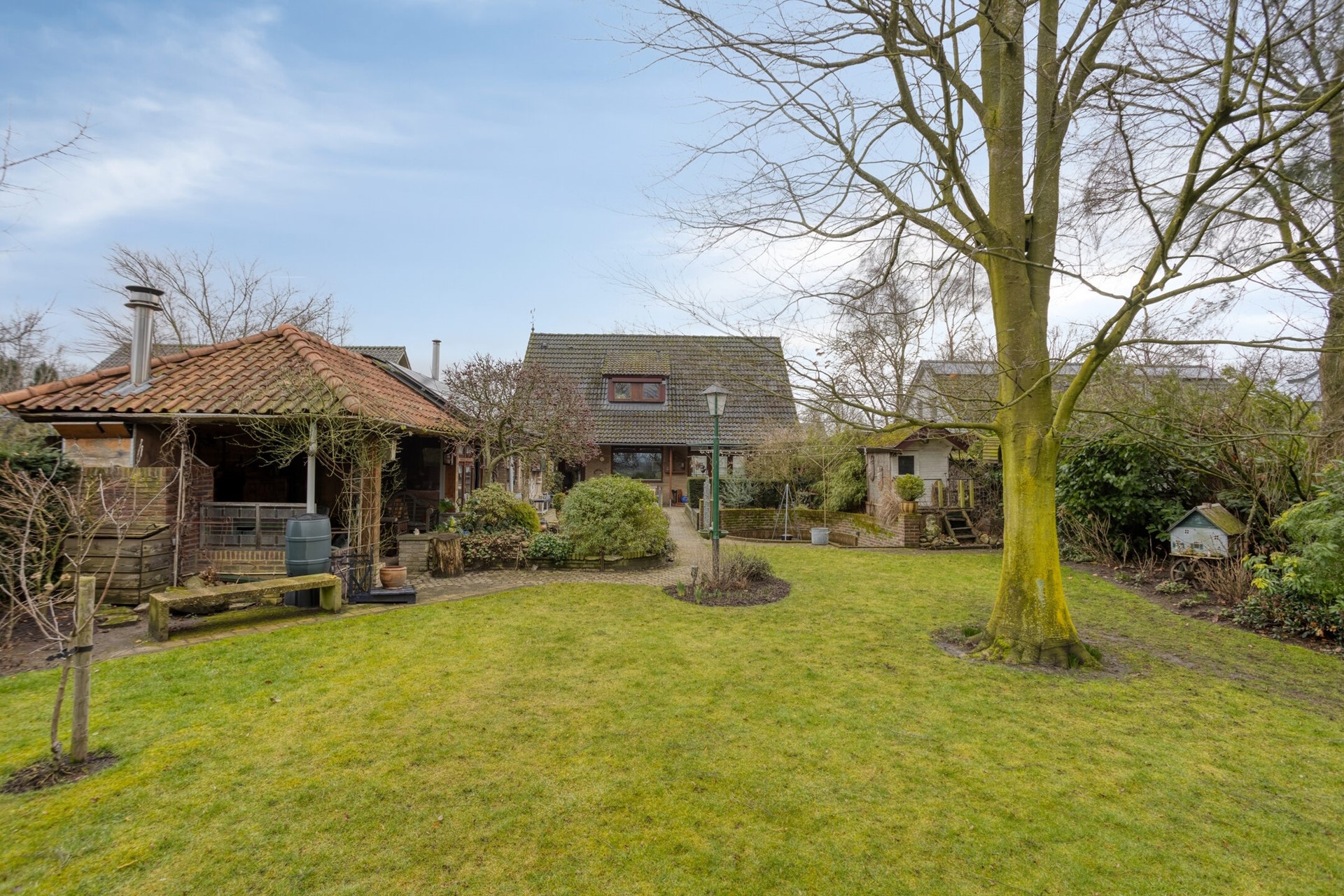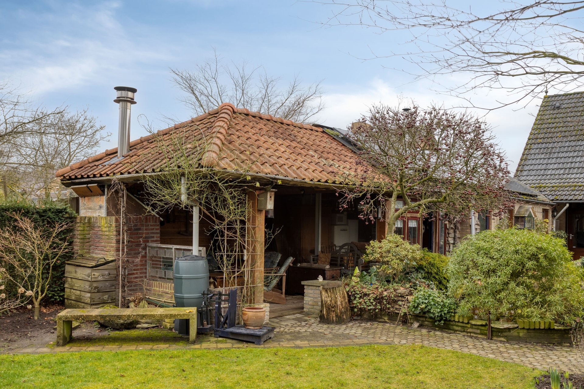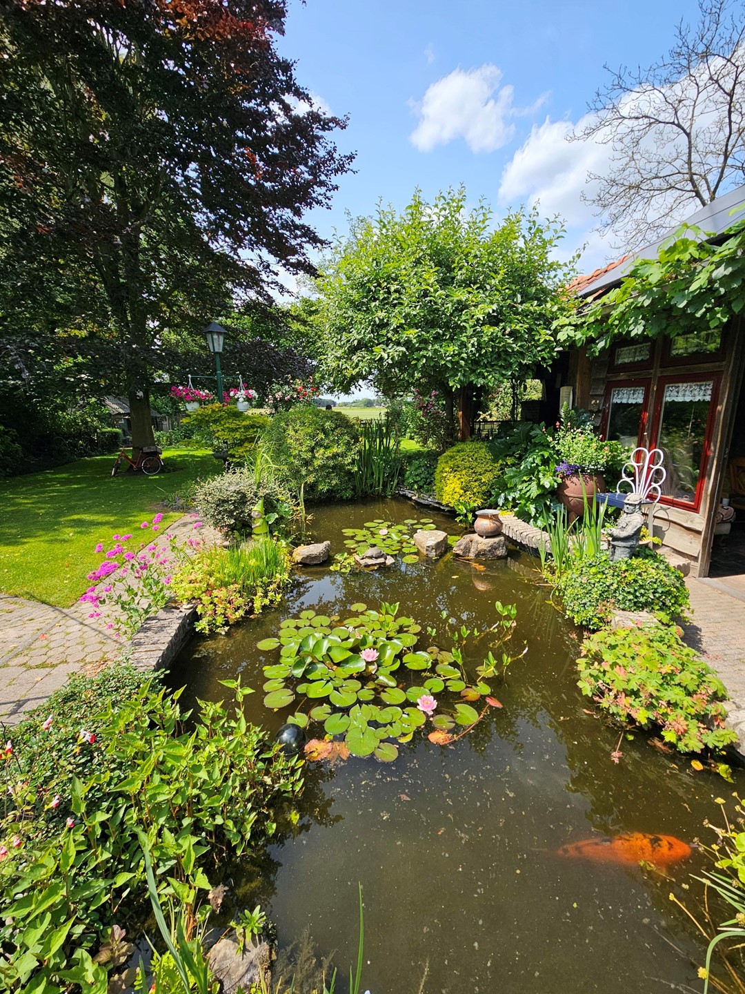 De fraai aangelegde achtertuin is volledig omheind met o.a. een overdekt terras aan de woning, een groot gazon en aangeplante borders met volwassen beplanting en (fruit)bomen (notenboom, appelboom, hazelnootboom, pruimenboom etc.). Verder o.a. een vijverpartij, een gezellige zitkuil en kippenren. Achter de garage ligt een sfeervol tuinhuis met o.a. een houtkachel en een bergzolder. Via een aluminium schuifpui naar de ruime overkapping, welke is voorzien van een vlonderterras, een openhaard, een echte pizza oven! Samen met het fantastische weidse uitzicht over weilanden, maakt het genieten hier compleet!
