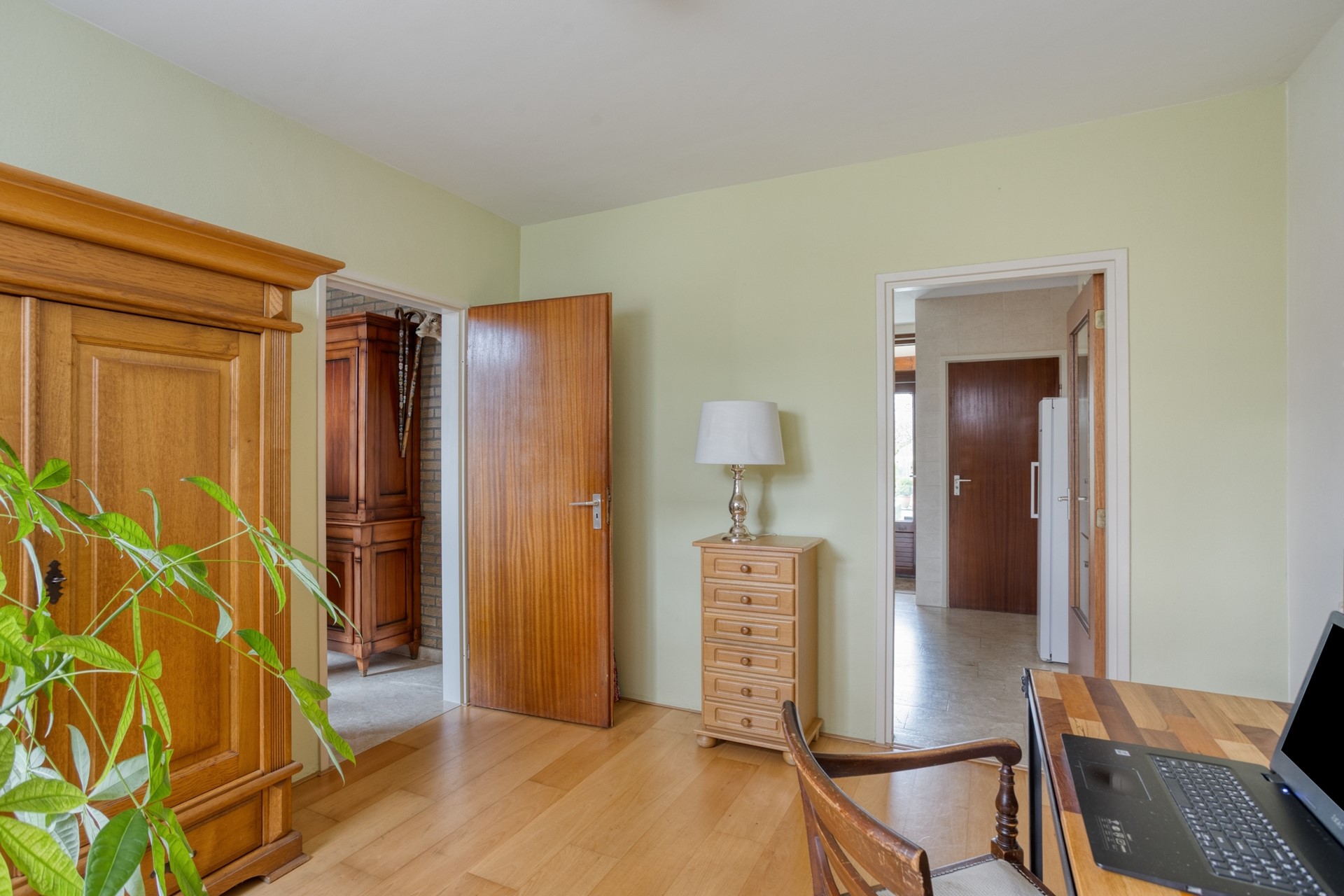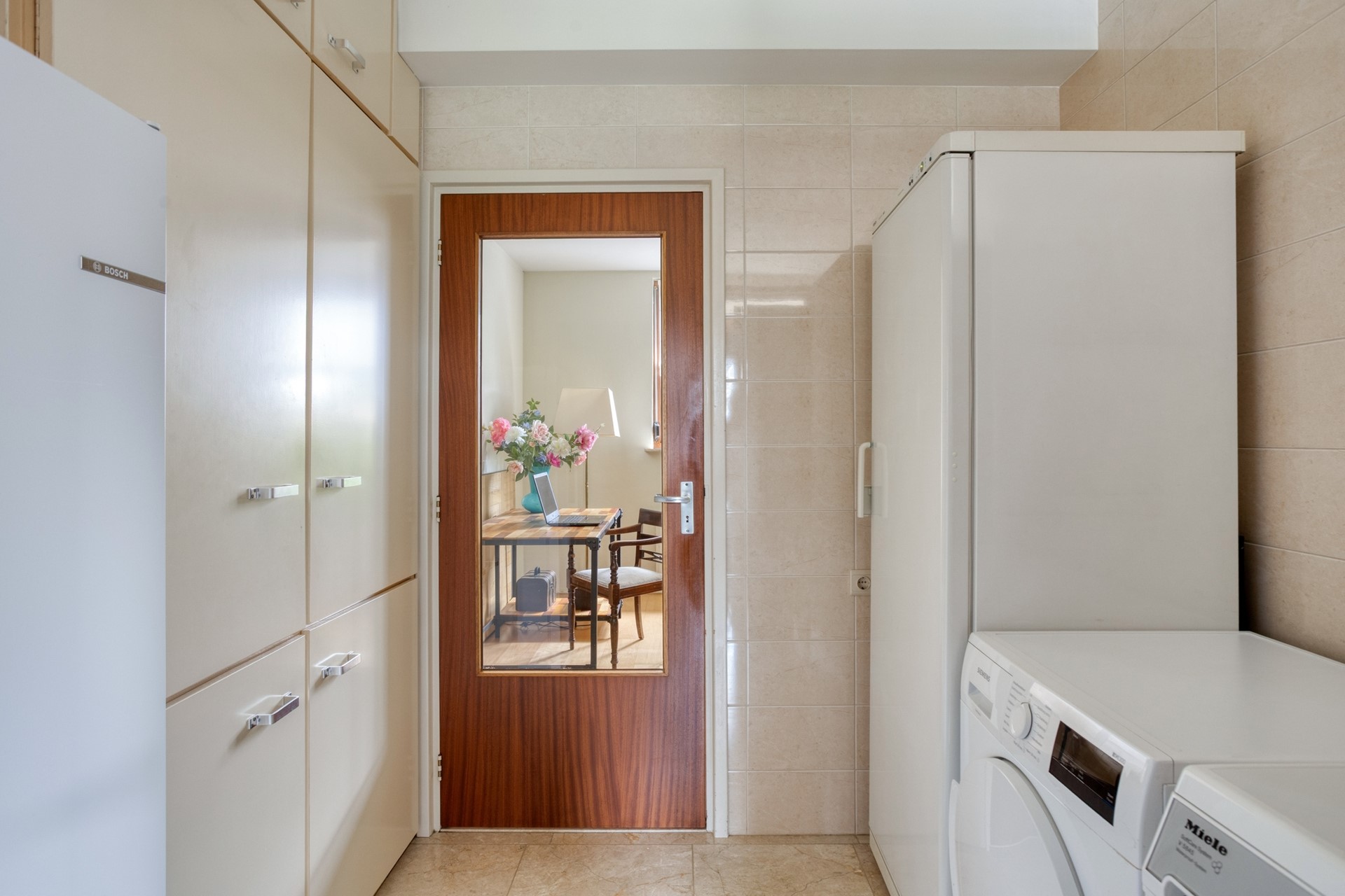Via een deur naar een volledig betegelde bijkeuken/wasruimte met toegang tot het toilet. Het volledig betegeld toilet heeft vloerverwarming en een stucwerk plafond met inbouwspots. Met een wandcloset met opzetplateau, een hoekfonteintje en een raampje. In deze ruimte bevinden zich een vaste kastenwand en de aansluitingen voor de wasapparatuur. Vanuit deze ruimte rechtstreeks toegang tot een slaap-/werkkamer, welke is gelegen aan de voorzijde. Met een laminaatvloer, stucwerk wanden en -plafond. Daglicht middels een hardhouten raamkozijn met enkele beglazing en een rolluik. Deze kamer is ook bereikbaar vanuit de entree.