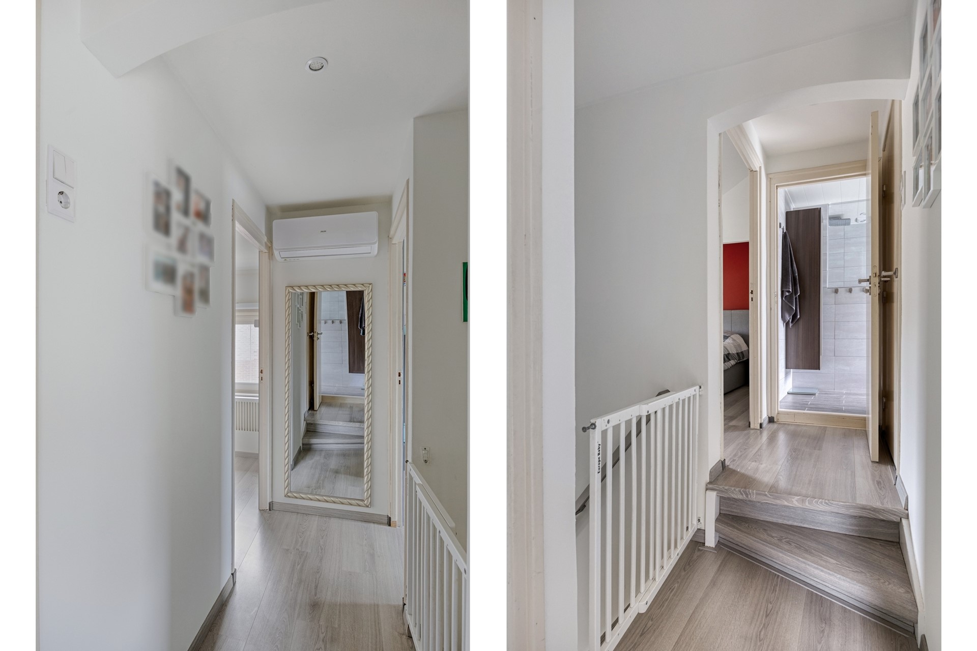 Vanuit de entree met een, met laminaat beklede, trap naar de overloop. Met een laminaatvloer, stucwerk wanden en -plafond met inbouwspots. Op de overloop bevindt zich ook een wandairco, deze kan verwarmen en koelen. Verder een inloopkleedruimte, met een tegelvloer en een kunststof raampje met vliegenhor.