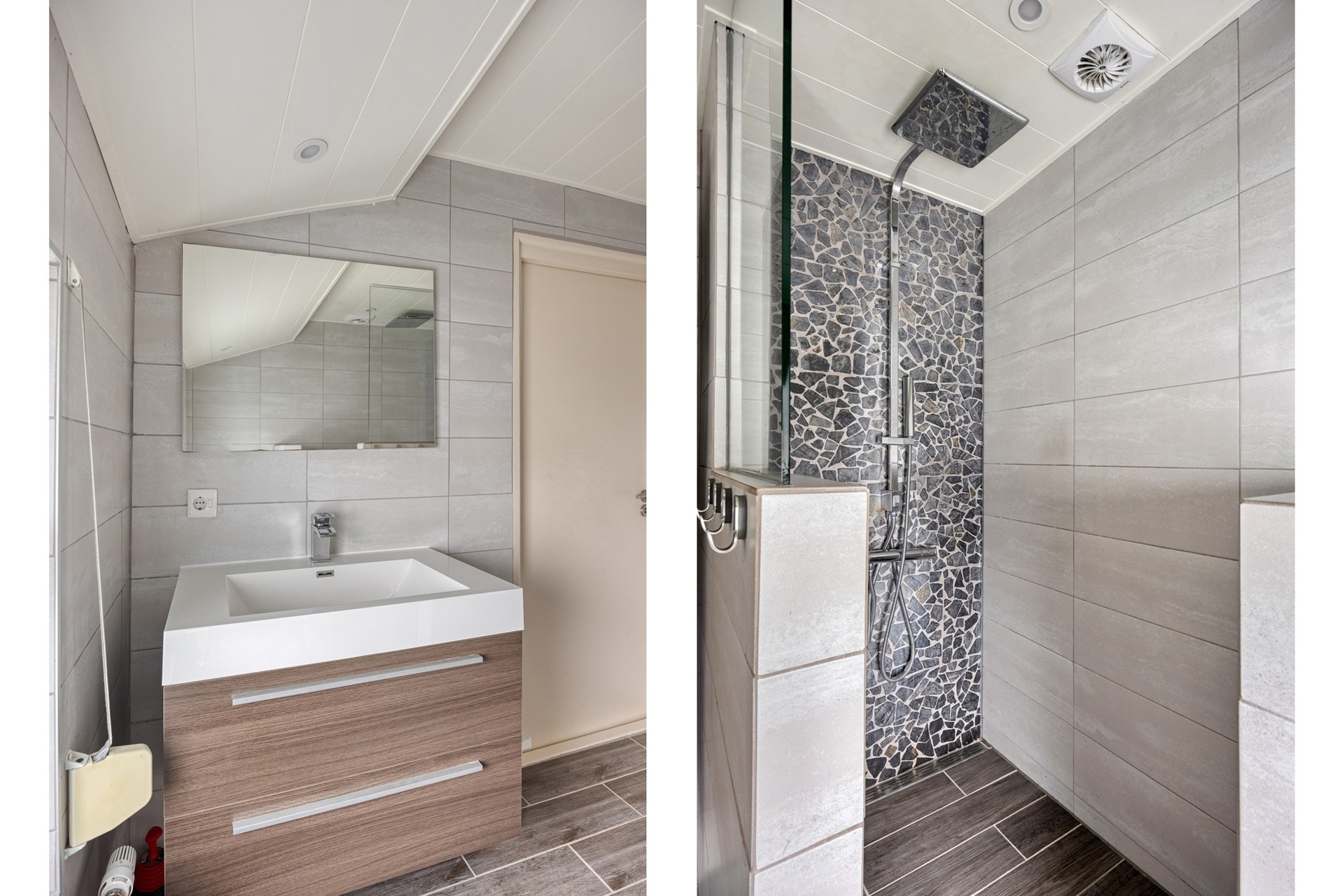 De moderne, volledig betegelde badkamer met vloerverwarming (indirect) en MDF plafond met inbouwspots, is voorzien van een badmeubel met vaste wastafel en spiegel, een inloopdouche met thermostaatkraan en regendouche en een 2e toilet (sanibroyeur). Natuurlijke ventilatie middels een kunststof raamkozijn (draai-/kiep) met HR++ melkglas en een vliegenhor.