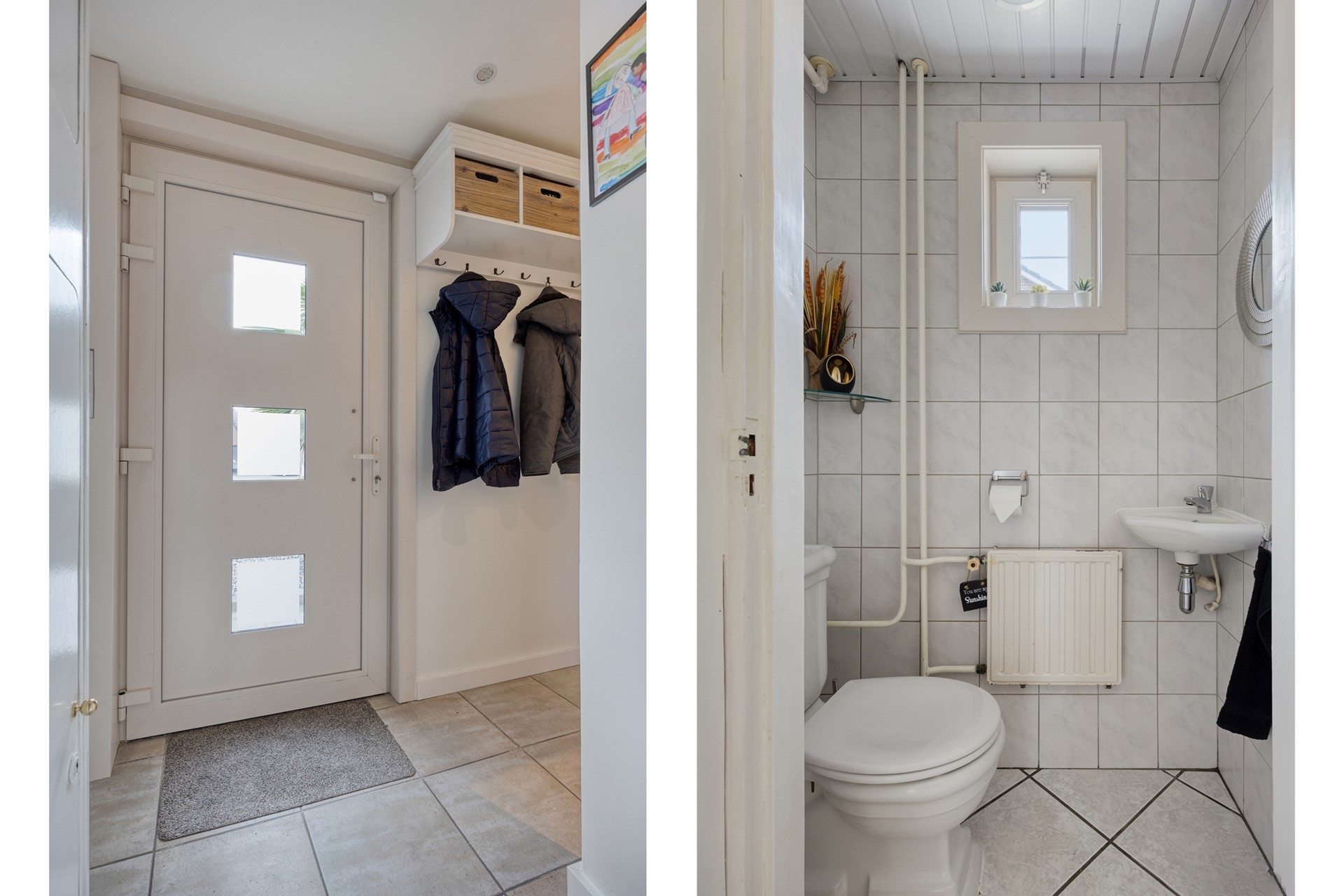 Via een kunststof voordeur met dubbel glas naar de entree, met een lichte tegelvloer, stucwerk wanden en -plafond. Met een garderobehoek en een moderne meterkast (o.a. 5 groepen + 3x aardlekschakelaar + krachtstroom + PV groep). Het toilet heeft een lichte tegelvloer, volledig licht betegelde wanden en een kunststof panelen plafond. Voorzien van een duoblok, een hoekfonteintje en natuurlijke ventilatie middels een kunststof raampje met HR++ glas en een vliegenhor.