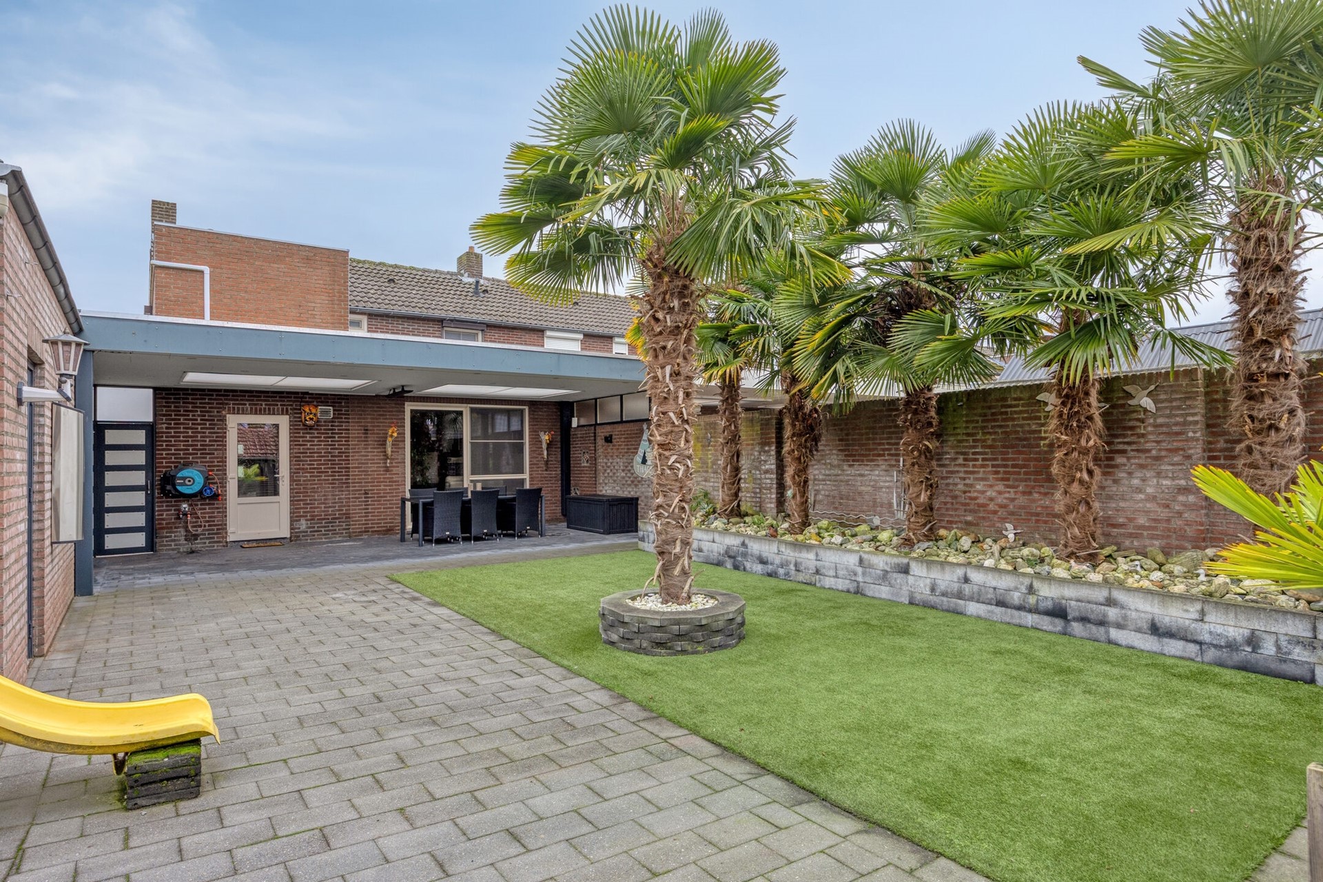 De vrije, volledig privacy biedende achtertuin is volledig omheind en bereikbaar vanuit de oprit middels een poort tussen de woning en de garage. Direct aan de woning bevindt zich, over de gehele breedte van de woning, een overdekt terras (ca. 34 m2) met een 'Agnes' vochtwerend plafond met inbouwspots, een 2-tal lichtkoepels en een infrarood heater. De achtertuin is grotendeels bestraat en heeft een kunstgazon en aangeplante borders met volwassen beplanting, zoals palmbomen. Achter in de tuin bevindt zich nog een houten tuinberging, welke is voorzien van elektra.
