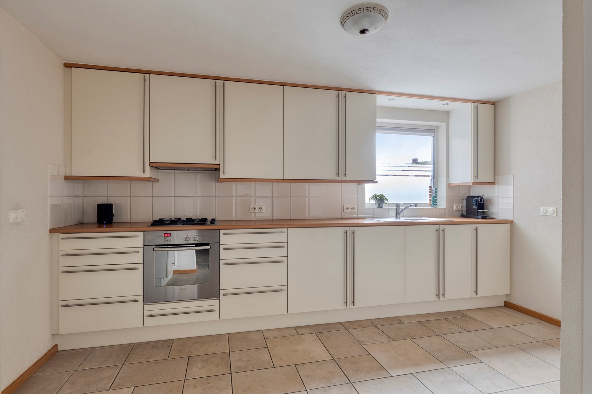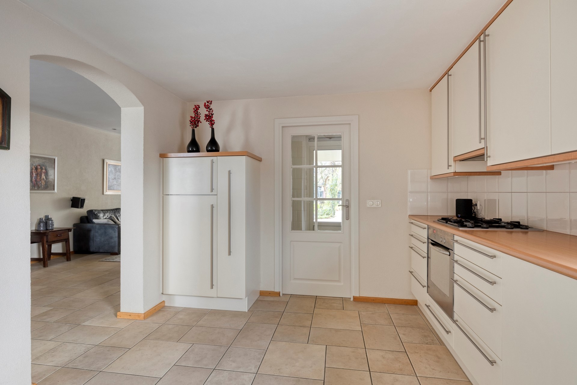 Vanuit de entree naar de keuken, met een tegelvloer met vloerverwarming, spachtelputz wanden en een stucwerk plafond. De keukeninrichting is voorzien van een RVS spoelbak, een RVS gaskookplaat, een RVS heteluchtoven en een afzuigkap. In een apart keukenblok bevindt zich de koelkast en een vriezer. Via een aluminium raamkozijn met HR++ beglazing zicht op de oprit en straat. Onder de trapopgang bevindt zich een volledig betegelde, praktische kelderkast.