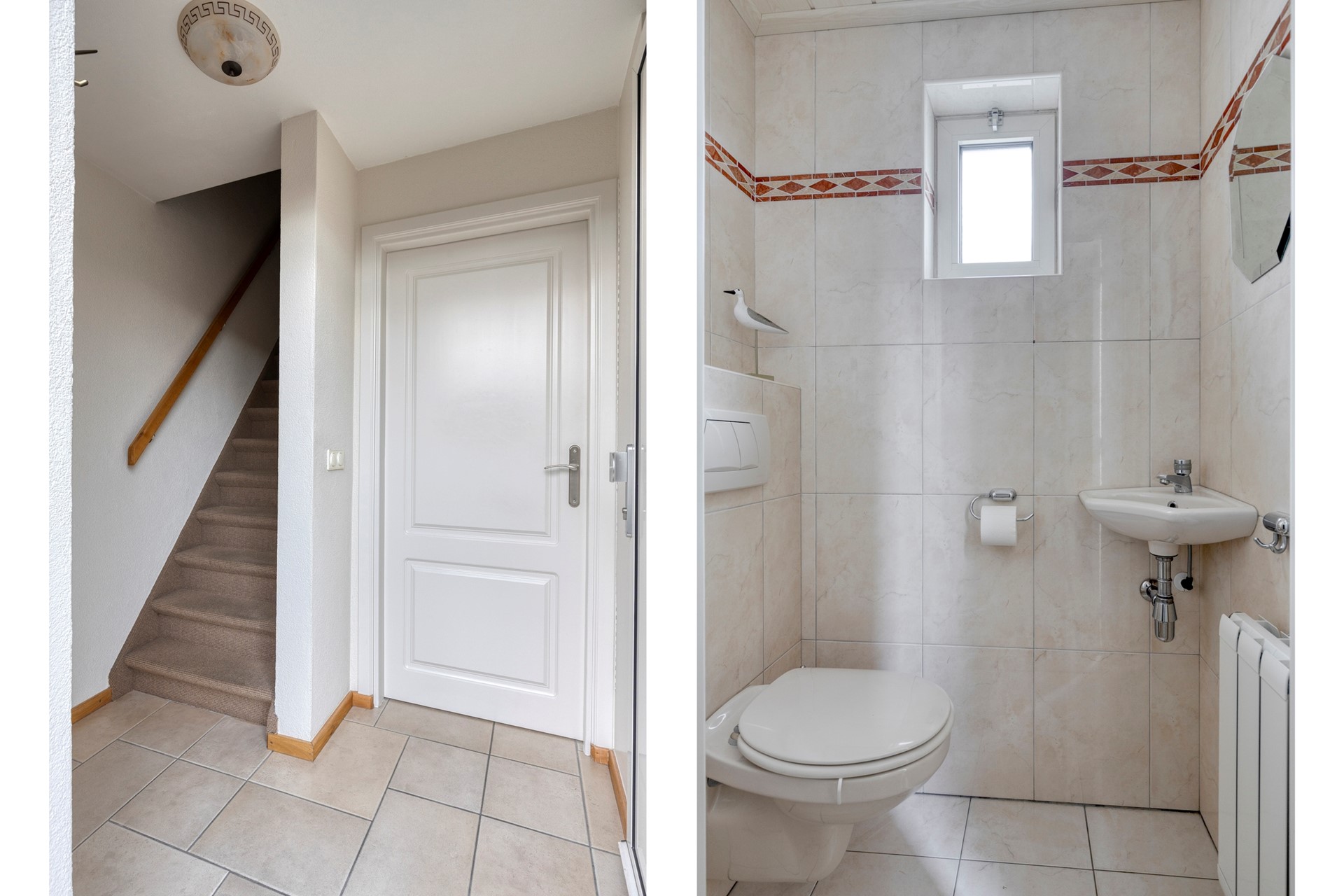 Via de aluminium voordeur naar entree met een tegelvloer met vloerverwarming, spachtelputz wanden en een stucwerk plafond. Met een garderobehoek en een uitgebreide meterkast (o.a. 8 groepen + 2x aardlekschakelaar + krachtstroom). Het toilet heeft een lichte tegelvloer met vloerverwarming, volledig licht betegelde wanden en een MDF plafond. Voorzien van een wandcloset met opzetplateau en een hoekfonteintje. Natuurlijke ventilatie middels een aluminium raampje.