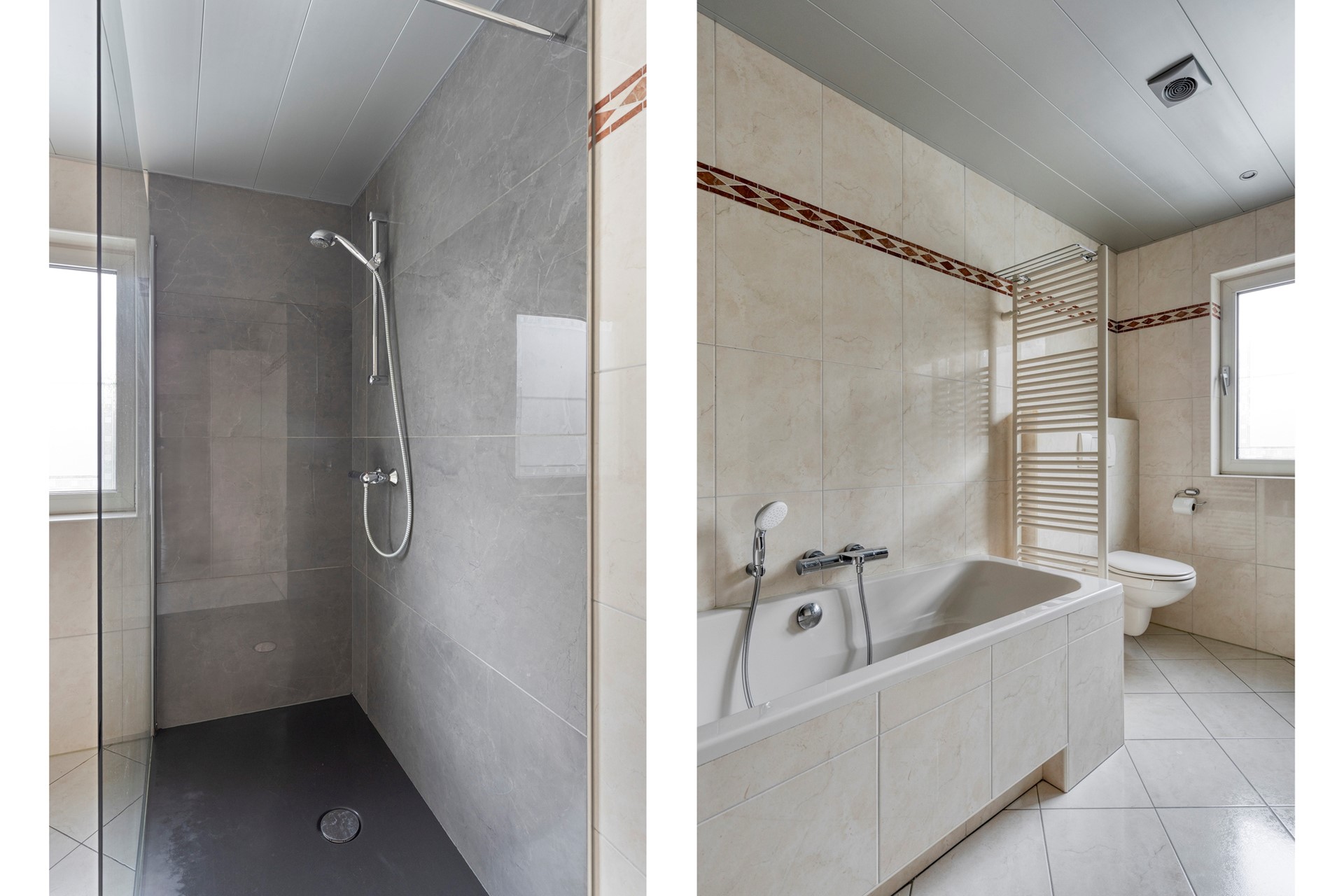 De moderne, volledig betegelde badkamer met vloerverwarming en kunststofpanelen plafond met inbouwspots is voorzien van een ligbad met thermostaatkraan, een wandcloset met opzetplateau, een inloopdouche met glazen wand en thermostaatkraan en een badmeubel met dubbele wastafel en een spiegel met inbouwspots. Er is zowel mechanische- als natuurlijke ventilatie aanwezig middels een aluminium raamkozijn (draai-kiep) met HR++ beglazing en een rolluik.