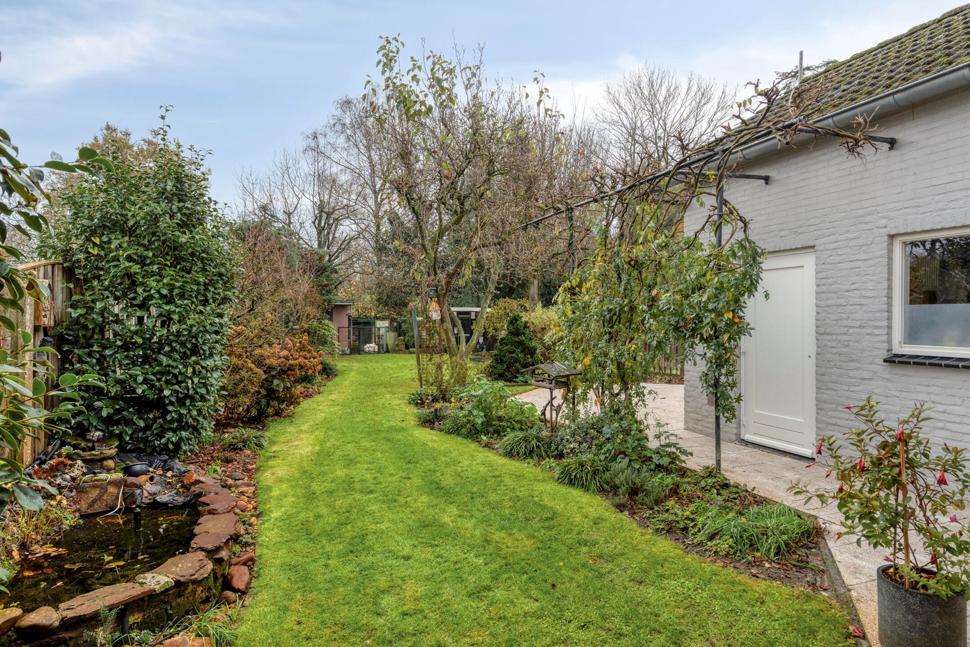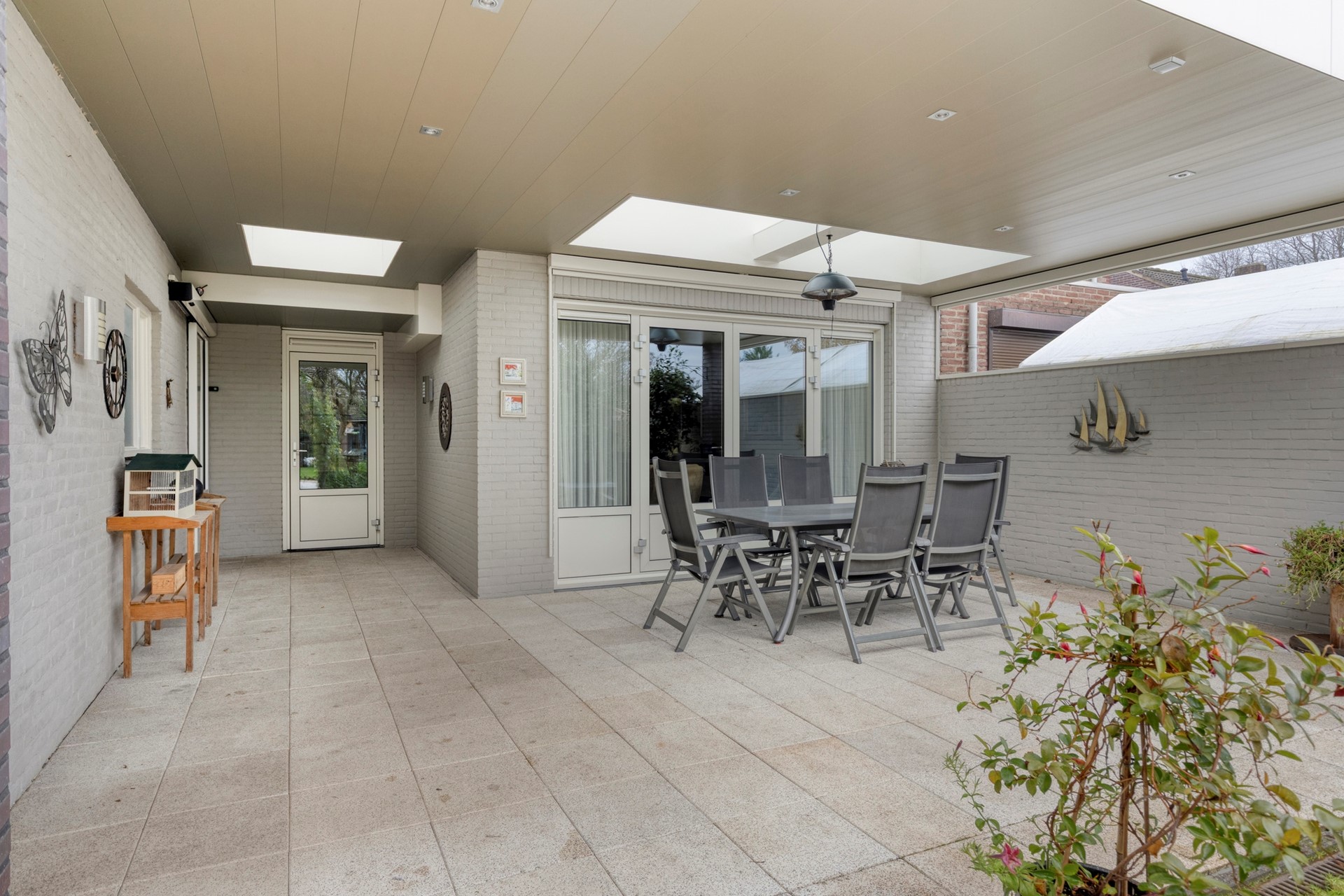 De vrije, volledig privacy biedende achtertuin is volledig omheind en bereikbaar vanuit de carport middels een automatische aluminium schuifdeur. Direct aan de woning bevindt zich, over de gehele breedte van de woning, een overdekt terras met een kunststof panelen plafond met inbouwspots en een 2-tal lichtstraten, welke zijn voorzien van melkglas. De zijkant kan middels een zonnescreen worden afgesloten. De aangelegde tuin heeft een groot gazon, aangeplante borders met volwassen beplanting en een vijvertje. Achter de garage bevindt zich nog een extra terras. Achter in de tuin bevindt zich ook een stenen berging voorzien van elektra en een grondwaterput met pomp. Heerlijk vrij wonen!