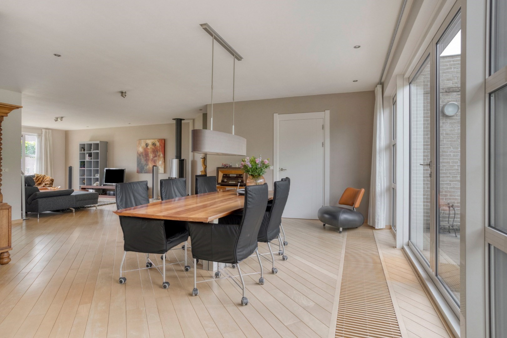 De woonkamer staat in open verbinding met de eetkeuken, met ook een esdoorn vloer. De Siematic keukeninrichting in een hoekopstelling is voorzien van een granieten aanrechtblad met -achterwand, een RVS magnetron, een RVS combi-stoomoven, een warmhoud lade, een vaatwasser, een grote koelkast, een inductiekookplaat en een RVS schouw afzuigkap.