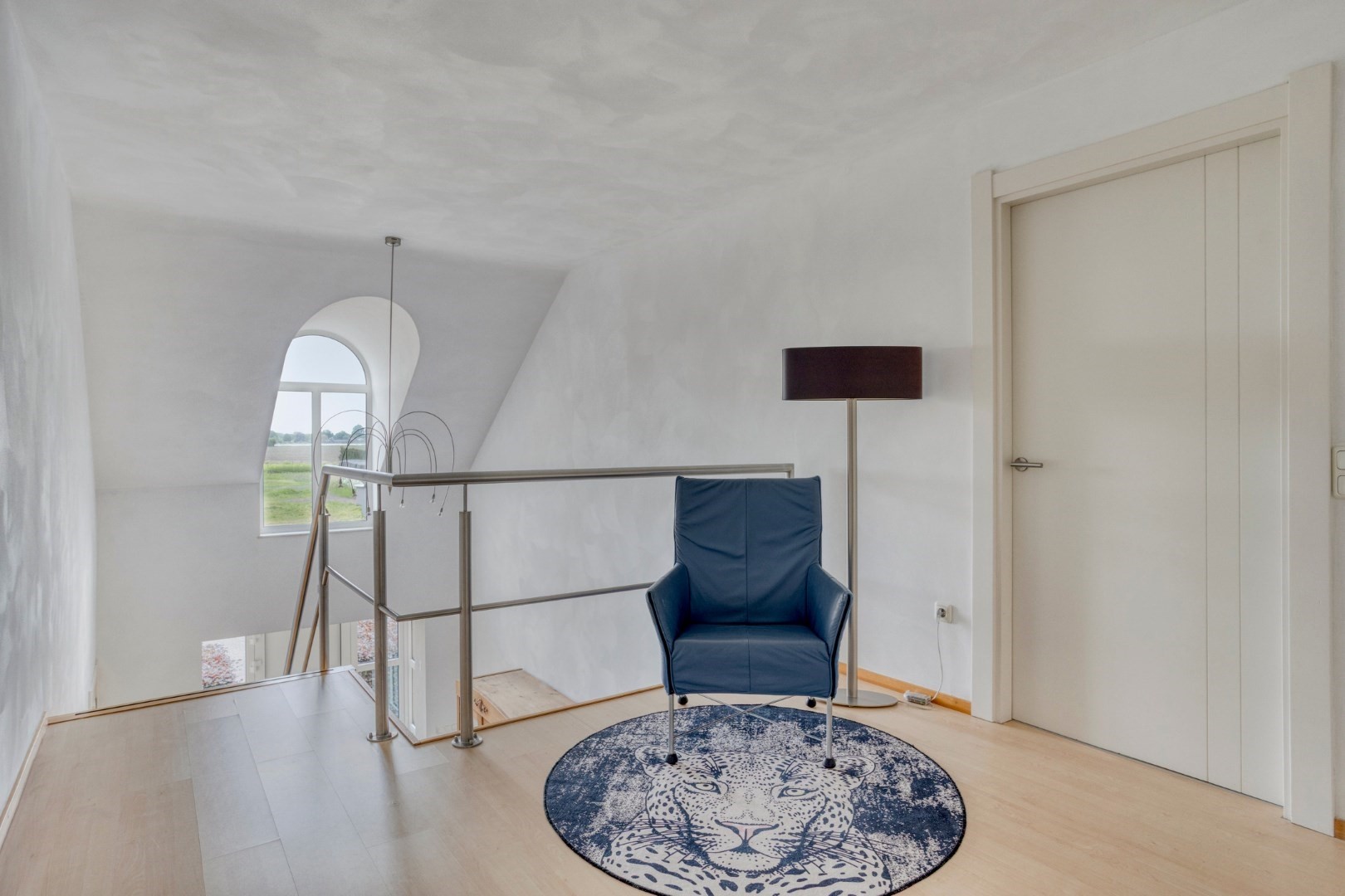 Vanuit de entree met een hardglazen (gematteerd) deur toegang tot de riante woonkamer, met een esdoorn vloer, vlak stucwerk wanden en -plafond. De zitkamer is voorzien van een sfeervolle design gashaard, welke draaibaar is. Aan de voorzijde via een groot aluminium raamkozijn met een vrij uitzicht over landerijen. Aan de achterzijde via een aluminium schuifpui toegang tot het terras en de tuin.