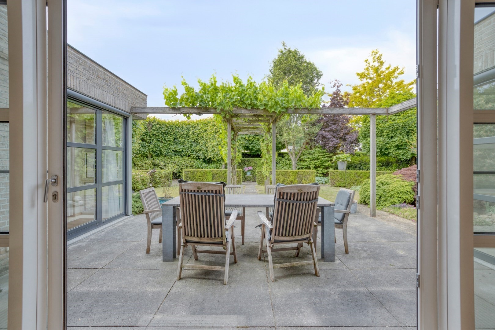 De volledig omheinde achtertuin is gesitueerd op het zuiden en is bereikbaar via een poort aan zowel de linker- als rechterzijde van de woning. Direct aan de woning bevindt zich een terras met een elektrisch te bedienen zonneluifel. Een volledig omheinde, volwassen tuin met o.a. een gazon, aangeplante borders met mooie beplanting en een 2e terras in de achtertuin.