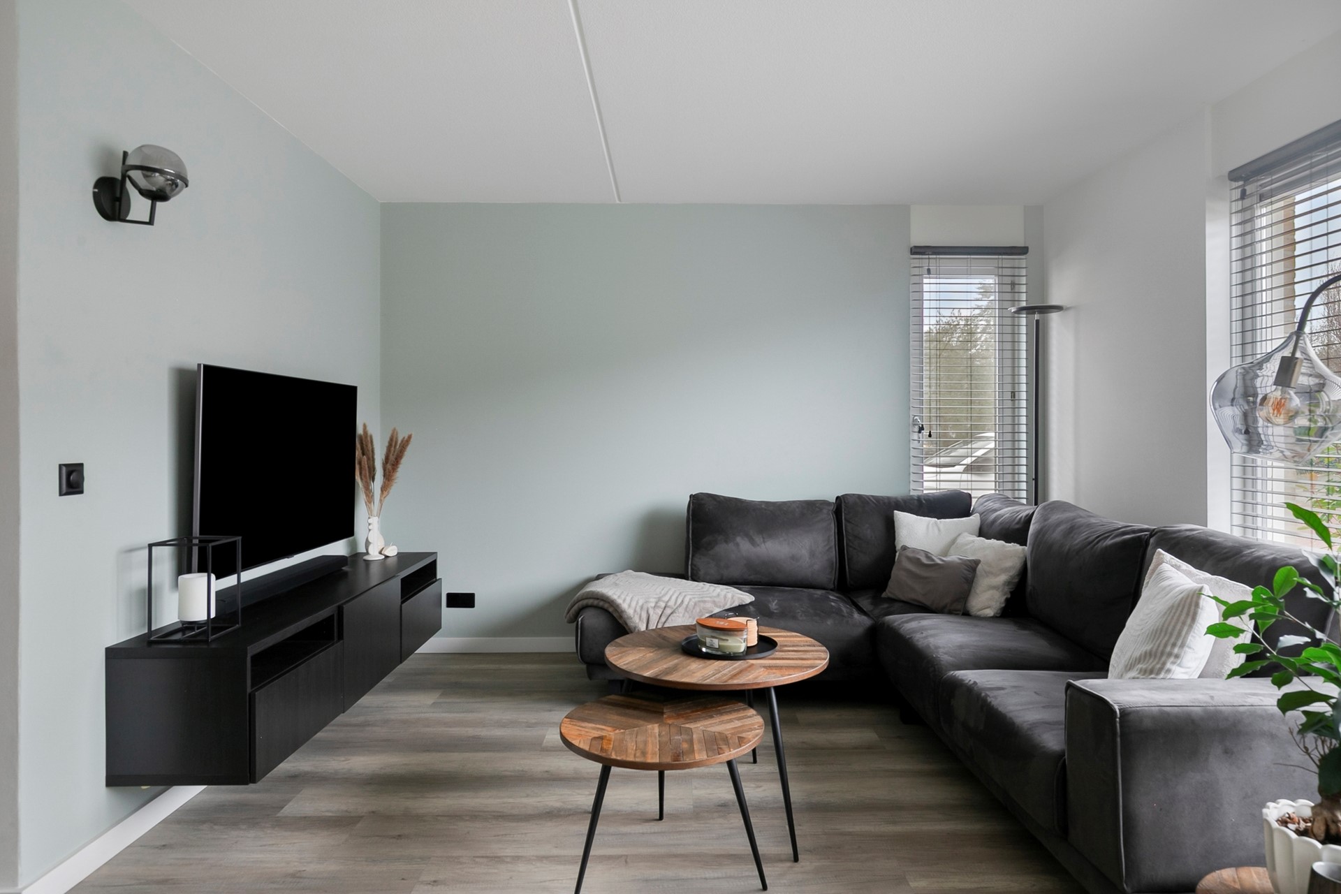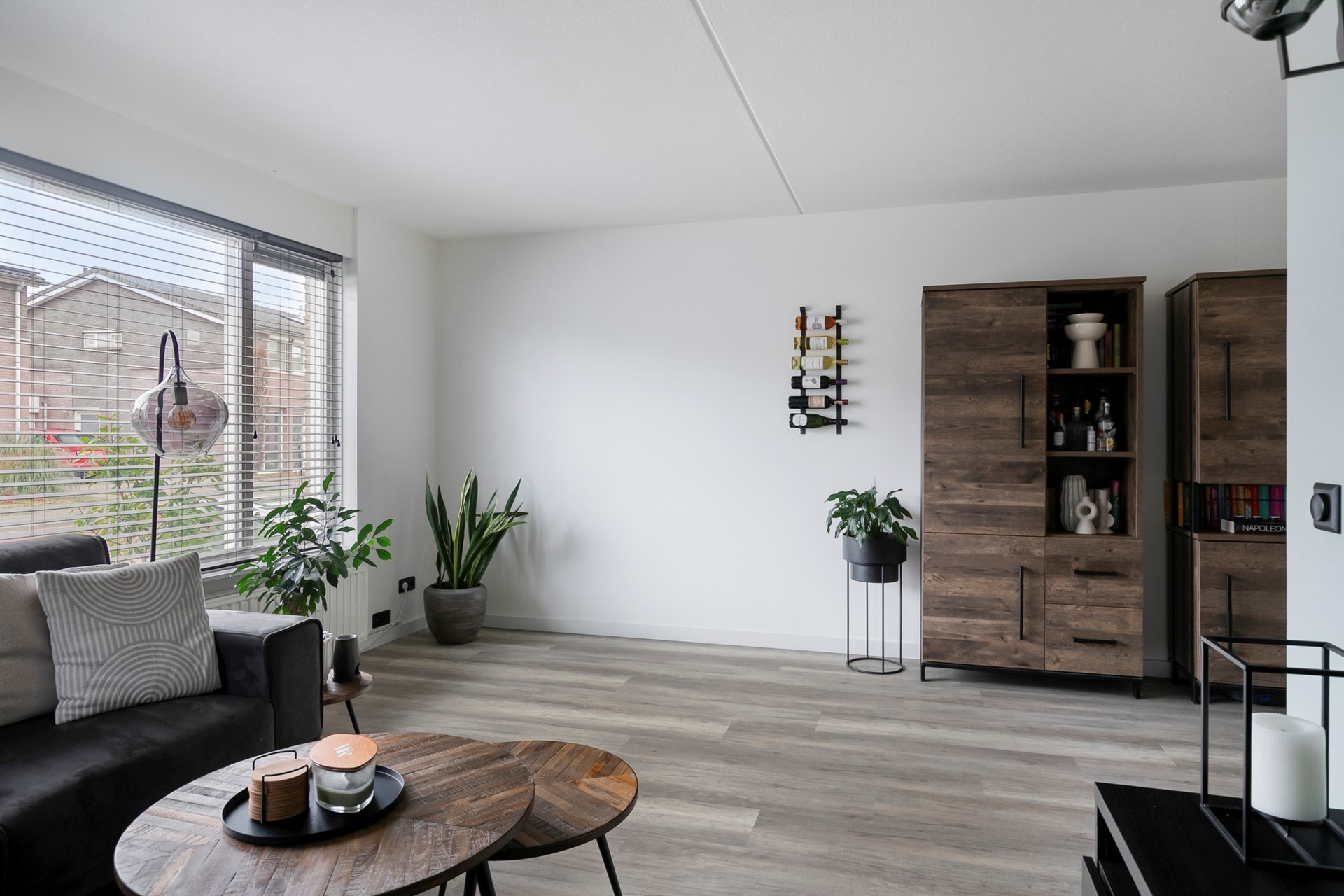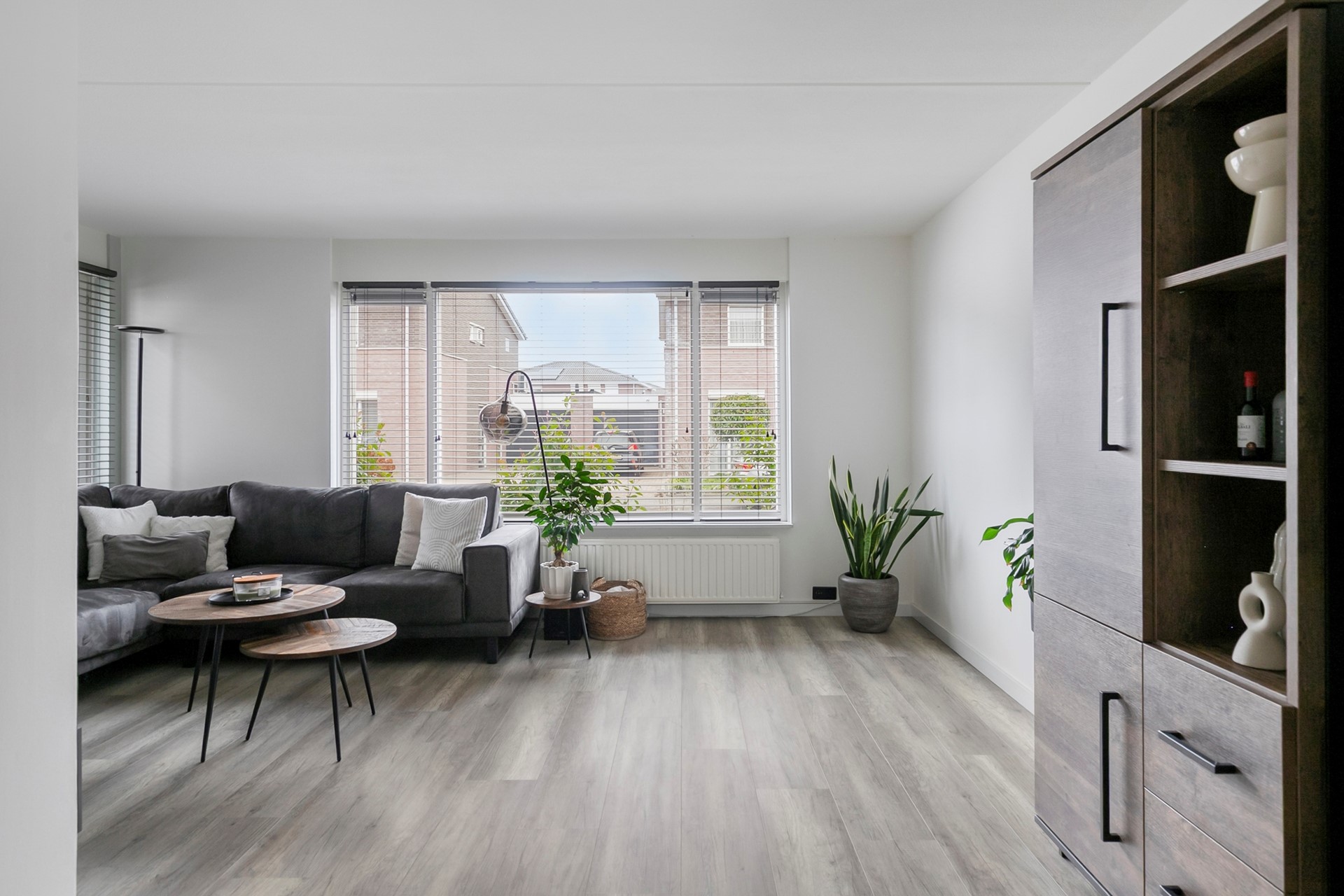 Vanuit de entree met een deur naar de gezellige woonkamer, in een L-vorm. Met een laminaatvloer met vloerverwarming, stucwerk wanden en een spuitwerk plafond. Veel lichtinval middels diverse hardhouten raamkozijnen met dubbele beglazing. Onder de trapopgang bevindt zich een diepe inloop voorraadkast, met een laminaatvloer. Hier bevindt zich de unit van de vloerverwarming (3 groepen).