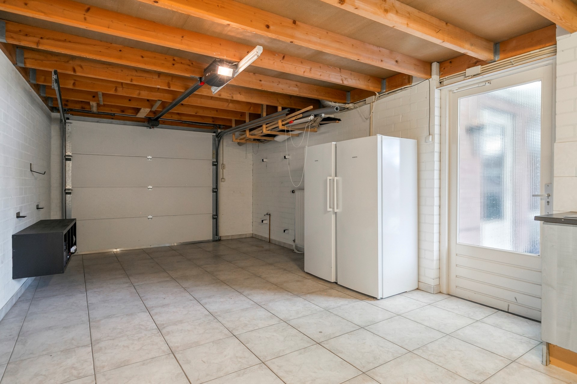 Vanaf de royale, bestrate oprit via een geïsoleerde, op afstand te bedienen sectionaaldeur toegang tot de aanpandige, brede en uitgebouwde garage van ca. 30 m2. Met een tegelvloer, spouwmuren en een plat bitumen dak. Verder een keukenblok met spoelbak (warm-/koud water) en elektra.