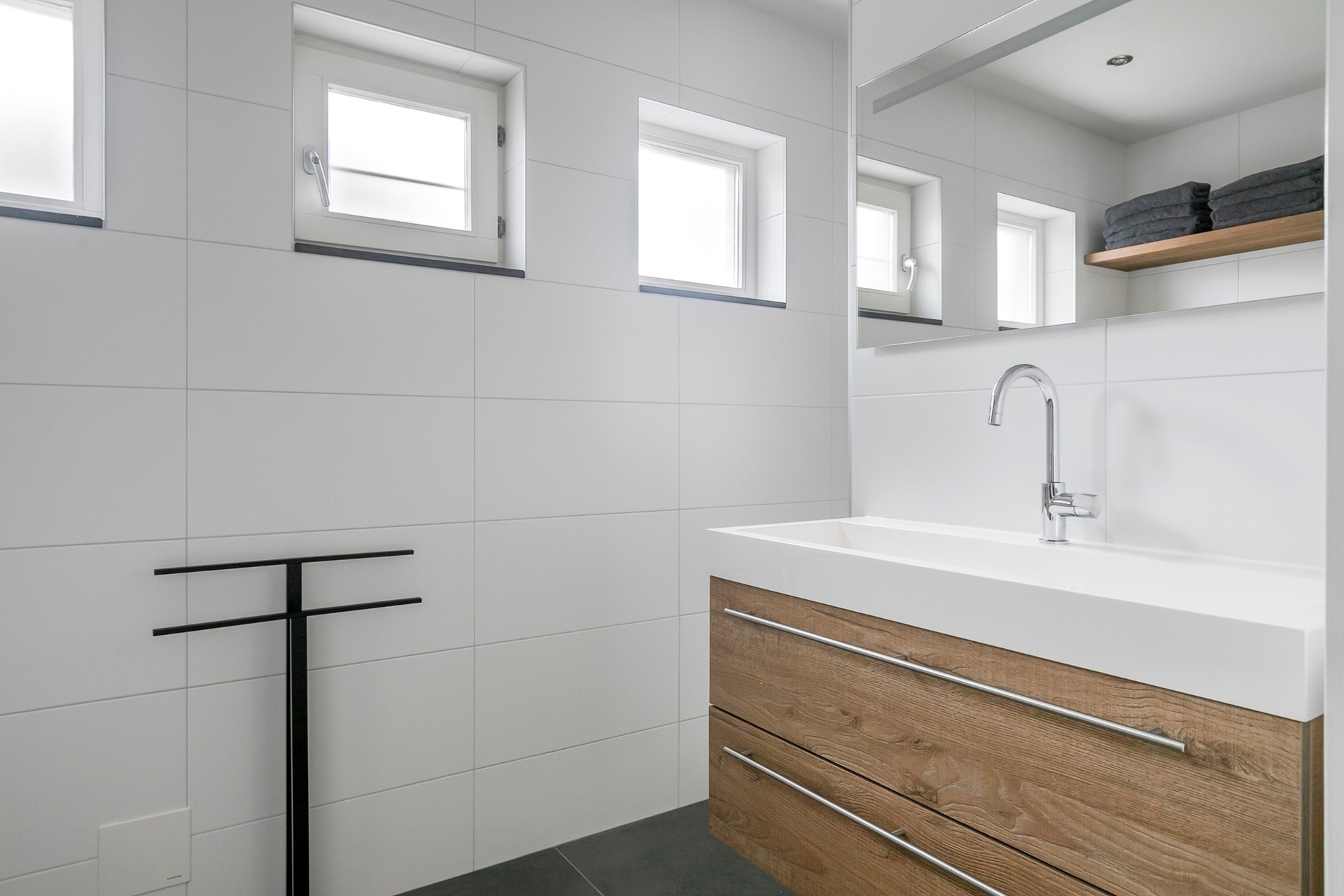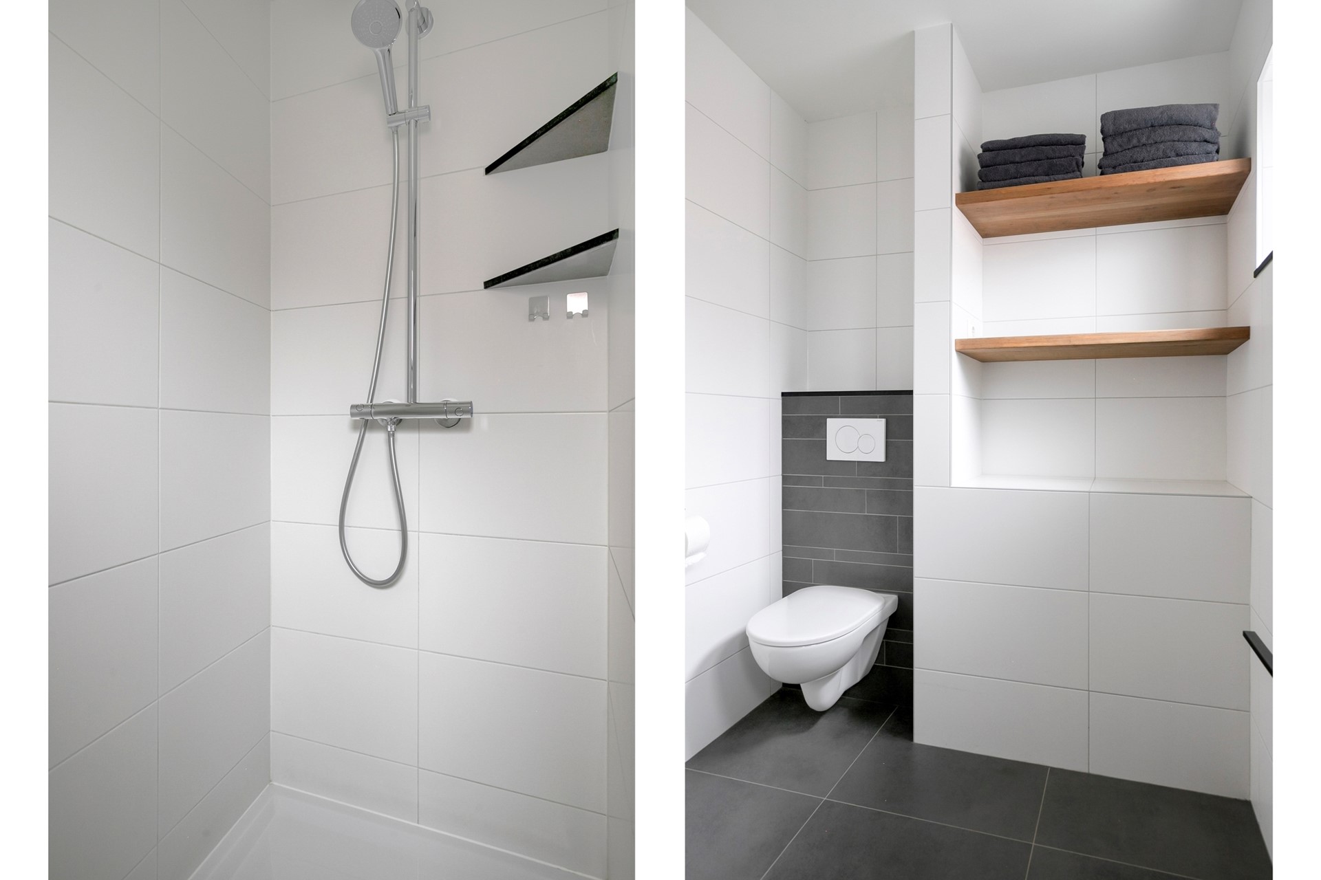 De moderne badkamer heeft een tegelvloer met vloerverwarming, volledig betegelde wanden en een stucwerk plafond met inbouwspots. Voorzien van een wandcloset met opzetplateau, een badmeubel met vaste wastafel en een verwarmde spiegel met verlichting en een inloopdouche met thermostaatkraan een regendouche. Er is zowel mechanische- als natuurlijke ventilatie aanwezig middels een hardhouten raampje met dubbele beglazing.