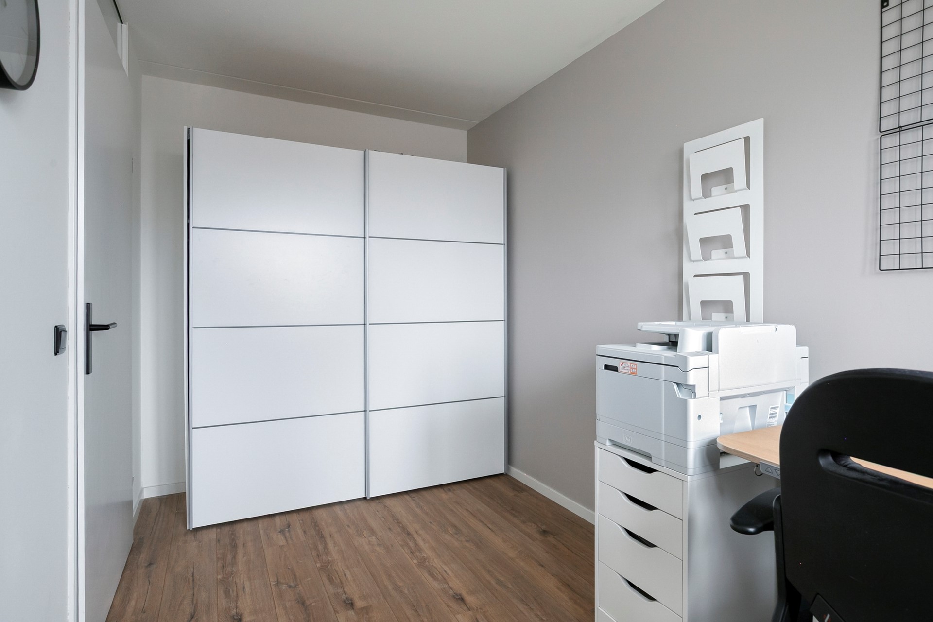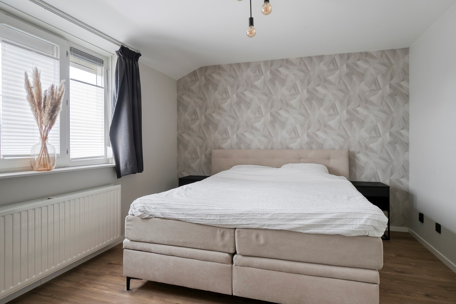 De slaapkamer aan de voorzijde, over de gehele breedte, heeft een laminaatvloer, stucwerk wanden en een stucwerk plafond met inbouwspots. Daglicht middels een hardhouten raamkozijn met vliegenhor en een rolluik.