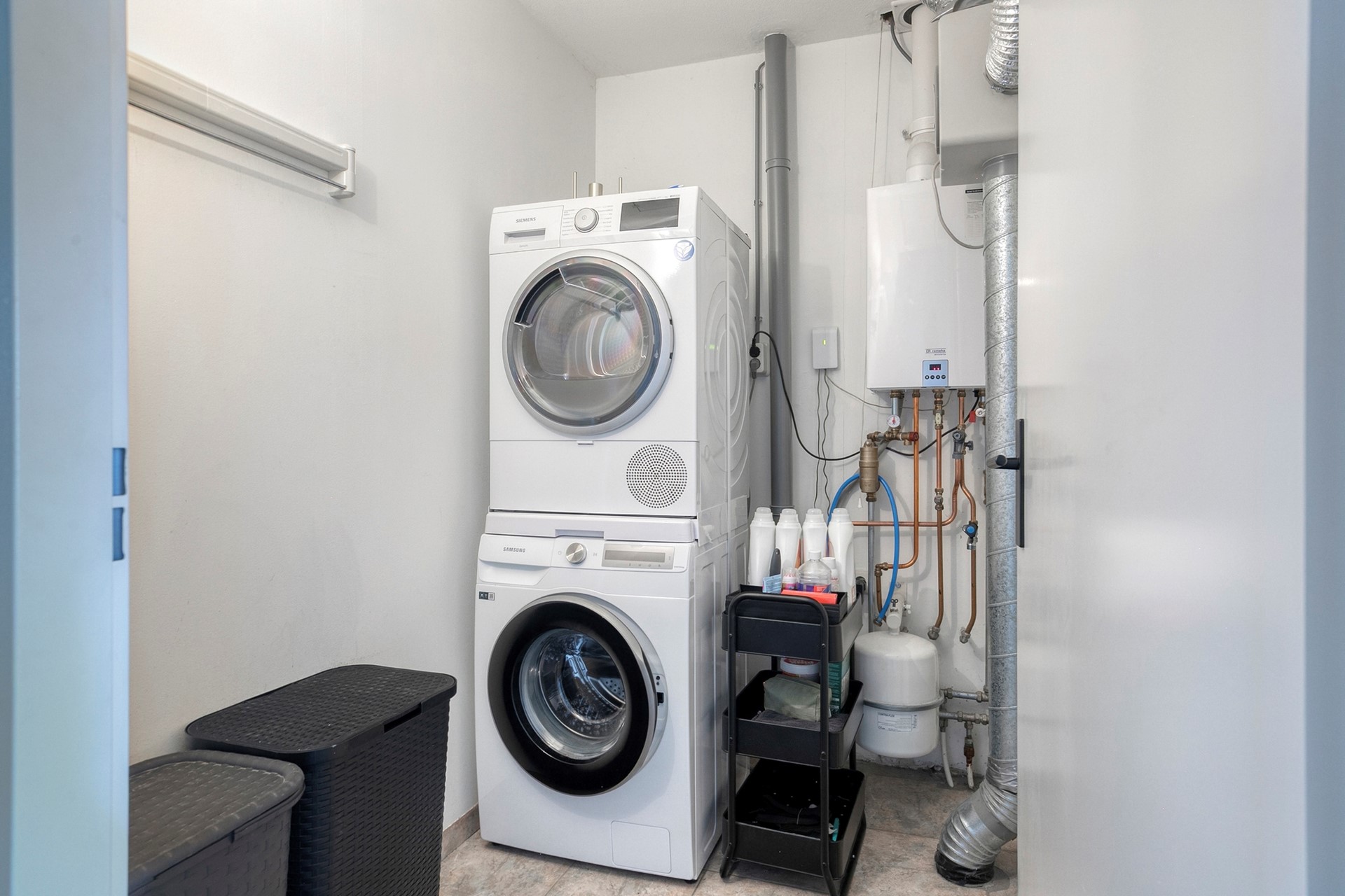 Aparte was-/CV-ruimte met een tegelvloer. Hier bevinden zich de aansluitingen voor de wasapparatuur, de Remeha Avanta HR combiketel (2021) en de unit van de mechanische ventilatie.