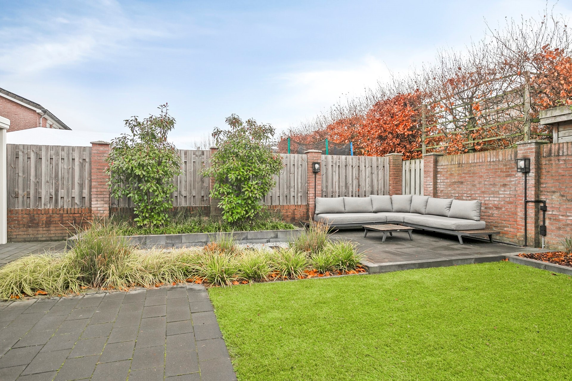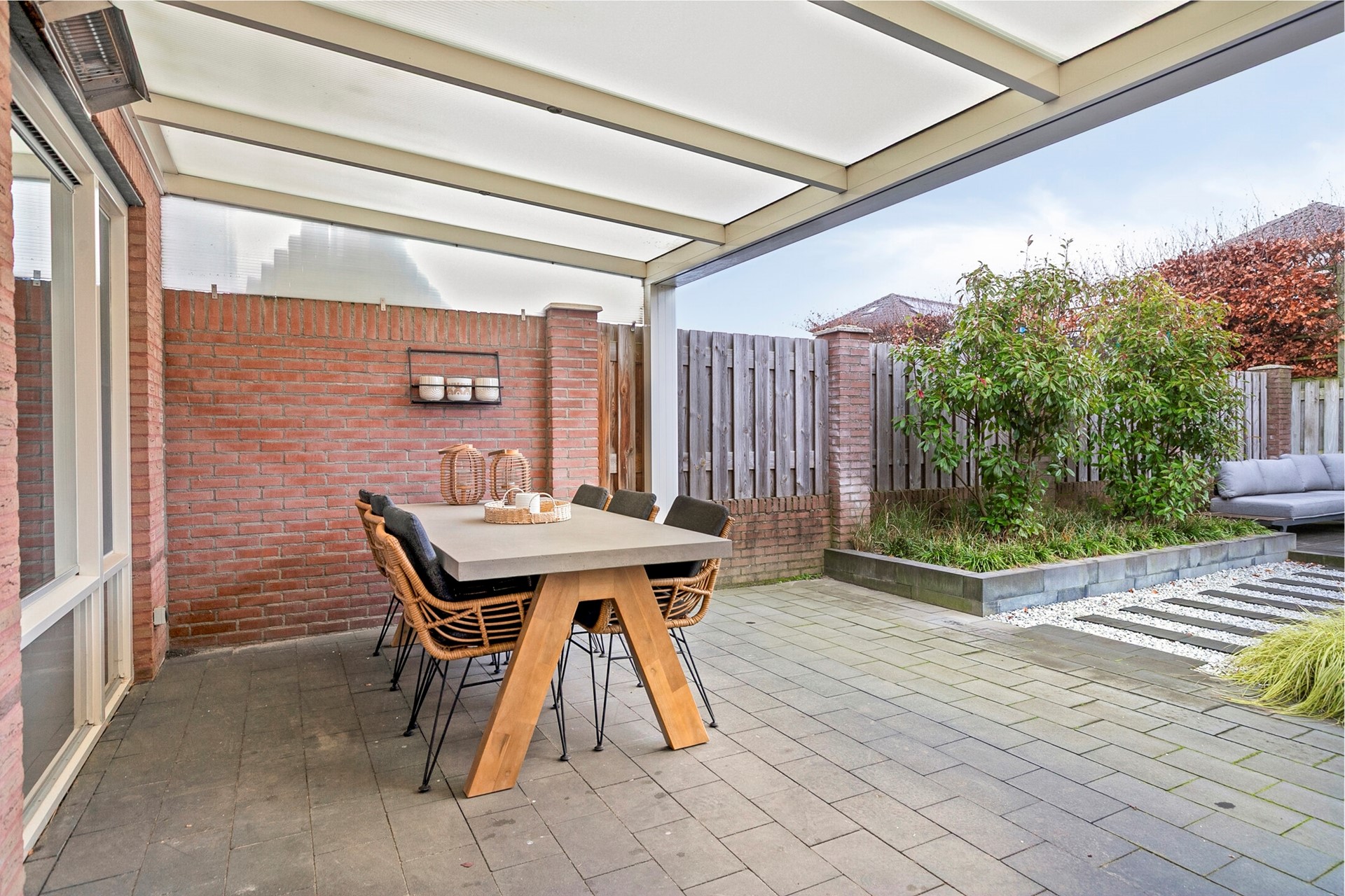 Via een deur naar de achtertuin, welke volledig is omheind en veel privacy biedt. Direct aan de woning bevindt zicht over de gehele breedte een aluminium terrasoverkapping met polycarbonaat dakplaten, inbouwspots en een heater. De onderhoudsvriendelijke tuin heeft o.a. een kunstgazon, een 2e terras en aangeplante borders met volwassen beplanting met diverse druppelslangen.