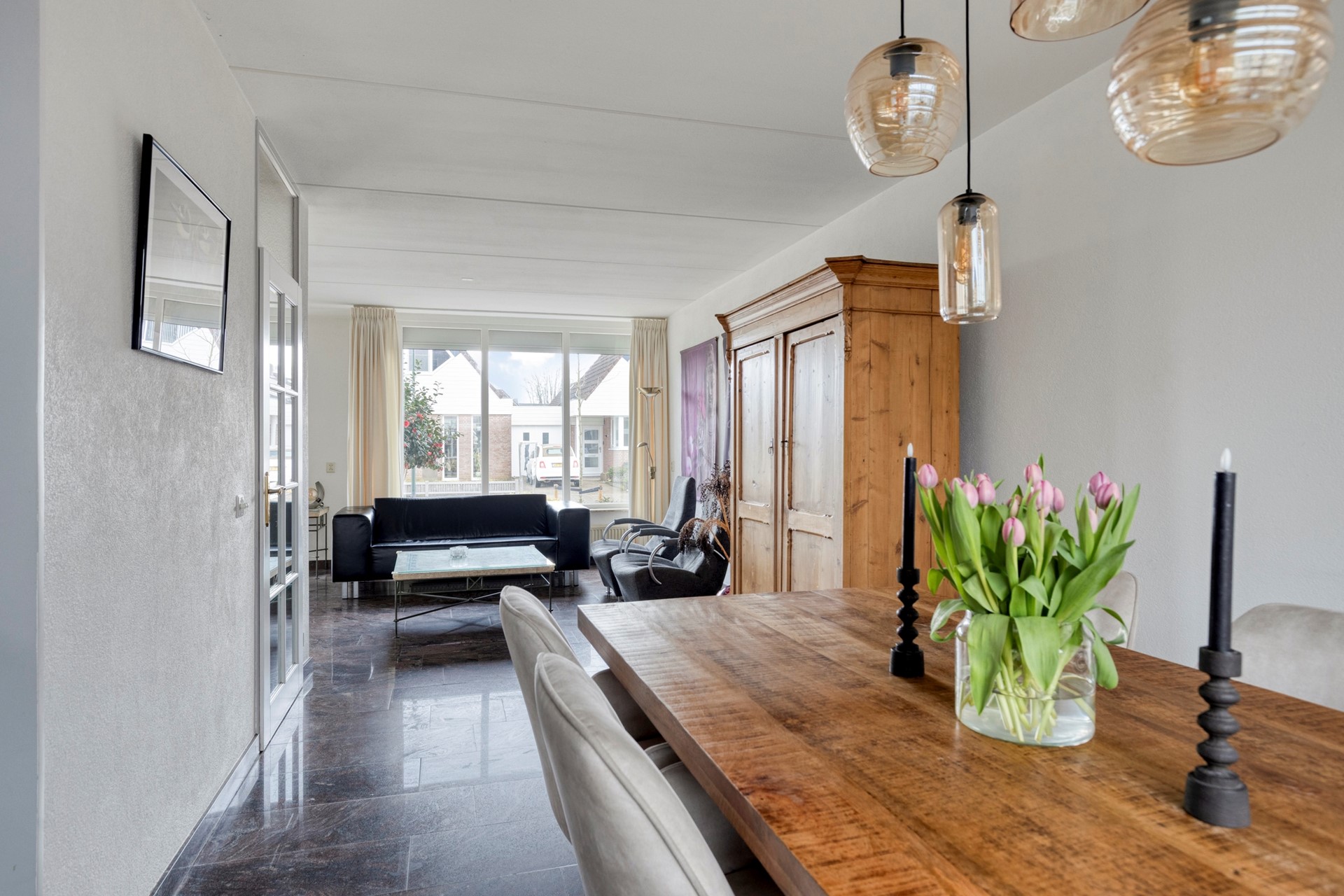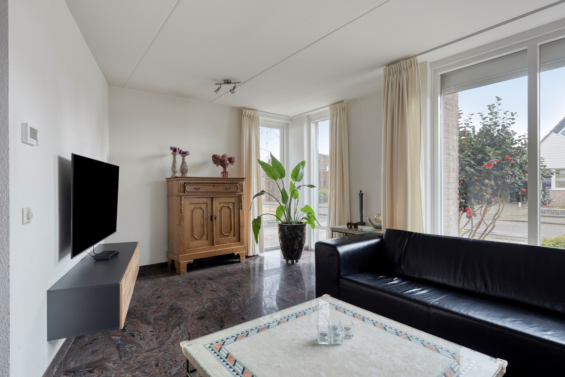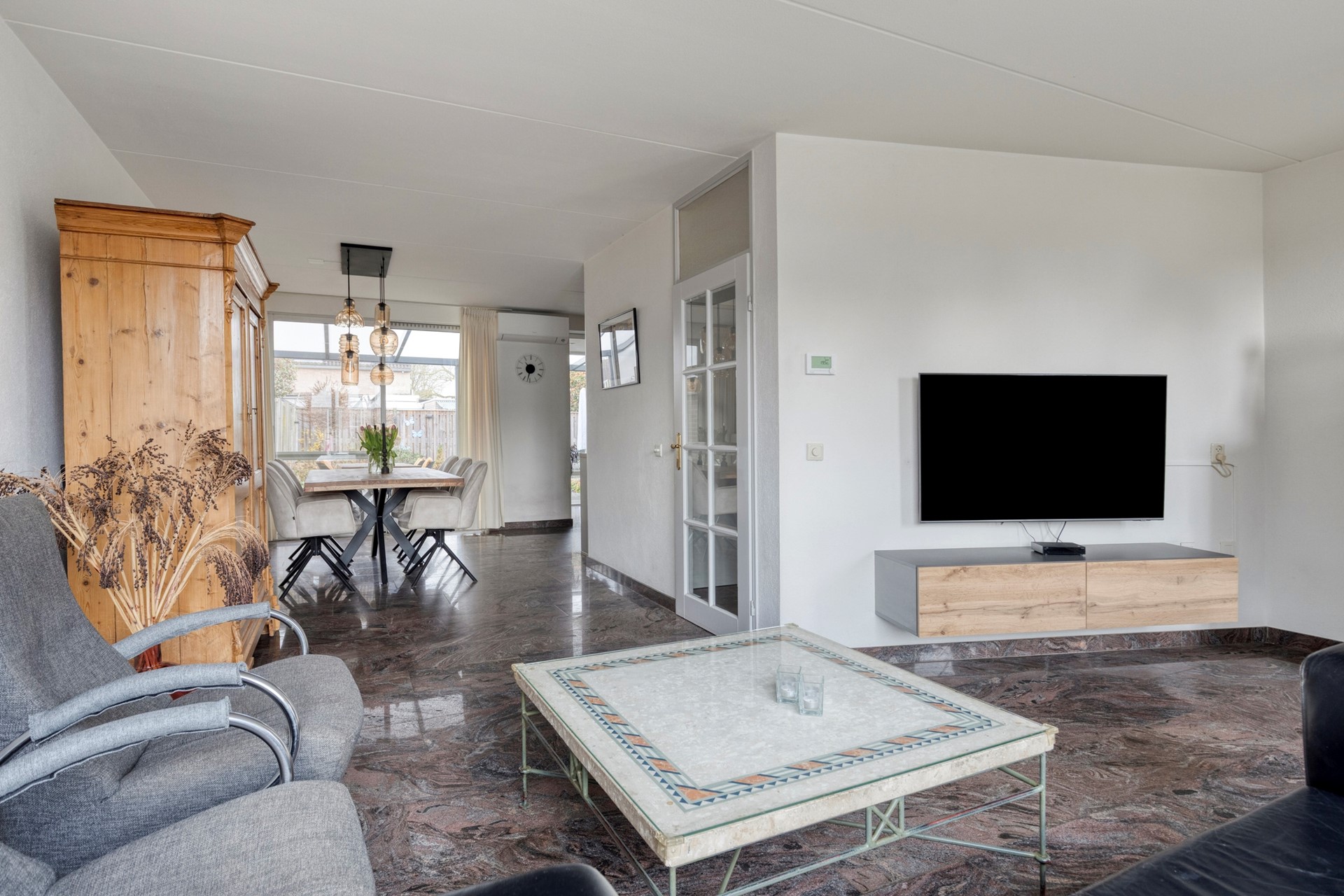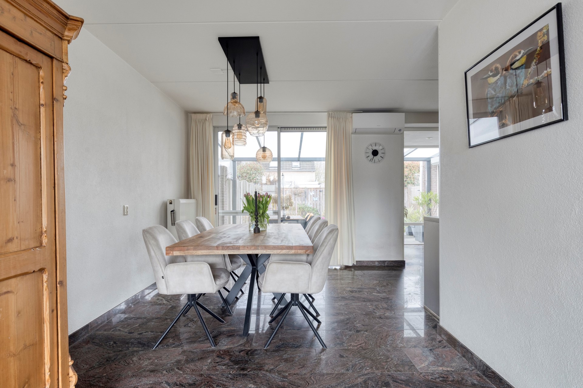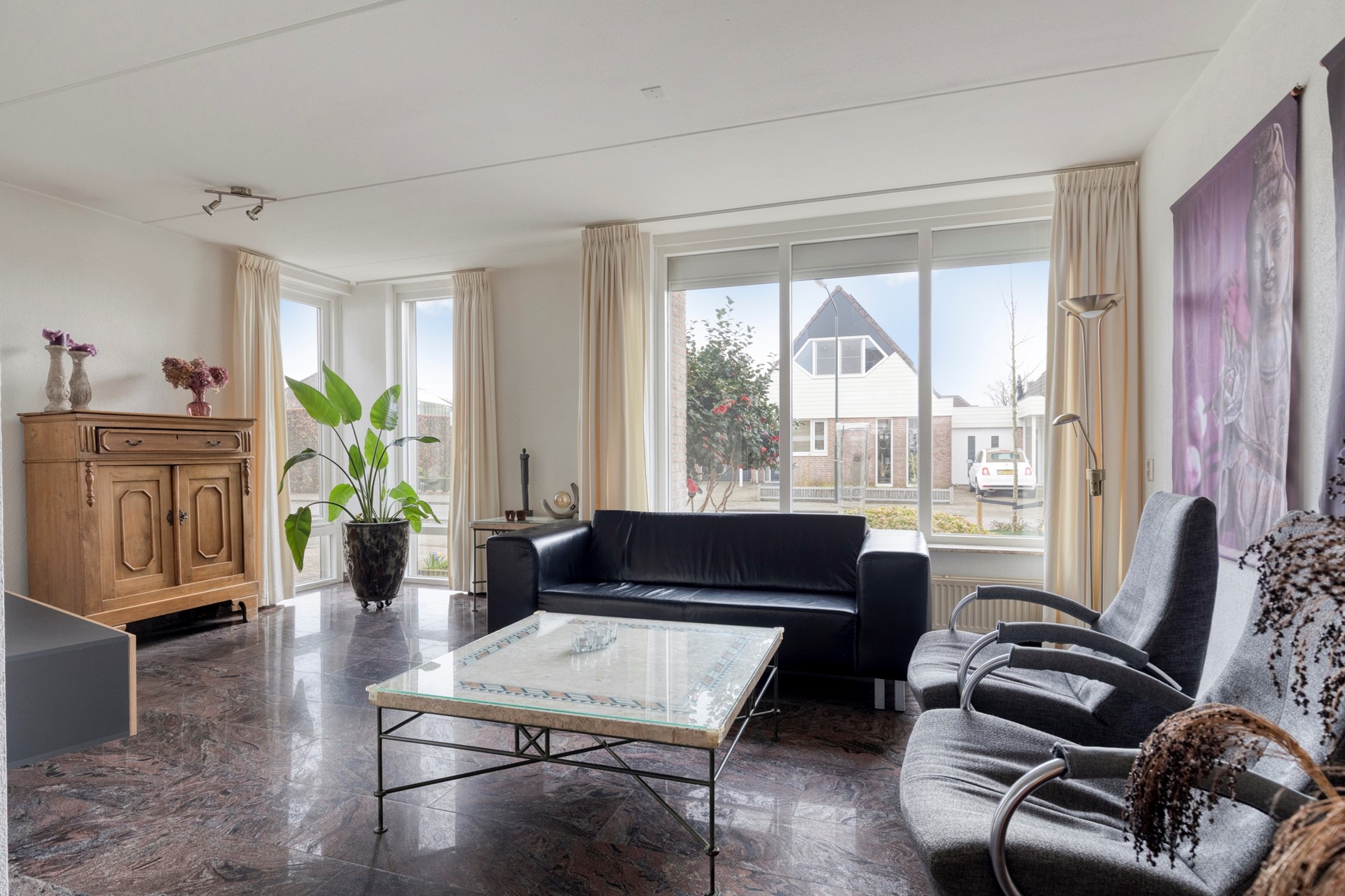 Vanuit de entree met een deur met glas-in-roeden naar de woonkamer, met een granieten tegelvloer met vloerverwarming, spachtelputz wanden en een spuitwerk plafond. O.a. voorzien van een Daikin airco (verwarmen/koelen). Lekker veel licht aanwezig via een drietal hardhouten raamkozijnen met dubbele beglazing en rolluiken aan de voorzijde. Aan de achterzijde via een aluminium schuifpui met dubbele beglazing, met schuif- vliegenhor, toegang tot het overdekte terras.
