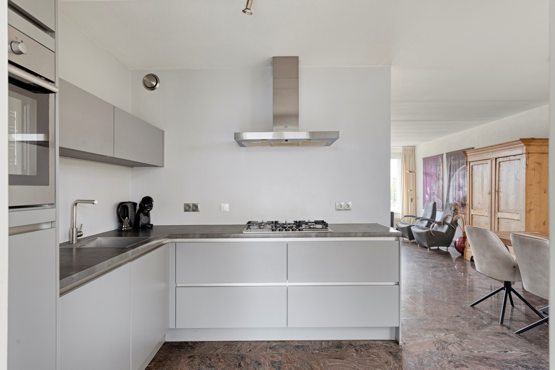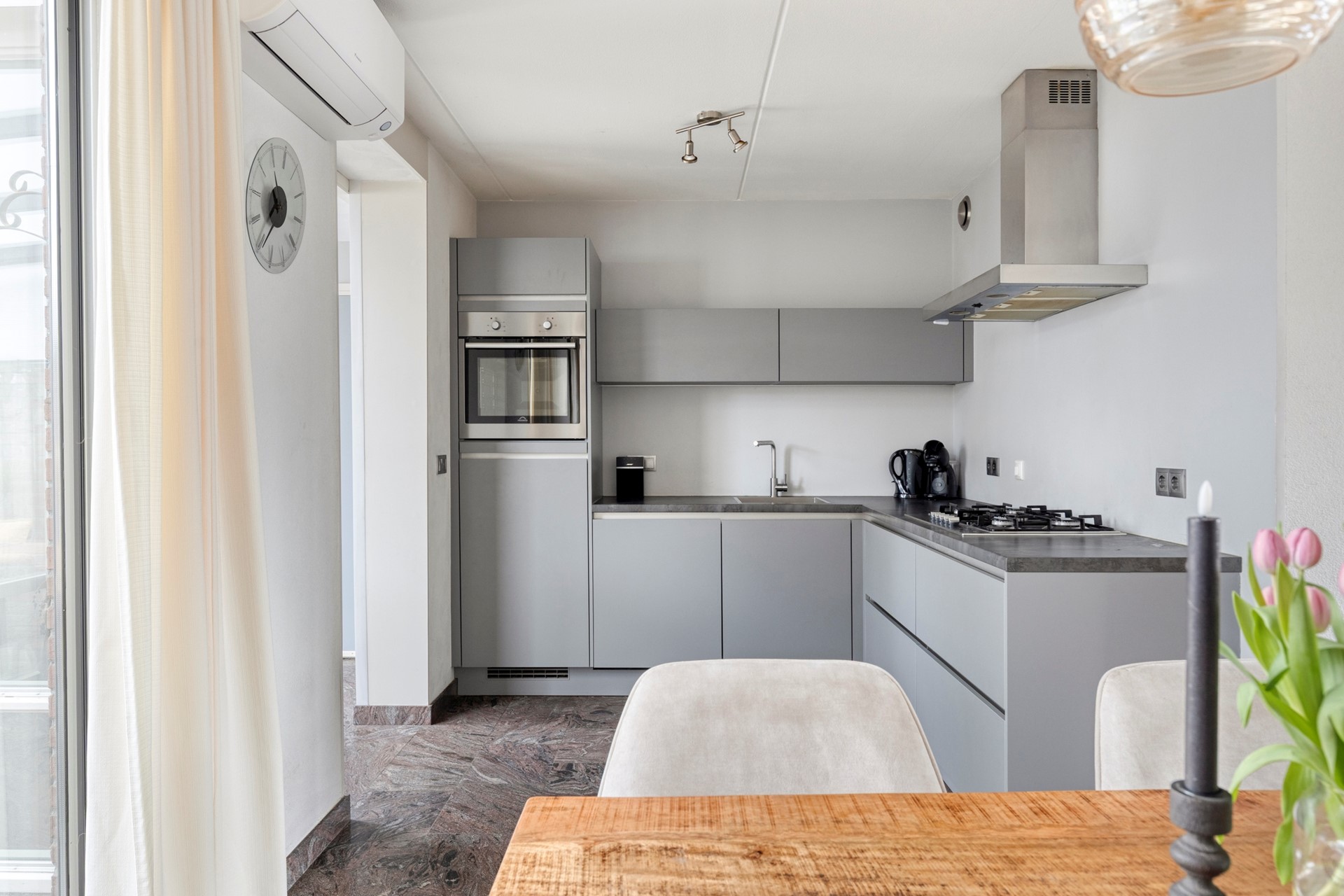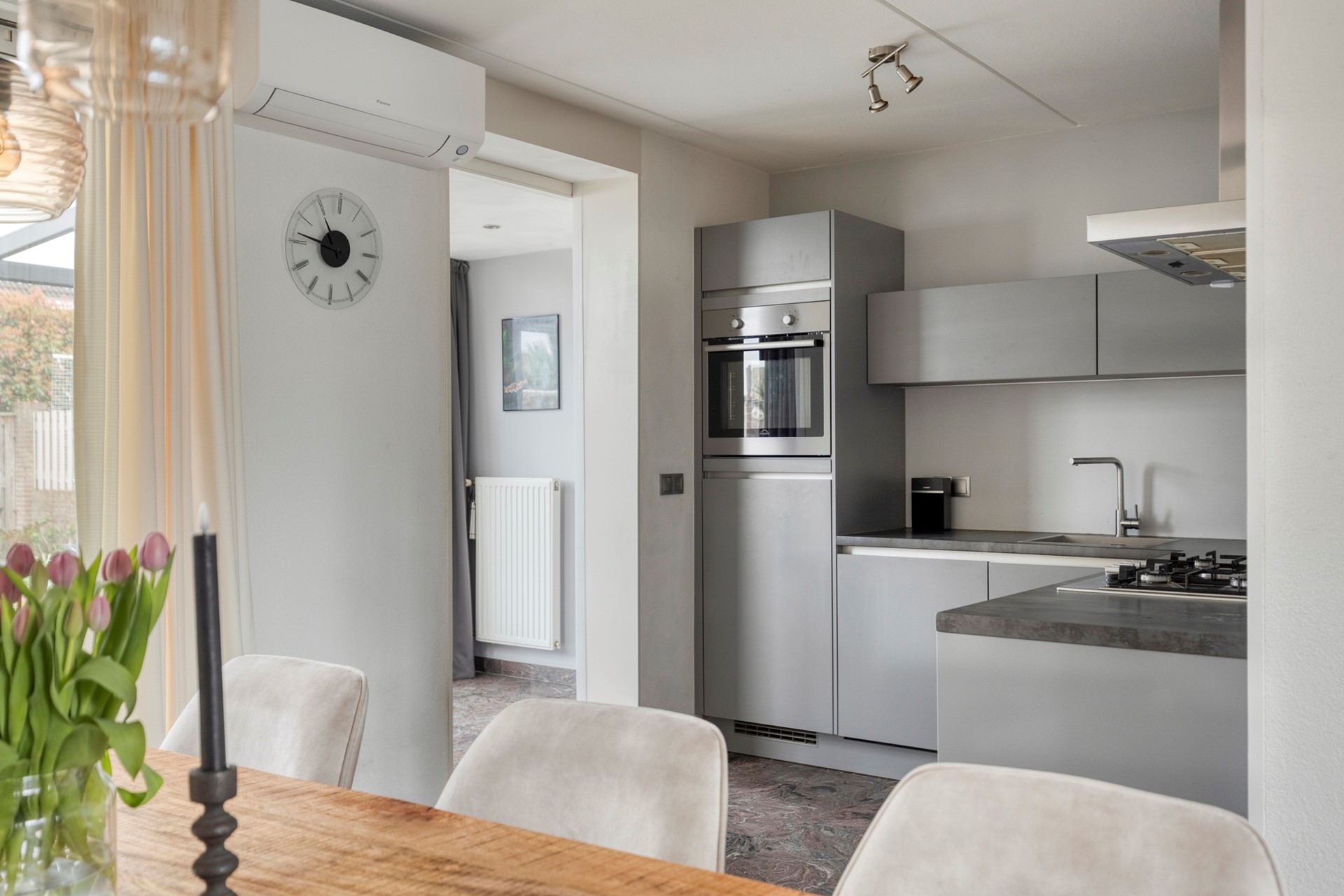 De halfopen keuken is afgewerkt met granieten tegelvloer met vloerverwarming, spachtelputz wanden en een spuitwerk plafond. De moderne keukeninrichting in een hoekopstelling is voorzien van een RVS spoelbak, een RVS 5-pits gaskookplaat met wokbrander, een RVS schouw afzuigkap, een koelkast, een vaatwasser en een heteluchtoven.
