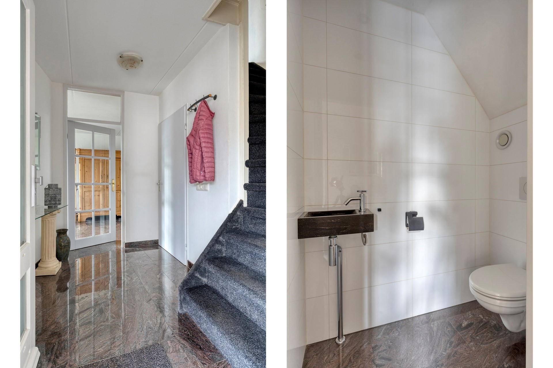 Diepe, bestrate oprit met carport. Via overdekte entree met een hardhouten voordeur met dubbele beglazing toegang tot de royale entree. Met een granieten tegelvloer met vloerverwarming, stucwerk wanden en een spuitwerk plafond. Uitgebreide meterkast (o.a. 7 groepen + 2x aardlekschakelaar + PV groep + glasvezel). Onder de trapopgang bevindt zich het volledig betegelde toilet met een stucwerk plafond met inbouwspots. Met een wandcloset, een hardstenen fonteintje en mechanische afzuiging.