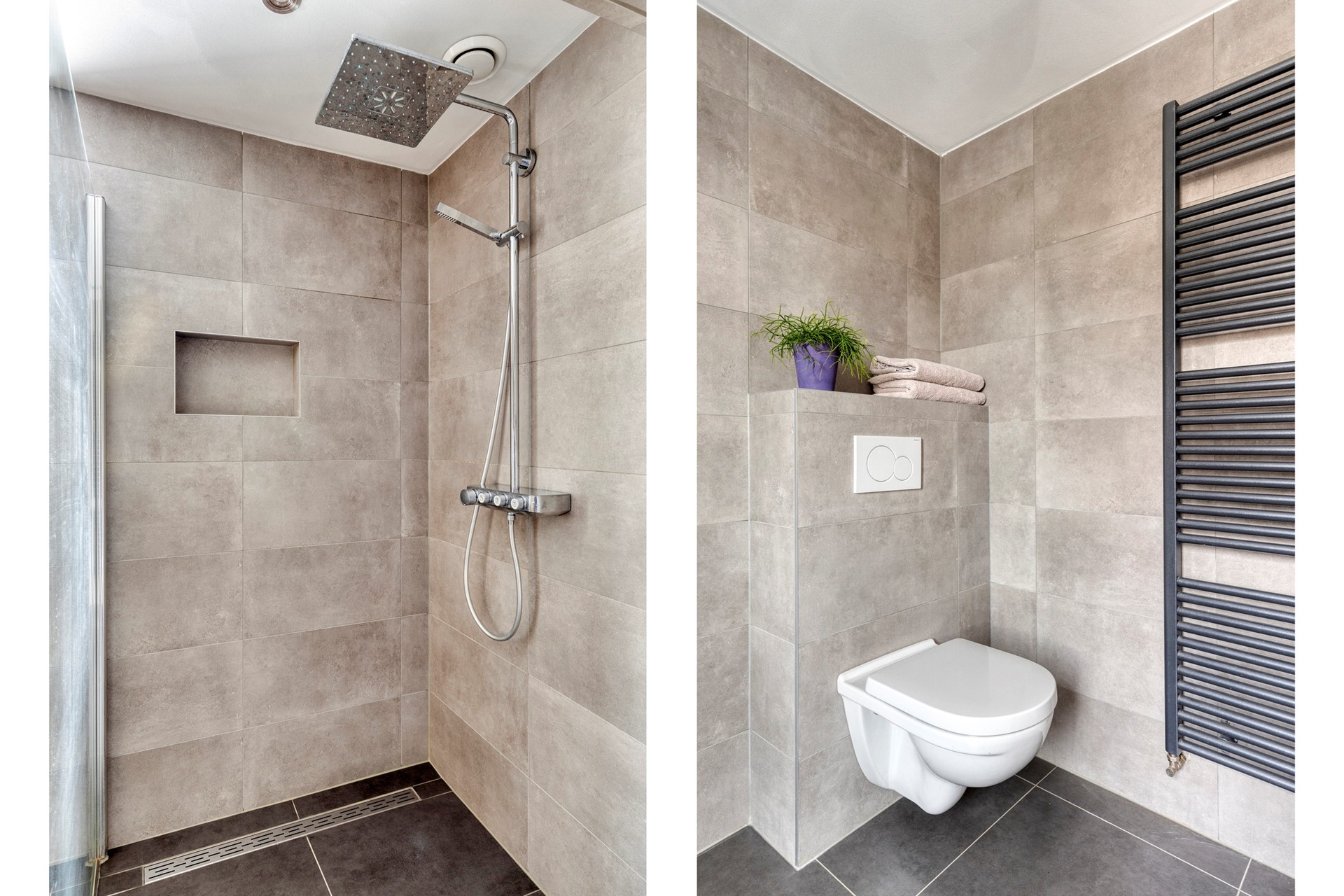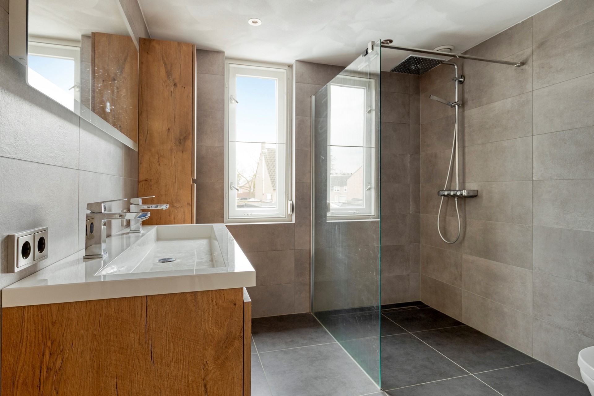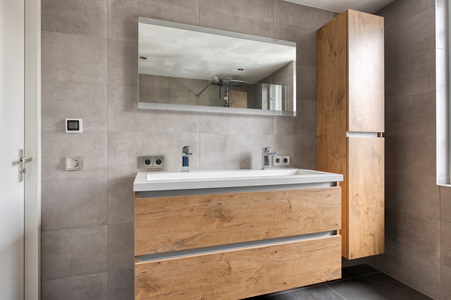 De volledig betegelde luxe badkamer (2021) met vloerverwarming (elektrisch) en een stucwerk plafond met (LED) inbouwspots is voorzien van een breed badmeubel met een tweetal kranen en een verwarmde spiegel met verlichting, een inloopdouche met thermostaatkraan en regendouche en een wandcloset met opzetplateau. Mechanische en natuurlijke ventilatie middels een hardhouten raamkozijn met dubbele beglazing, vliegenhor en een rolluik.