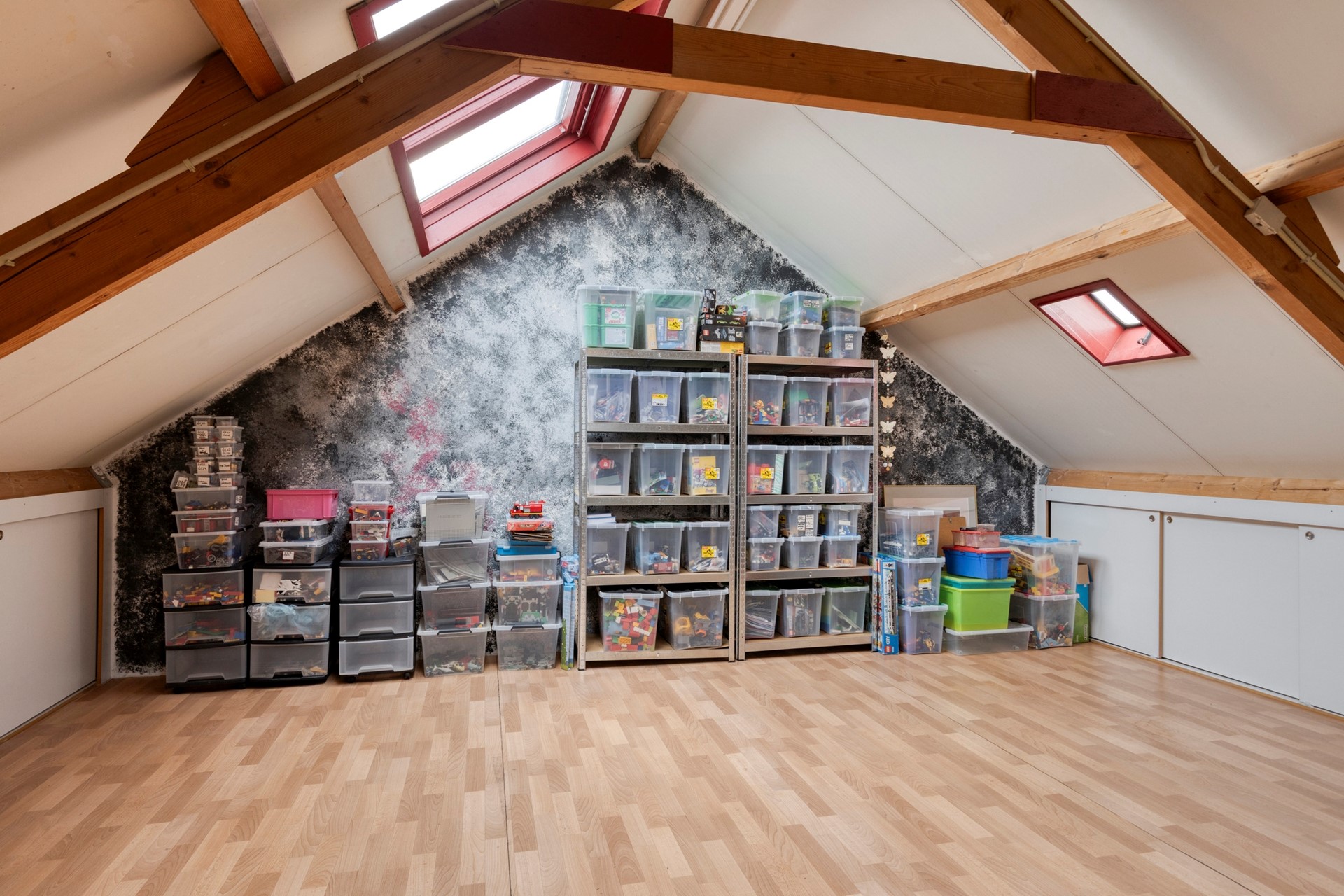 Bereikbaar via een vaste trap op de overloop. Riante open zolderruimte met een vinylvloer en praktische schuifwandkasten onder de schuinten van het dak. Hier bevindt zich de Remeha Avanta HR combiketel (2025), de unit van de mechanische ventilatie, een uitstortgootsteen (warm-/koud water) en de 'SolarEdge' omvormer t.b.v. een 14-tal zonnepanelen (via 'Groene Zone'). Veel daglicht middels een kunststof gevelkozijn (draai-/kiep) met dubbele beglazing, vliegenhor en een rolluik en een tweetal grote dakramen aan de voorzijde en een klein dakraam aan de achterzijde.