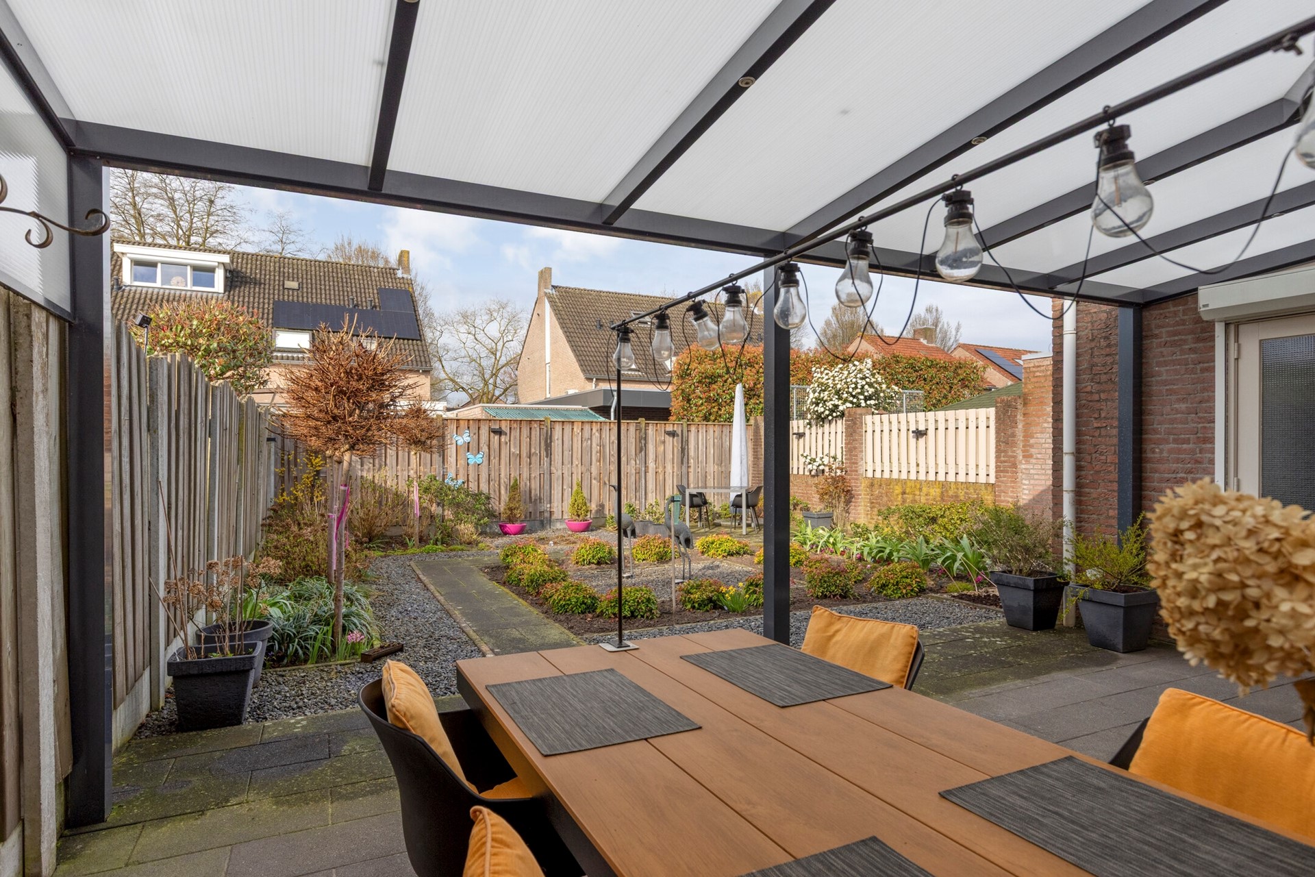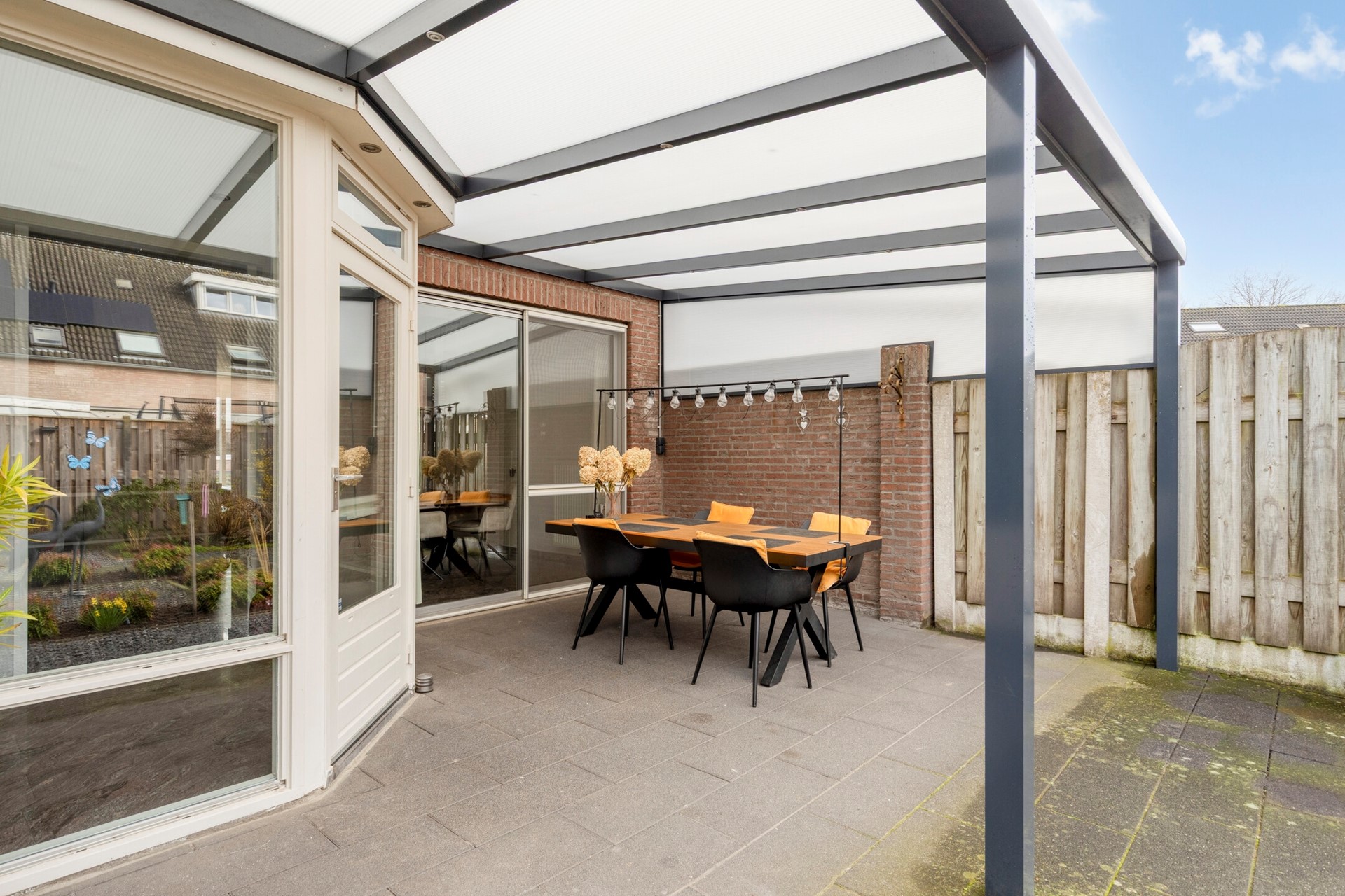 Vanuit de keuken via het aangebouwde portaal naar de aanpandige garage en via een hardhouten terrasdeur, met vliegenhordeur, naar de royale aluminium terrasoverkapping met diverse inbouwspots.