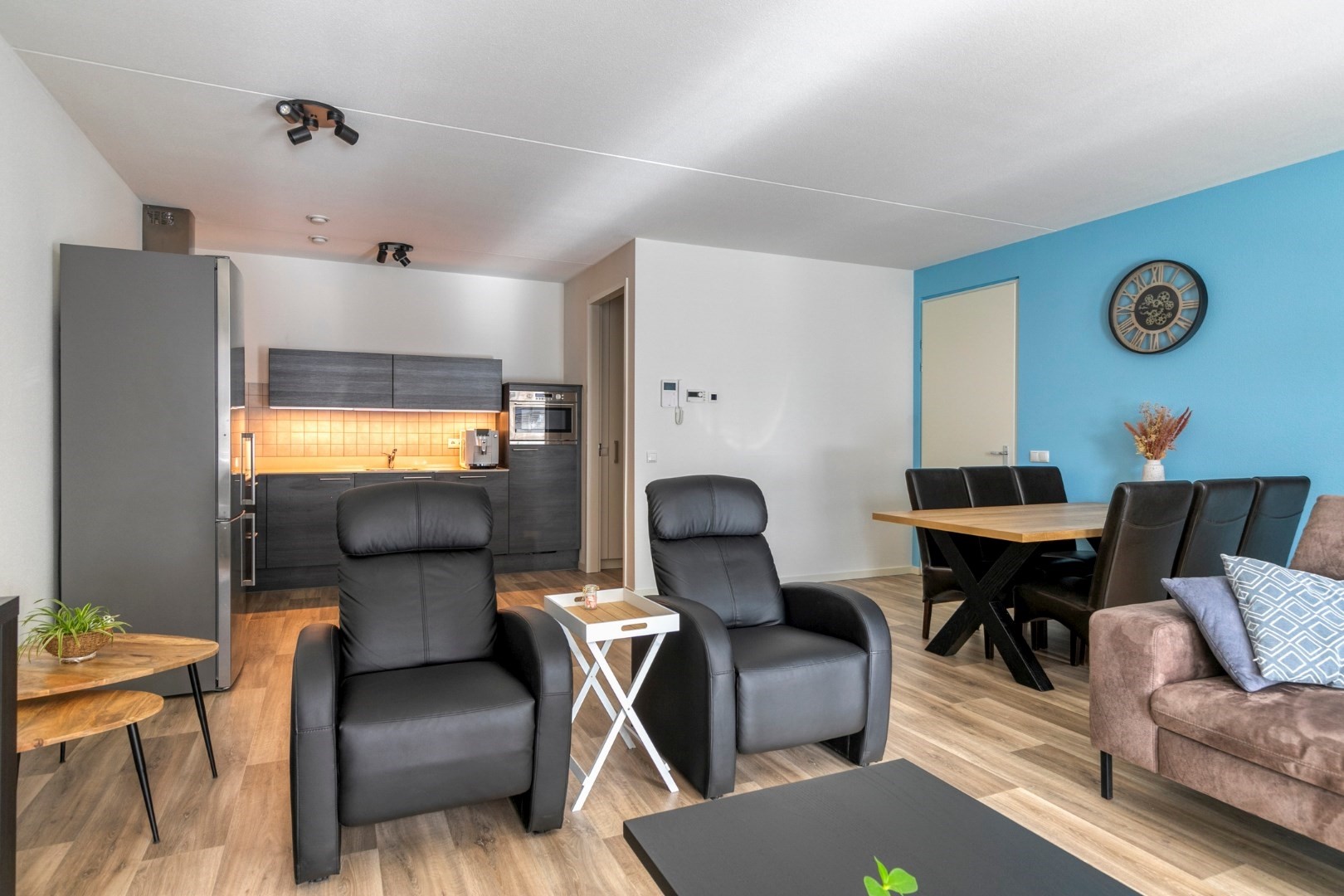 De woonkamer staat in open verbinding met de keuken. De keuken heeft ook een pvc vloer en een moderne keukeninrichting in een hoekopstelling. Met een inductiekookplaat, een RVS afzuigkap, een RVS combimagnetron, een koelkast en een vaatwasser.