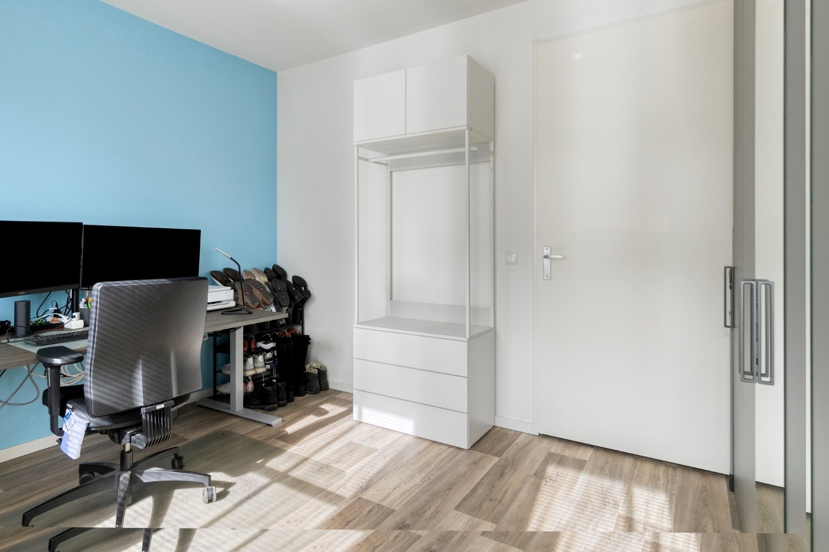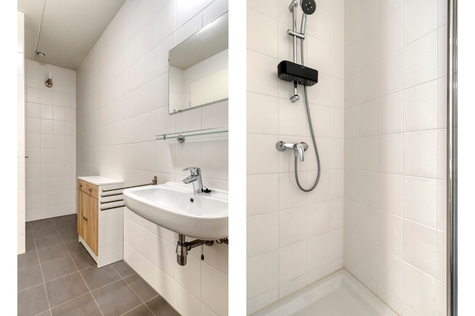 In de entree / gang liggen twee grotere slaapkamers, met een pvc vloer, aan de straatzijde. De volledig betegelde badkamer is voorzien van een douchecabine met thermostaatkraan en een wastafel.