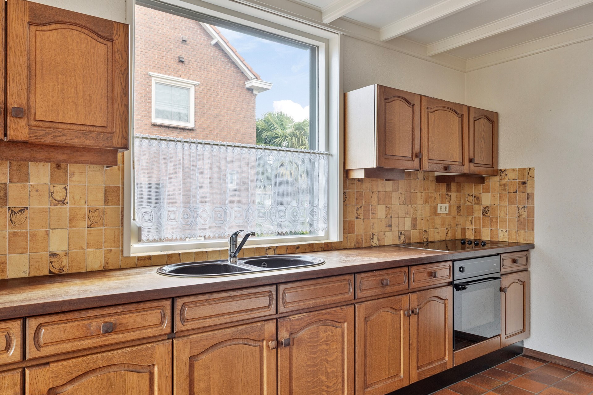 Vanuit de entree met een deur naar de eetkeuken. Met een tegelvloer, granol wanden en een sierbalken plafond. De eiken keukeninrichting is voorzien van een dubbele spoelbak, een keramische kookplaat, een afzuigkap, een elektrische oven en een koelkast. Zicht op de brede en diepe oprit via een houten raamkozijn met dubbele beglazing en een rolluik. Via een terrasdeur met dubbele beglazing en een rolluik toegang tot het overdekt terras en de tuin.