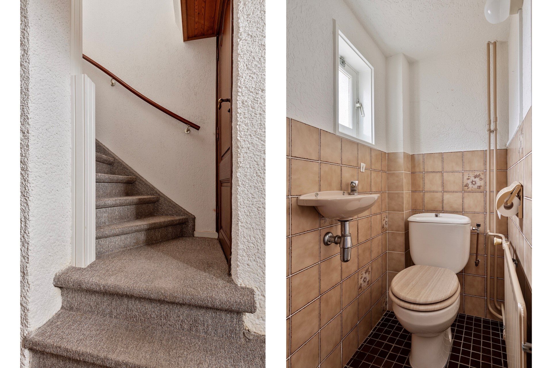 Via een trapje naar een bordes waar het toilet is gelegen. Gedeeltelijk betegeld toilet met een stucwerk plafond. Voorzien van een duoblok, een fonteintje en een raampje.