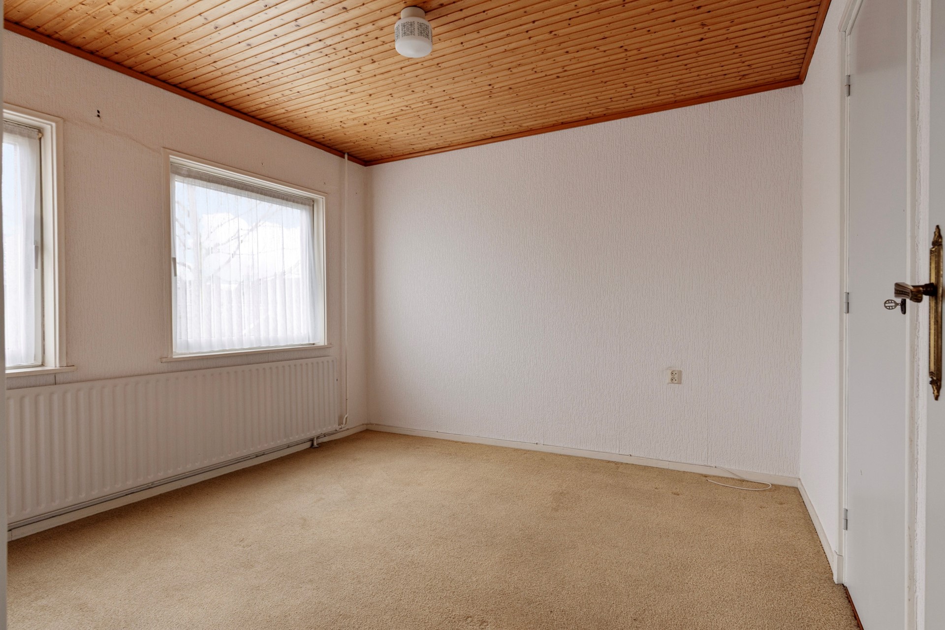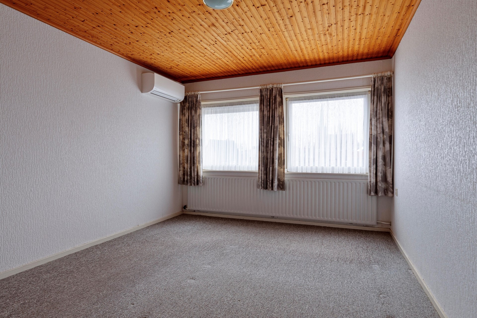 Slaapkamer, gelegen aan de voorzijde, met vloerbedekking, behangen wanden en een schroten plafond. Voorzien van een praktische muurkast en een tweetal kunststof raamkozijnen (draai-/kiep) met dubbele beglazing.