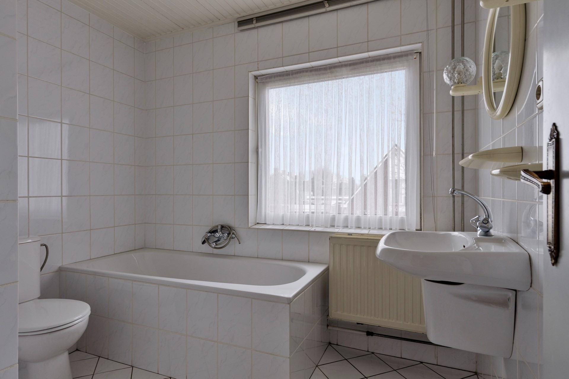 De badkamer heeft een lichte tegelvloer, volledig licht betegelde wanden en een schroten plafond. Voorzien van een 2e toilet, een ligbad en een wastafel. Natuurlijke ventilatie middels een kunststof raamkozijn (draai-/kiep) met dubbele beglazing.