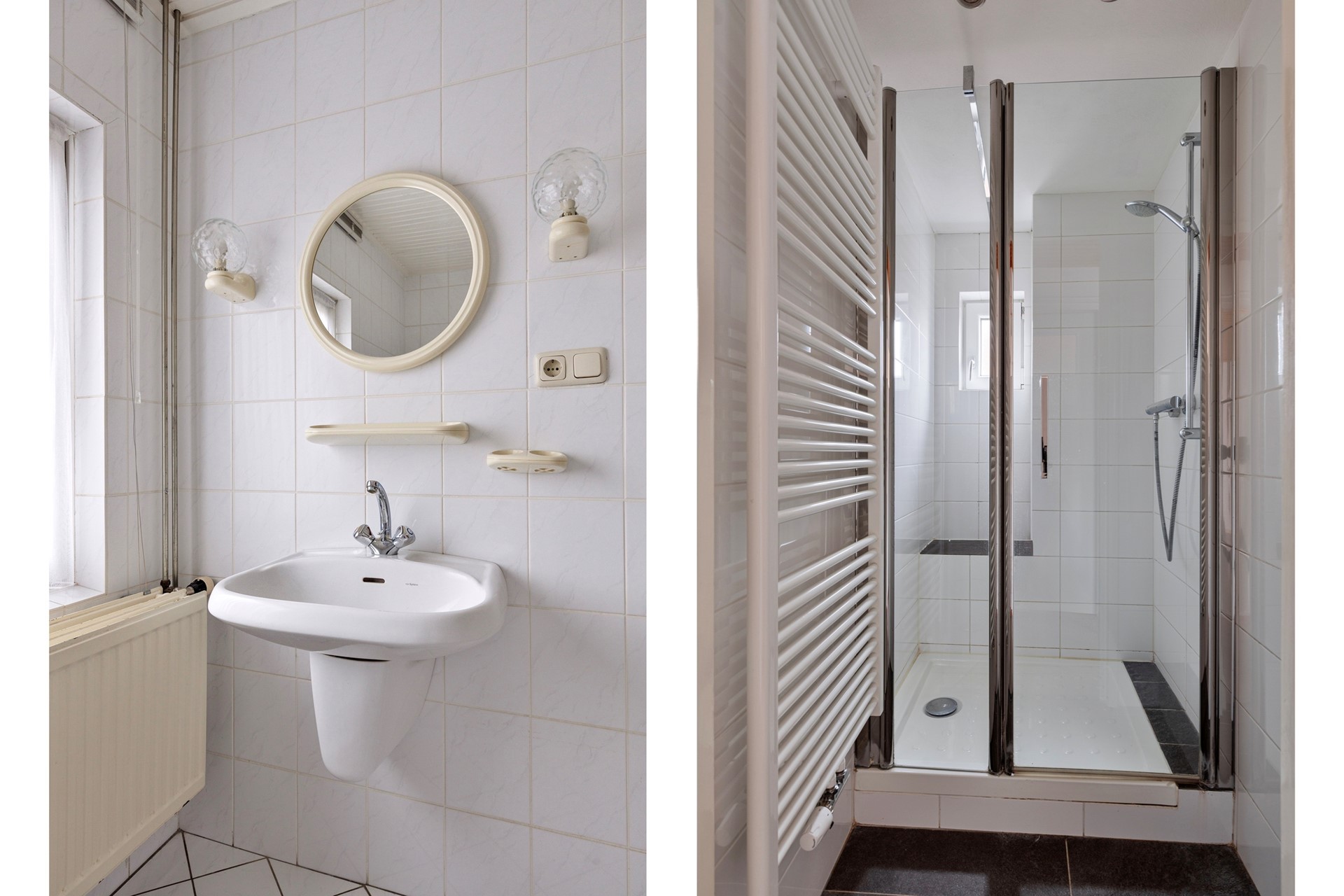 Op de overloop bevindt zich een separate, volledig betegelde doucheruimte met een stucwerk plafond met inbouwspots. Voorzien van een douchecabine met thermostaatkraan. Natuurlijke ventilatie middels een kunststof raamkozijn (draai-/kiep) met dubbele beglazing.