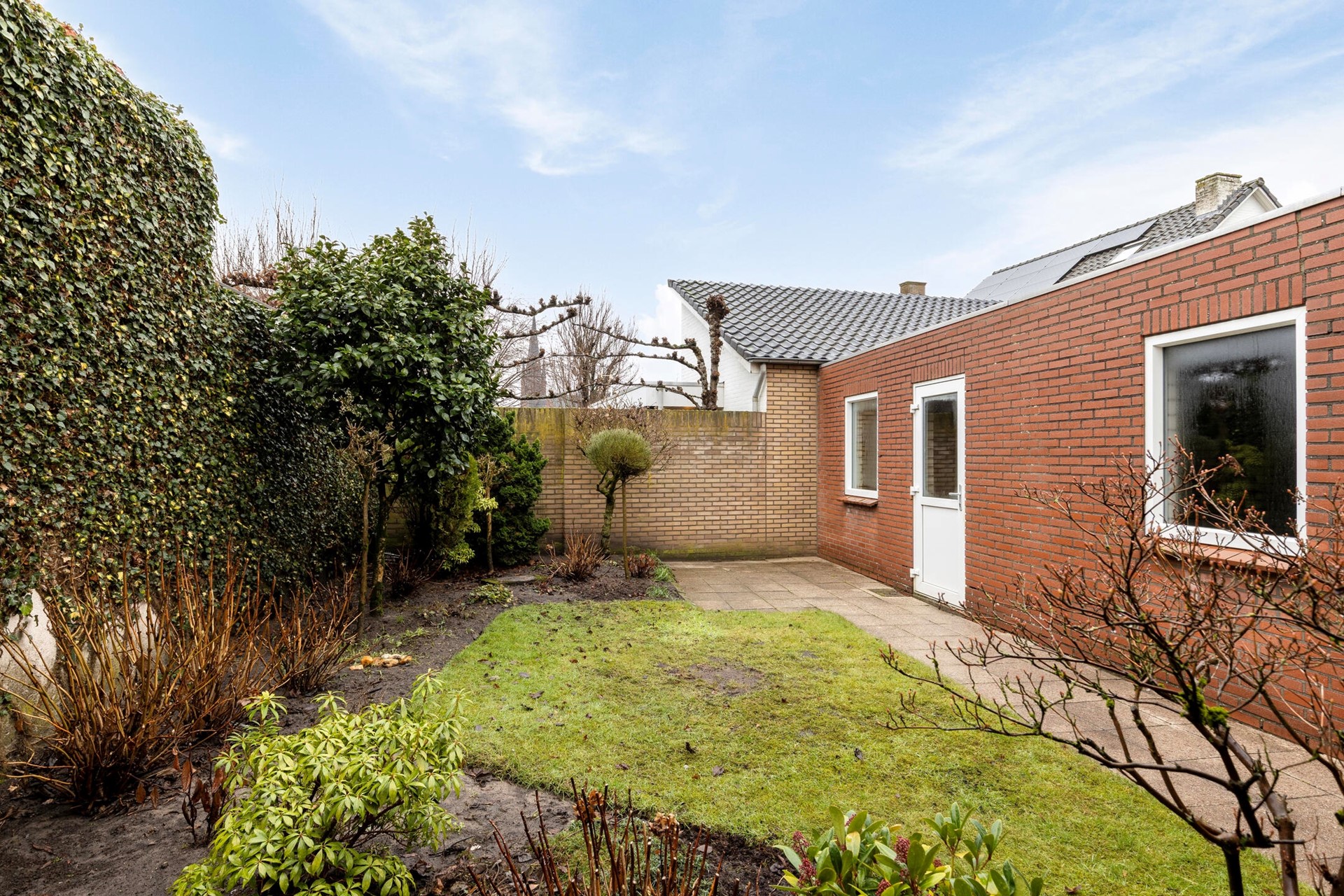 Direct aan de woning bevindt zich over de gehele breedte een riante terrasoverkapping van 20 m². Met een tegelvloer, een lichtkoepel en diverse inbouwspots. De tuin, met zicht op de kerktoren, heeft o.a. een gazon en aangeplante borders met volwassen beplanting.