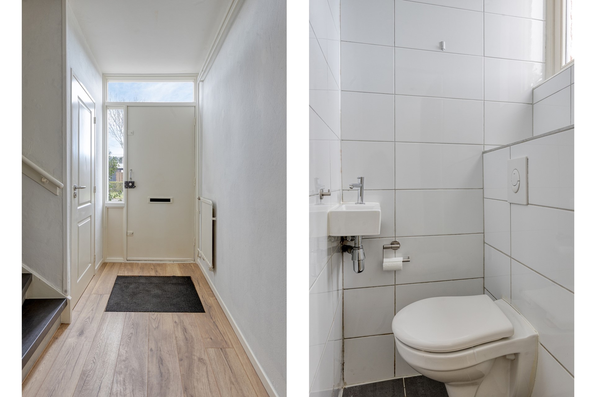 Het volledig licht betegelde toilet met een stucwerk plafond is voorzien van een wandcloset met opzetplateau en een fonteintje. Natuurlijke ventilatie middels een raampje met gematteerd glas.