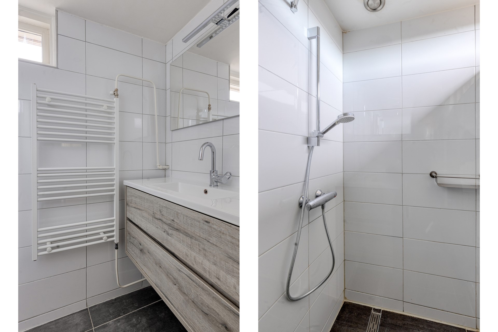 De volledig betegelde doucheruimte (ca. 2019), met een stucwerk plafond met inbouwspots, is voorzien van een inloopdouche met thermostaatkraan, een badmeubel met vaste wastafel en een spiegel en een designradiator. Natuurlijke ventilatie middels een houten raamkozijn met enkele beglazing.