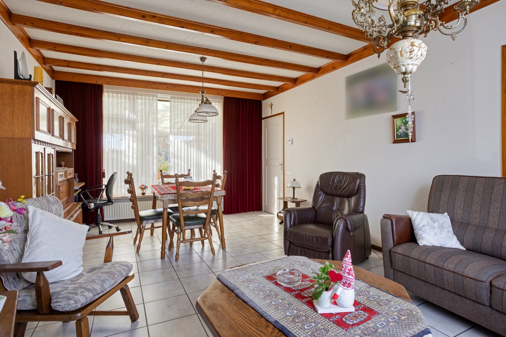 De woonkamer heeft een lichte tegelvloer met vloerverwarming, spachtelputz wanden en een sierbalkenplafond. Veel lichtinval door de diverse houten raamkozijnen met dubbele beglazing en rolluiken. Aan de achterzijde een mooi zicht op de royale tuin.