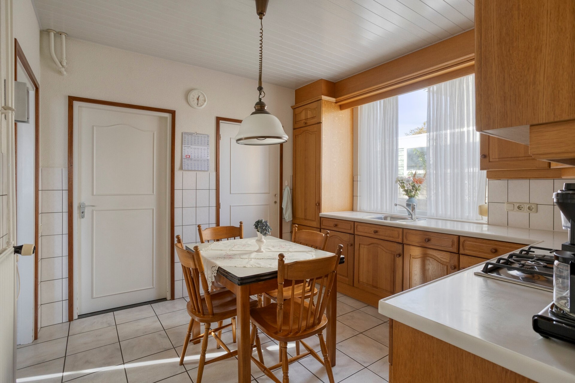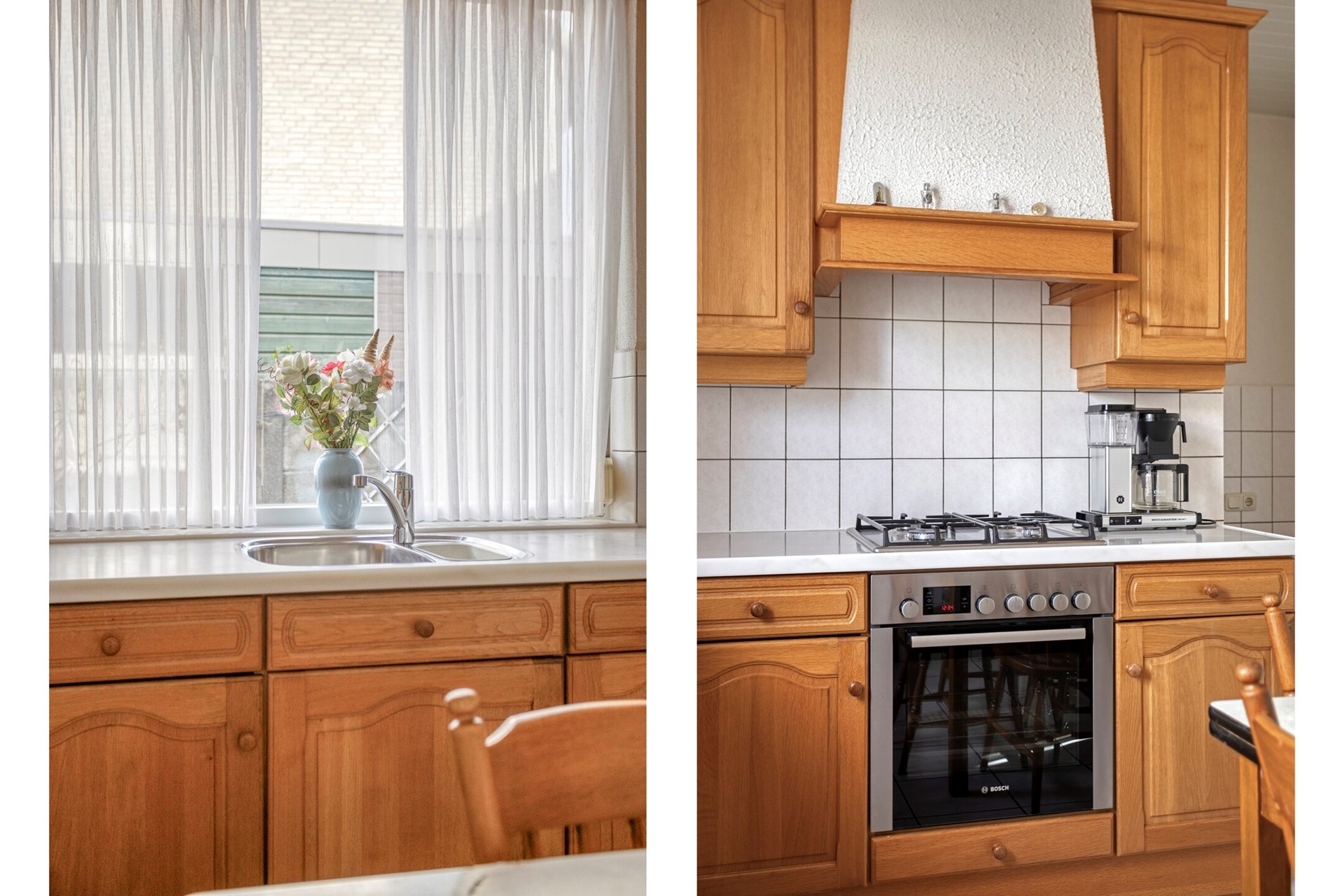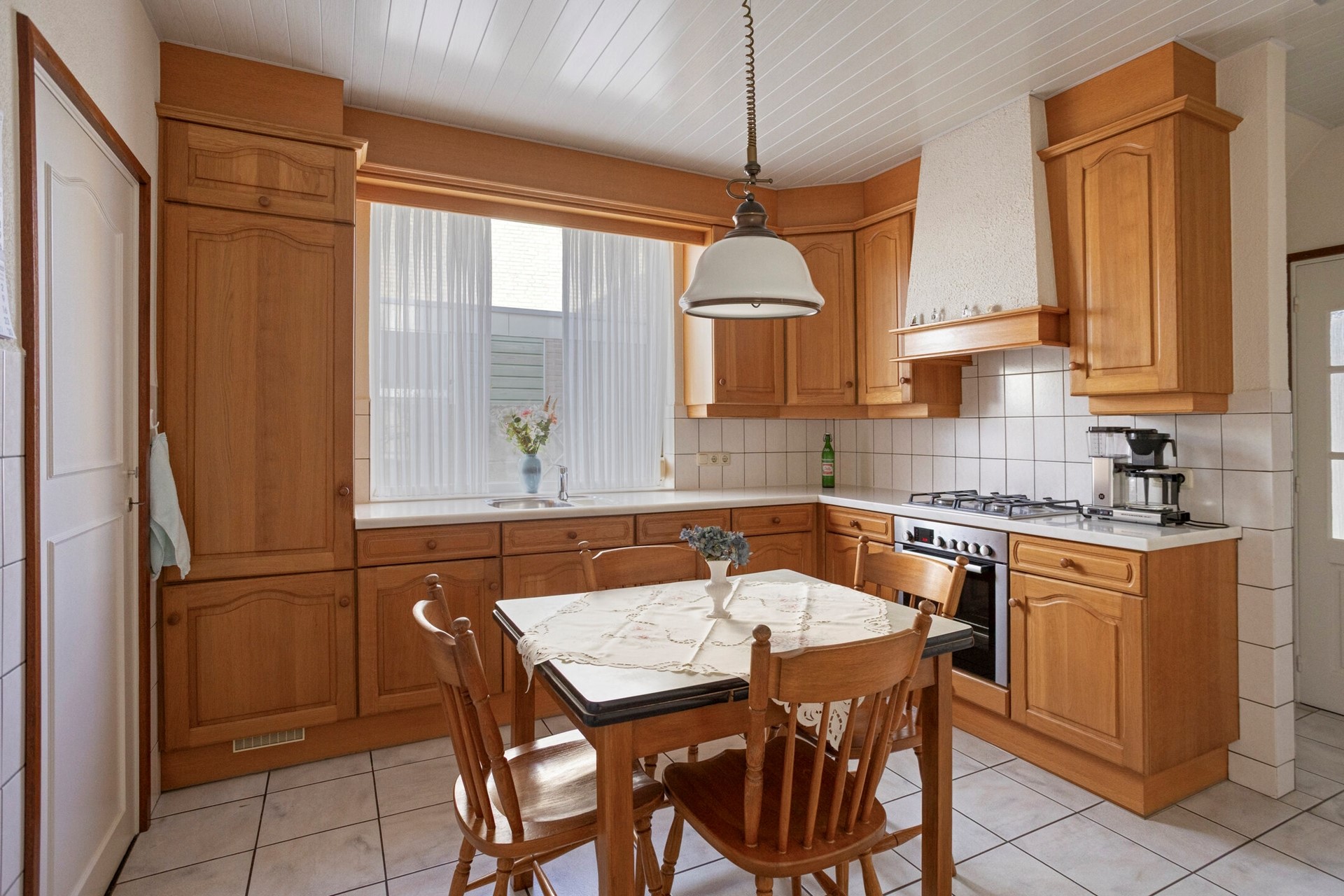 Vanuit de woonkamer met een deur naar de eetkeuken, met een lichte tegelvloer met vloerverwarming, gedeeltelijk betegelde wanden en een kunststof schroten plafond. De lichteiken keukeninrichting in een hoekopstelling is voorzien van een composiet aanrechtblad met RVS spoelbak met restbakje, een koelkast, een elektrische oven, een RVS gaskookplaat en een schouw afzuigkap. Met een praktische muurkast en een volledig betegelde, verdiepte kelder (4-treden) voorzien van een raampje. Vanuit de keuken via een houten raamkozijn met dubbele beglazing en een rolluik zicht op de oprit.