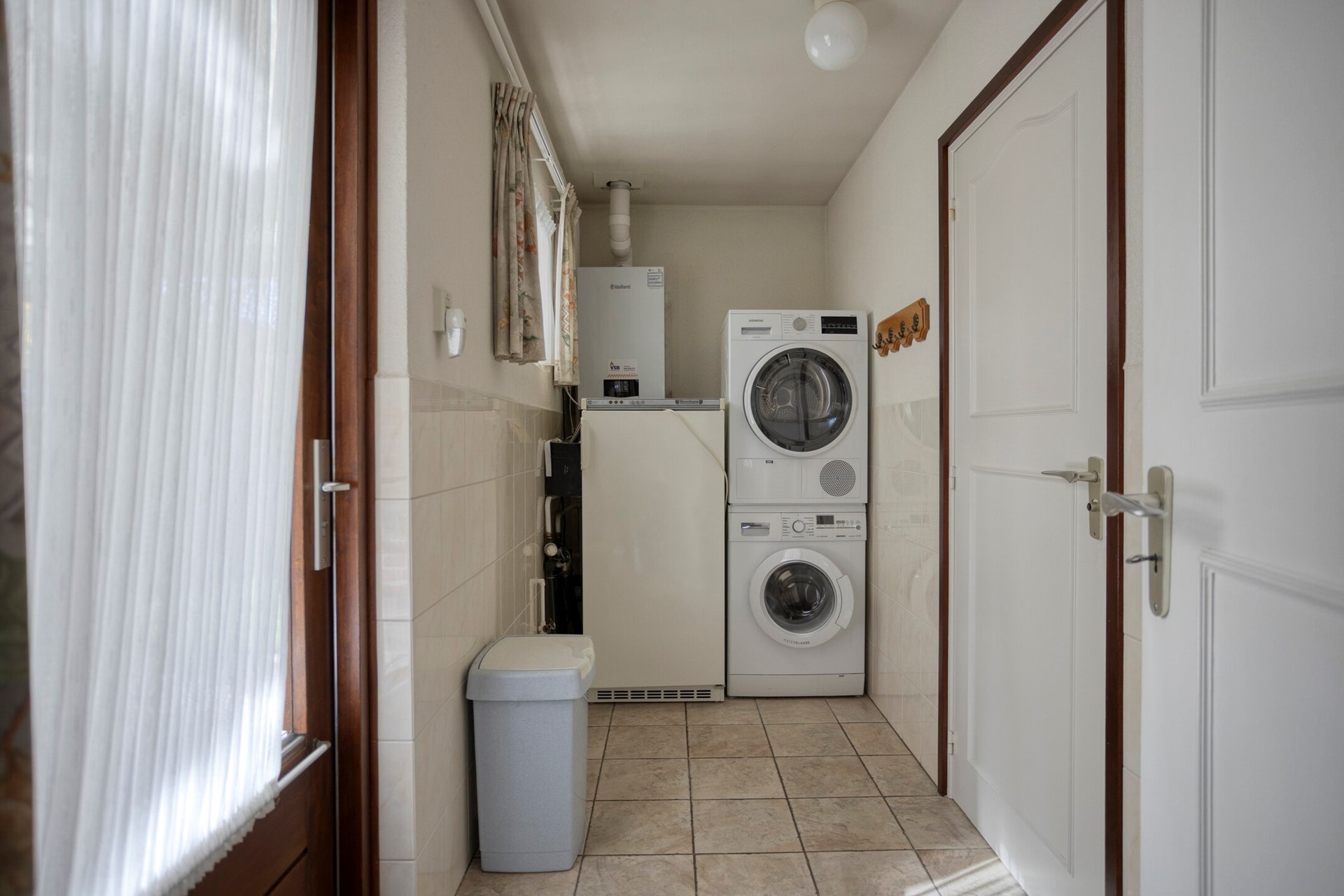 Via een deur naar de bijkeuken, met toegang tot het toilet, de badkamer en het overdekte terras. De bijkeuken heeft een tegelvloer, gedeeltelijk betegelde wanden en een stucwerk plafond. Hier bevinden zich de unit van de vloerverwarming, de Vaillant HR combiketel (2023) en de aansluitingen voor de wasapparatuur. Verder een praktische diepe muurkast. De (2e) badkamer heeft een tegelvloer, volledig betegelde wanden en een stucwerk plafond met inbouwspots. Voorzien van een wandcloset met opzetplateau, een wastafel en een inloopdouche met thermostaatkraan. Natuurlijke ventilatie middels een stalen raampje.