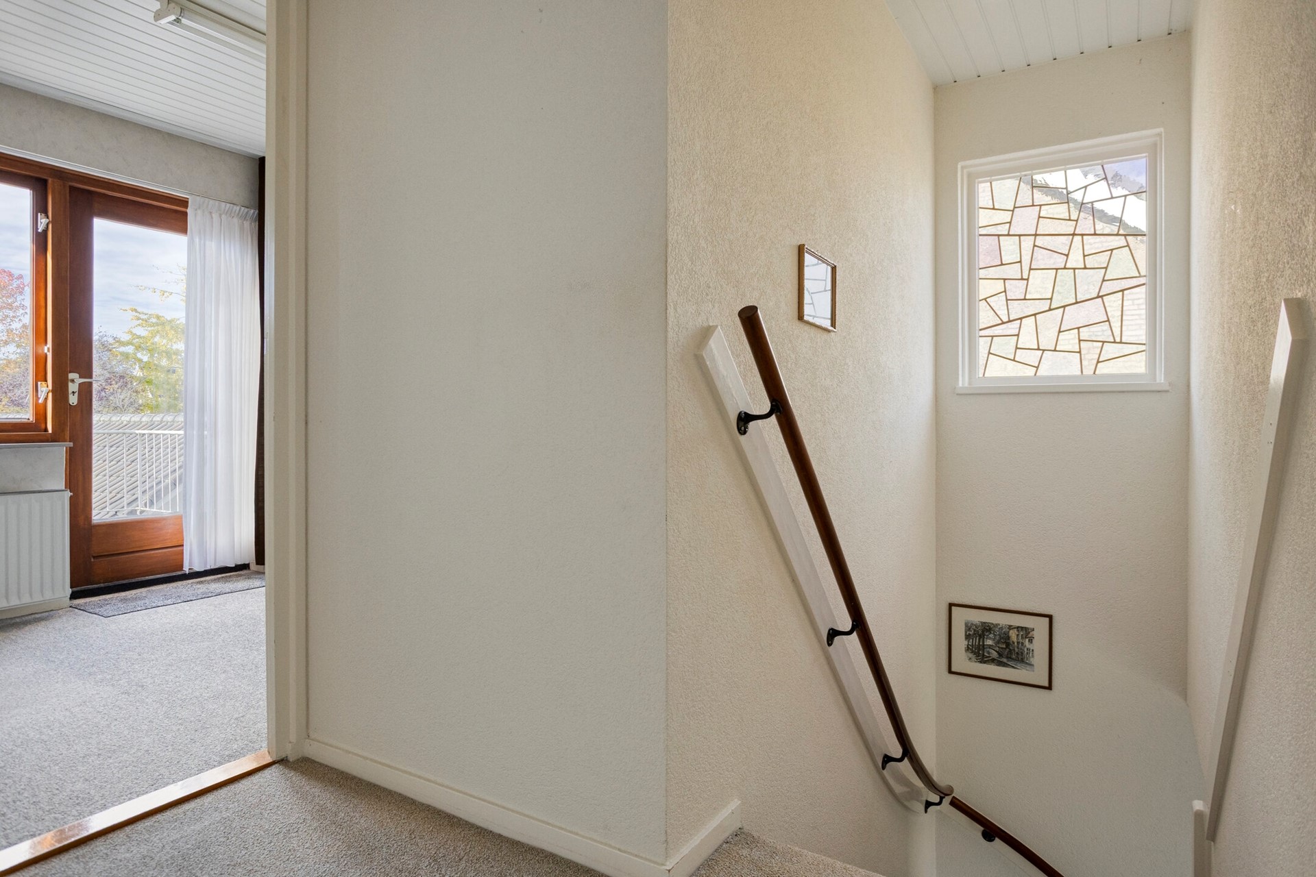 Vanuit de entree met een, met vloerbedekking beklede, trap naar de 1e verdieping. Overloop met vloerbedekking, spachtelputz wanden en een kunststof schroten plafond. Daglicht is aanwezig middels een glas-in-lood raam in de zijgevel.