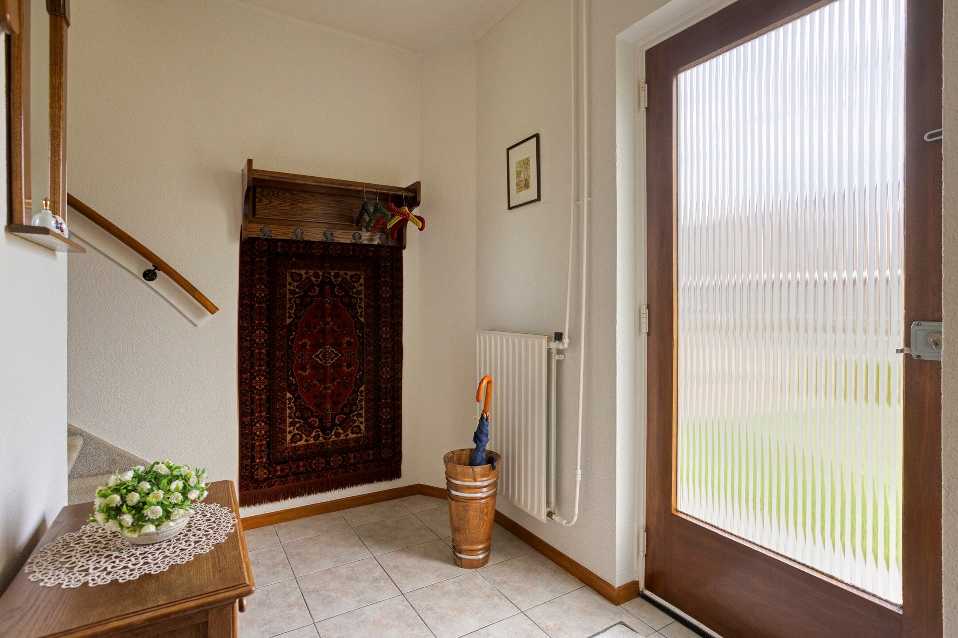 Toegang tot de woning via een hardhouten voordeur met enkel bewerkt glas. Ruime entree met een lichte tegelvloer, spachtelputz wanden en een stucwerk plafond. Meterkast (5 groepen + aardlekschakelaar). Vanuit de entree met een deur naar de woonkamer en eetkeuken.
