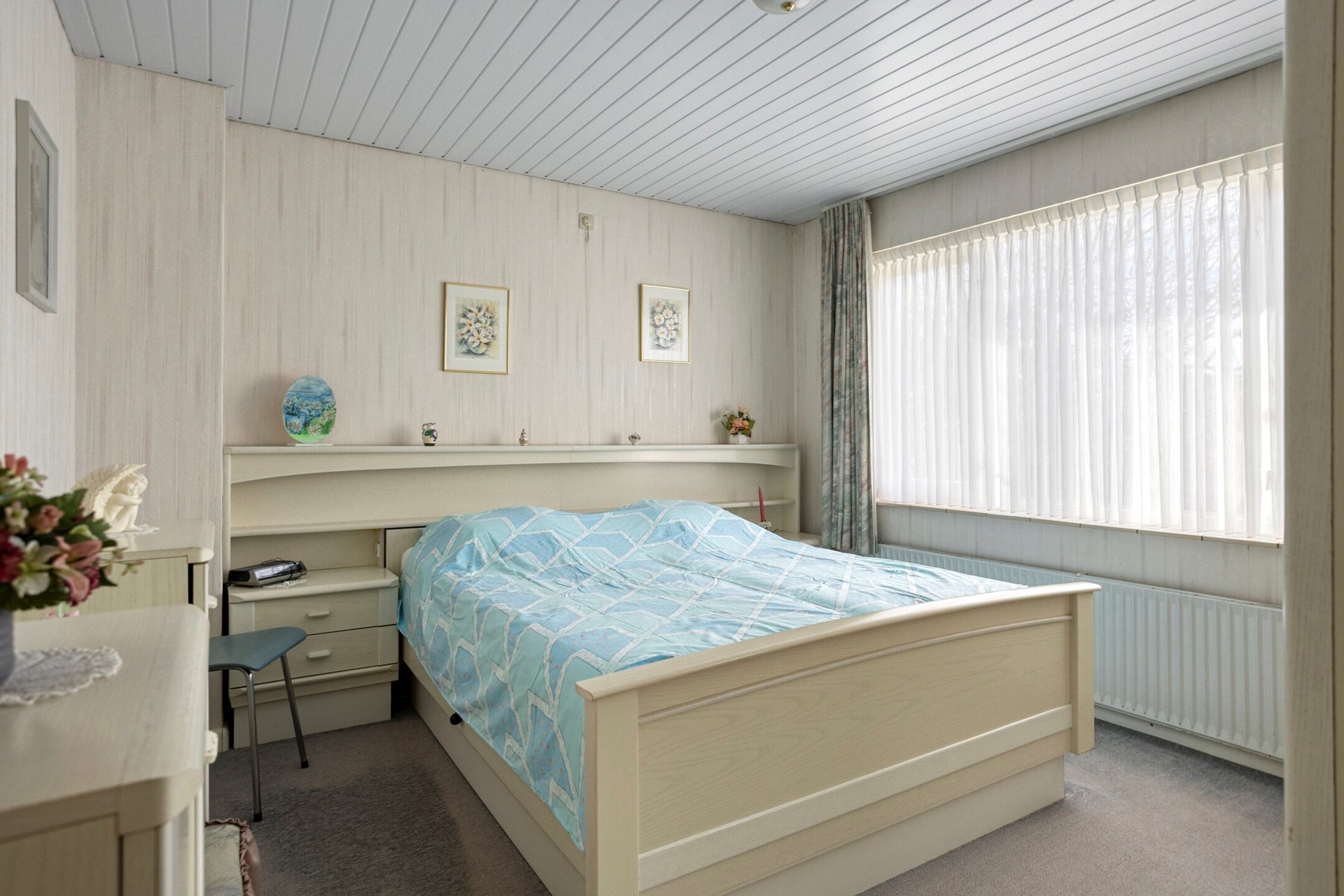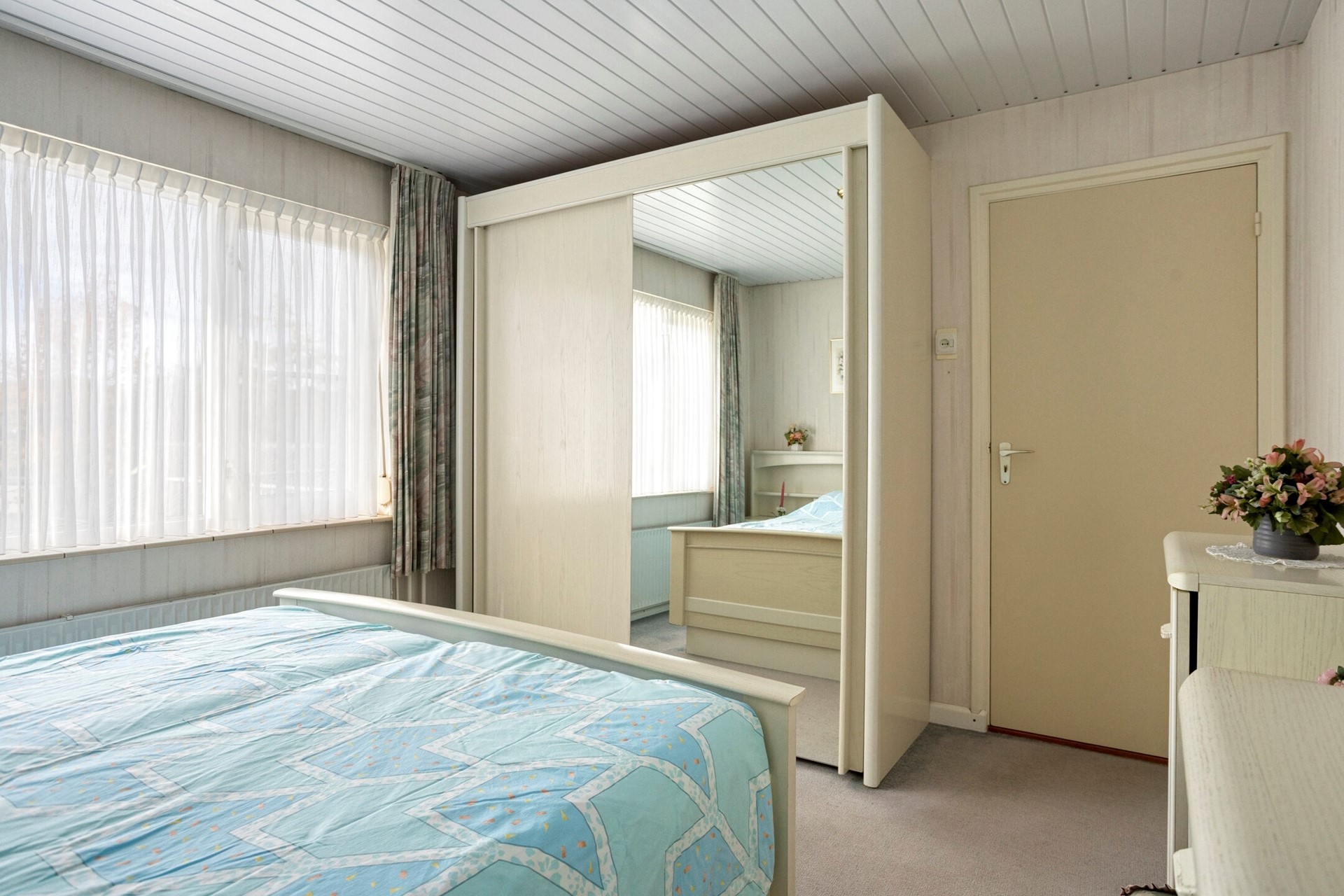 Drie ruime slaapkamers met vloerbedekking, behangen wanden en een kunststof schroten plafond. Een slaapkamer aan de achterzijde heeft een vaste wastafel en een 2-tal muurkasten. Vanuit deze slaapkamer, via een houten balkondeur met enkele beglazing en een rolluik, toegang tot het platte dak van de aanbouw, met een balustrade. De voorste slaapkamer is voorzien van een hardhouten kozijn met dubbele beglazing en een rolluik. De grootste slaapkamer aan de achterzijde is voorzien van houten raamkozijn met enkele beglazing en een rolluik.